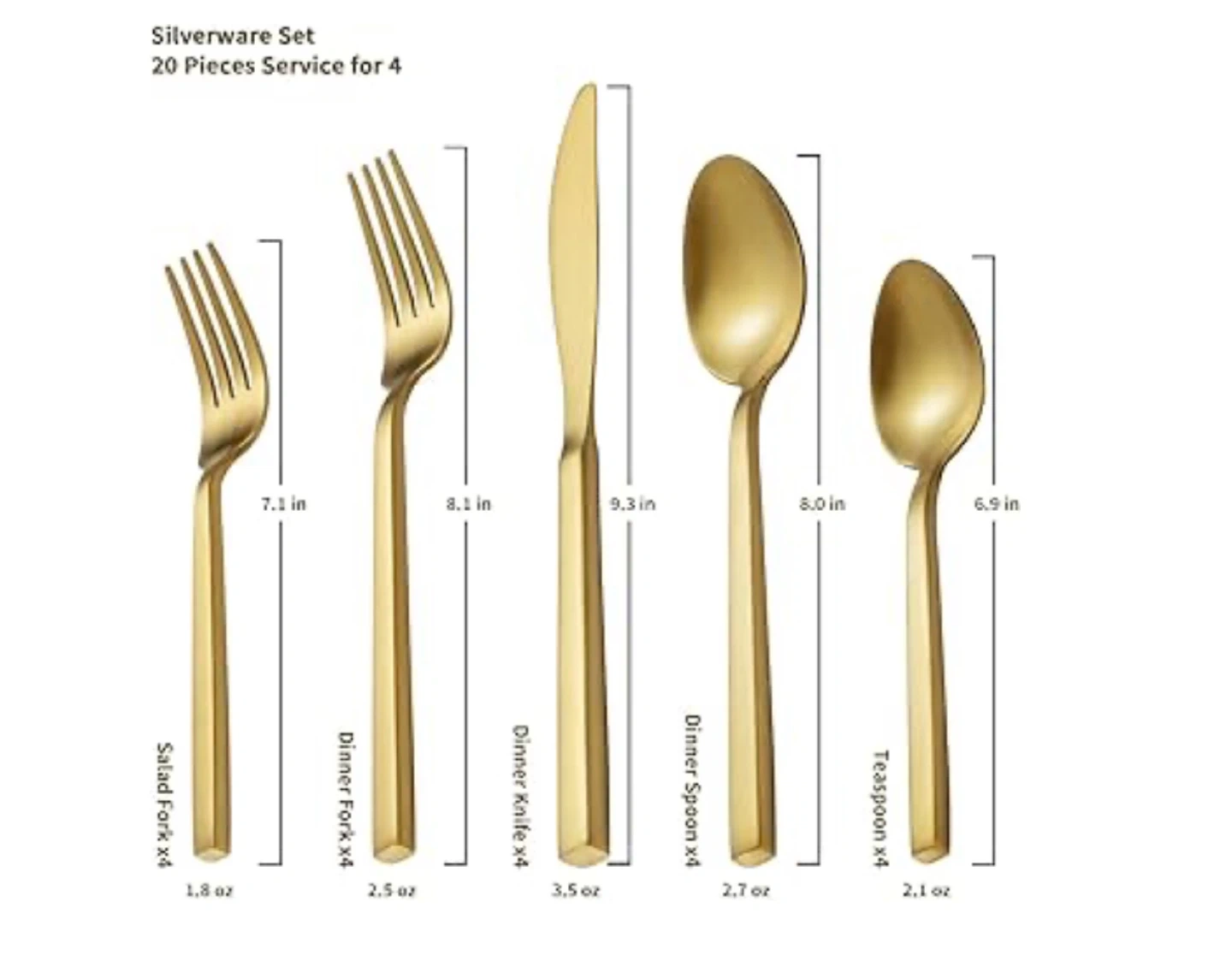 Service for 4 Silverware Set: 20pcs flatware set includes 4 dinner knife, 4 dinner fork, 4 dinner spoon, 3 salad fork and 4 teaspoon. It can service of 8 people.Suitable for kitchen, restaurant, event, and everyday meals