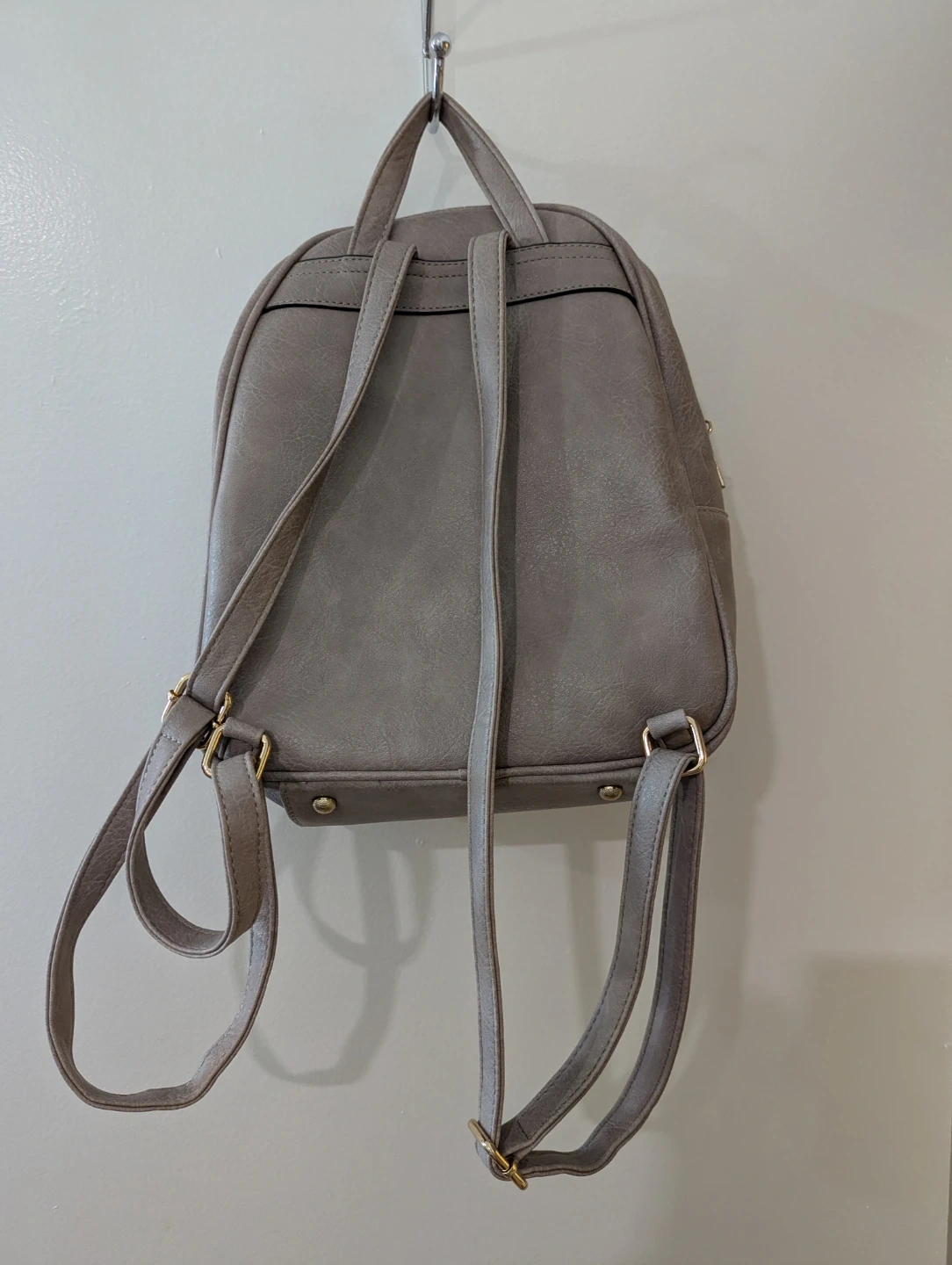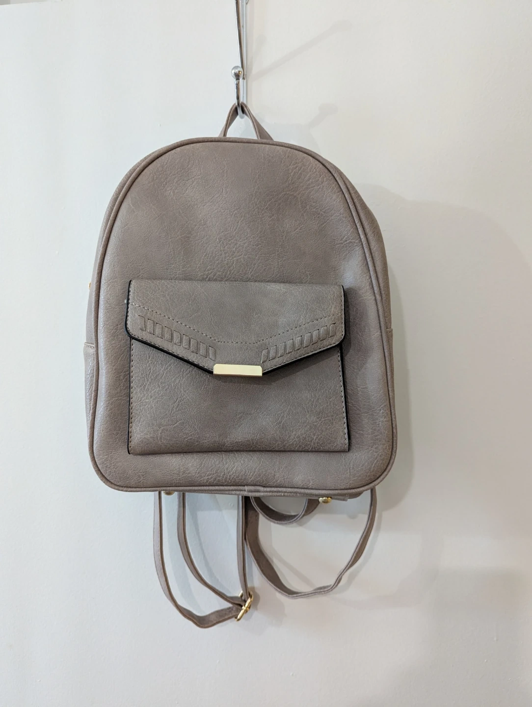 A stylish taupe mini backpack. It has a front flap pocket with a gold buckle accent and adjustable shoulder straps. This bag is perfect for everyday use or travel!