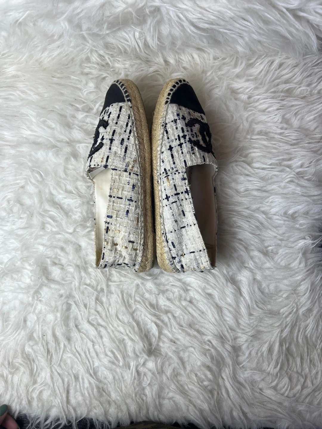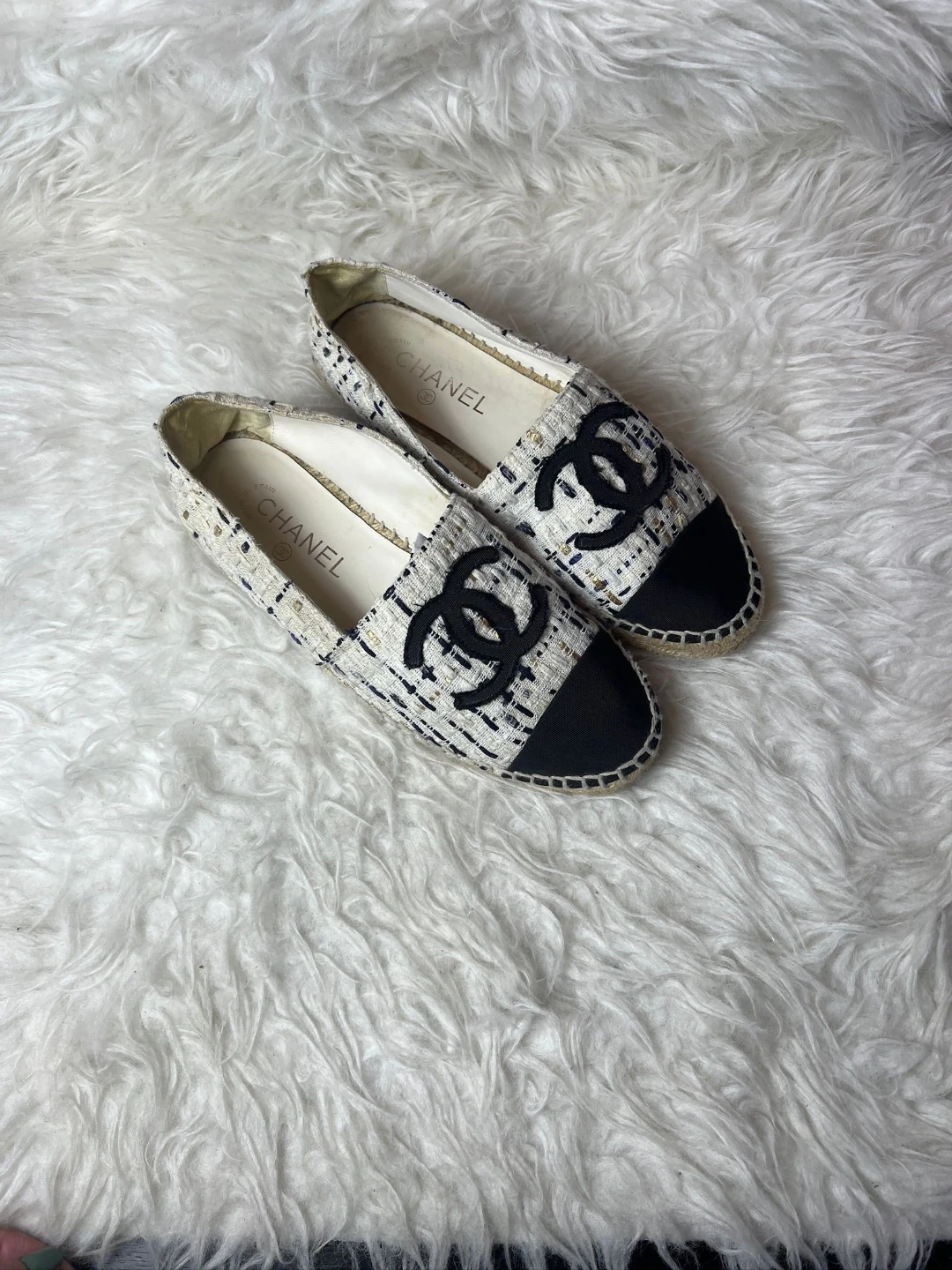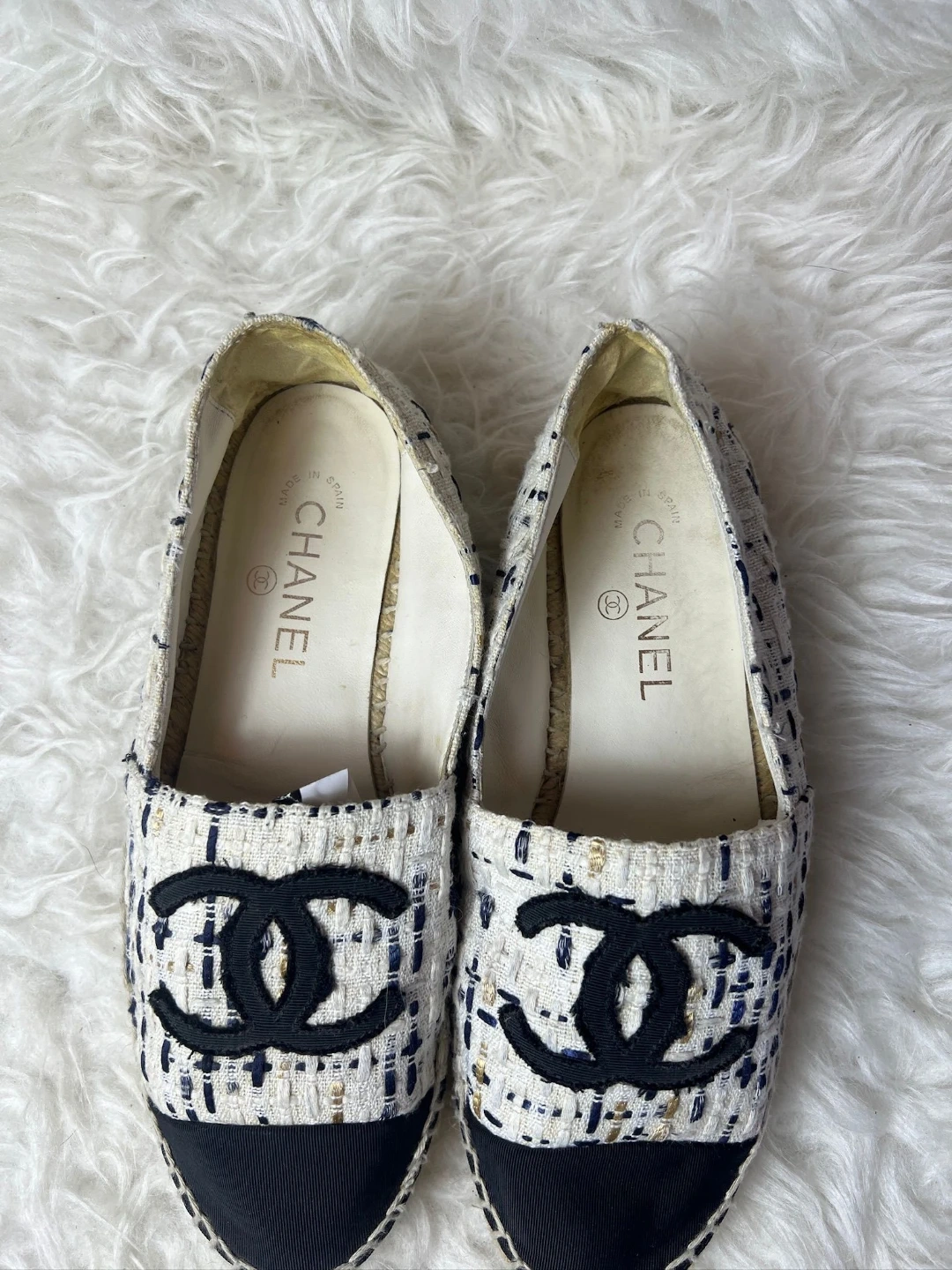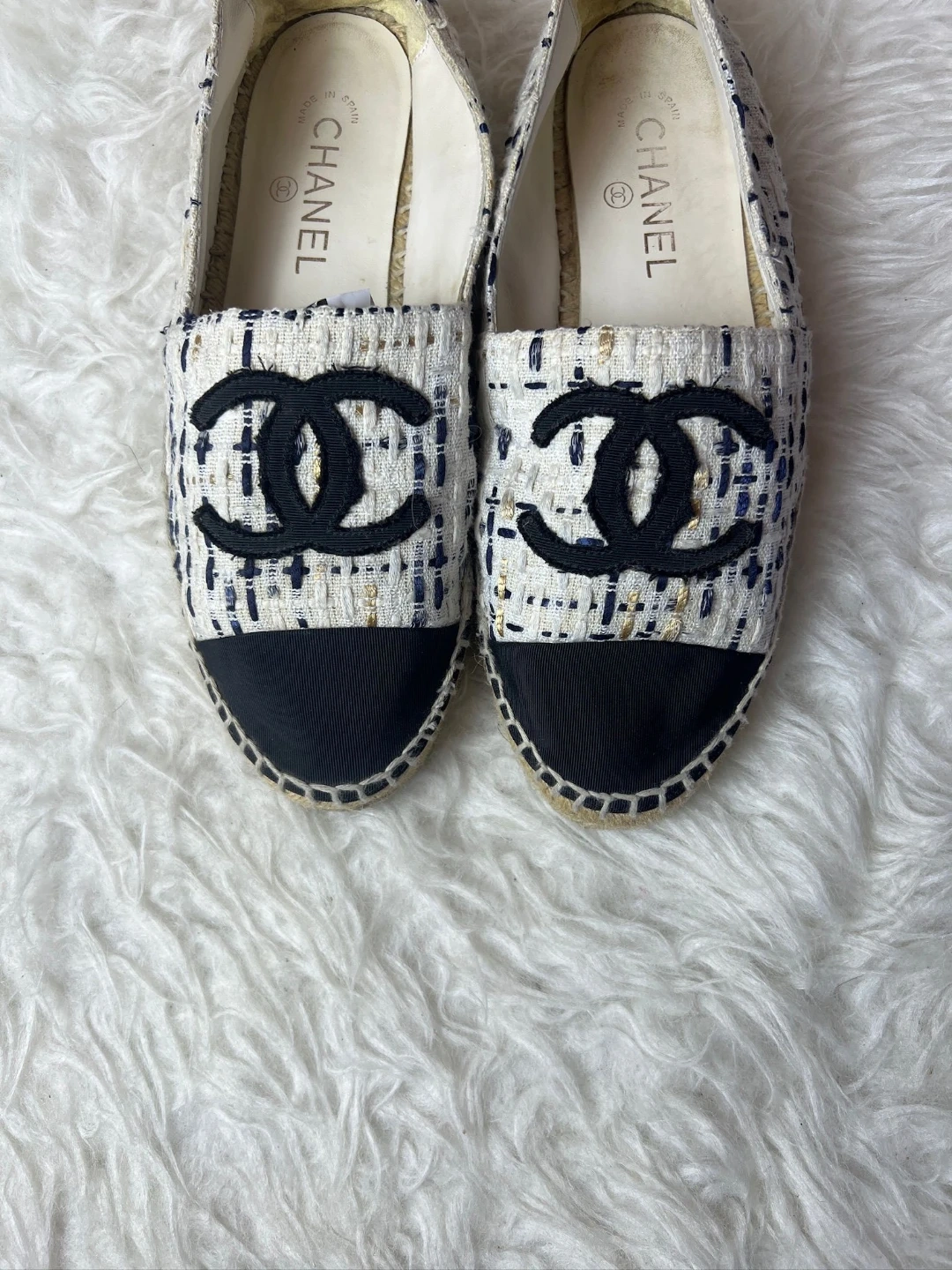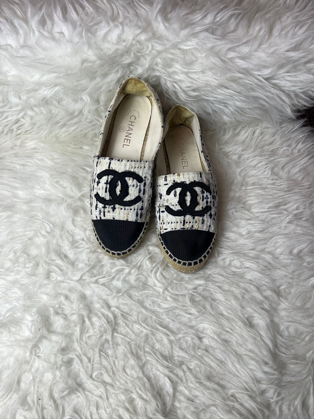 Authentic Chanel espadrilles crafted in classic white tweed with black cap toe and signature CC logo. A timeless summer essential that blends comfort with Parisian luxury.