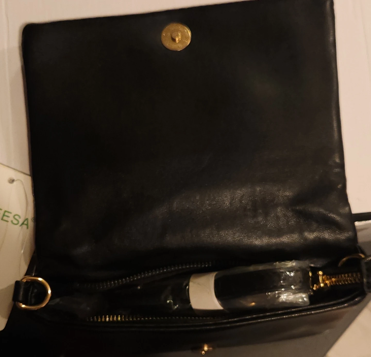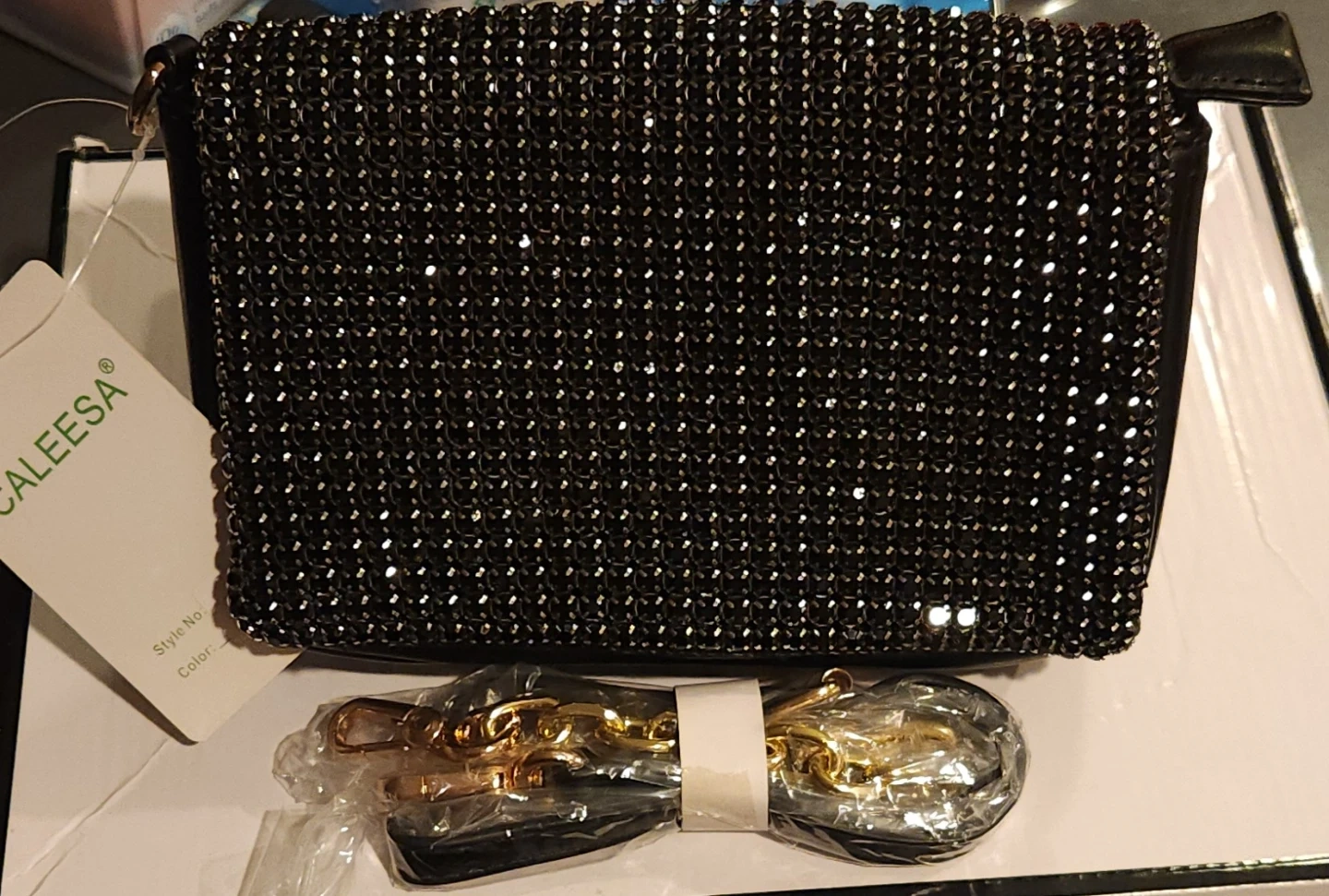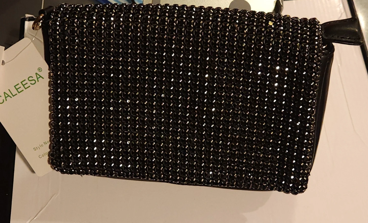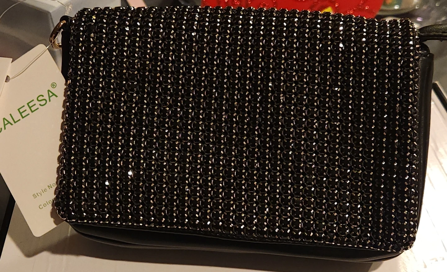 This Caleesa clutch purse is adorned with sparkling black embellishments and features a sleek black interior. It comes with a detachable gold chain strap for versatile wear. The vegan leather exterior offers a stylish look.