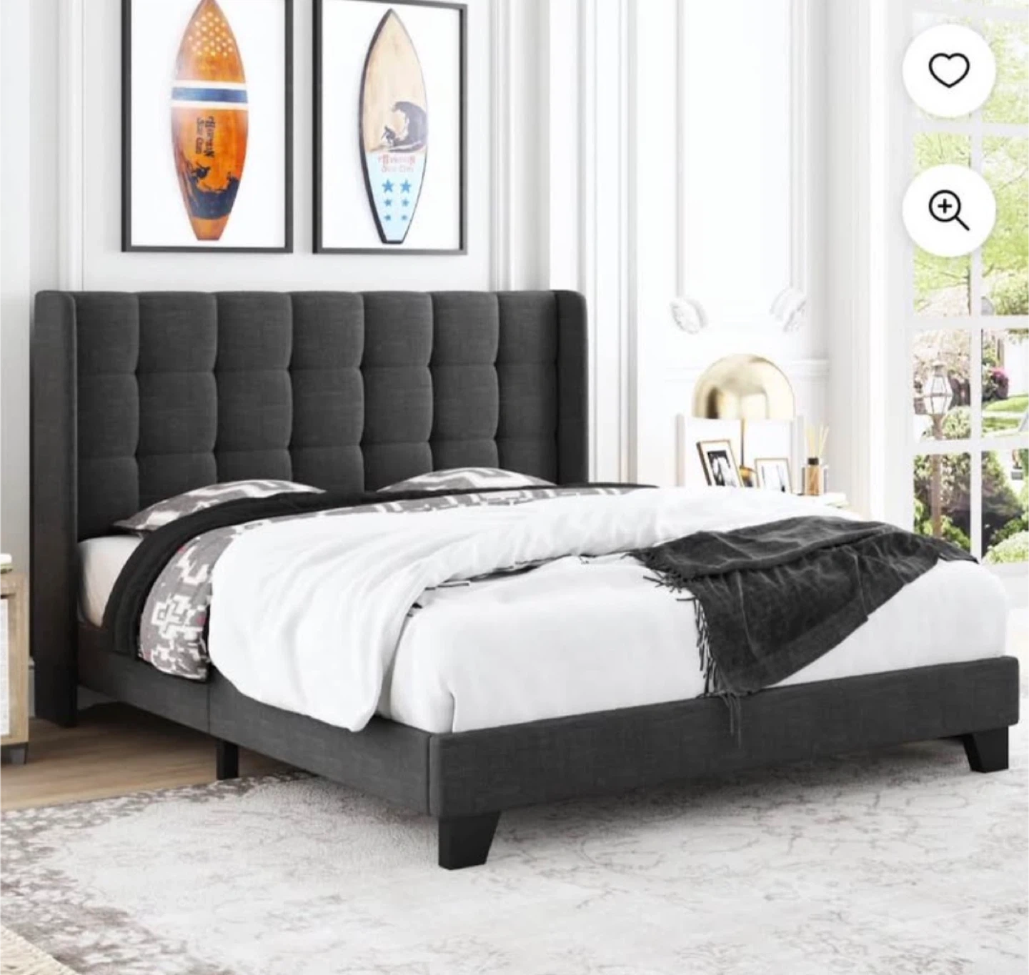 This full bed frame features a stylish tufted headboard with a dark gray upholstered finish. It's a sturdy and modern addition to any bedroom! The frame includes wooden slats for mattress support.