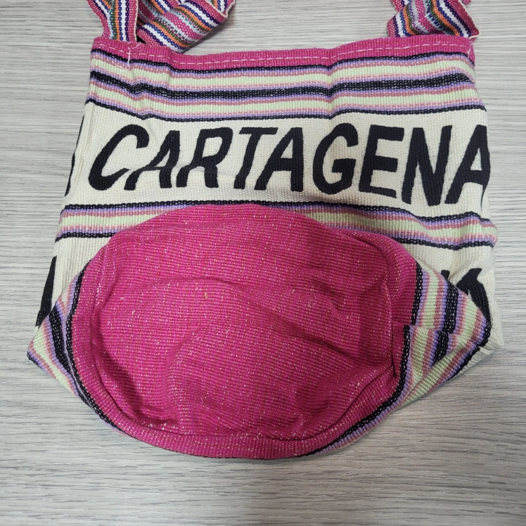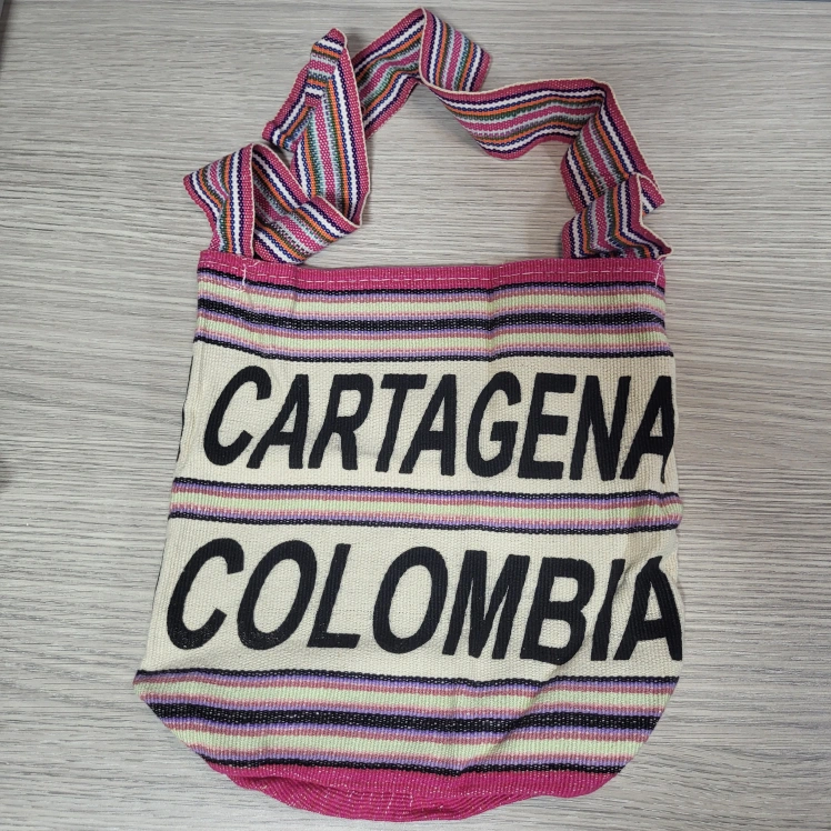 Introducing a fun and vibrant crossbody mochila bag from Colombia. This colorful cream background bag is perfect for travel or casual occasions, with a 21" colorful pink hues crossbody strap handle. The exterior is made of durable polyester material, adorned with Cartagena Colombia in black bold letters making it a great addition to your beach or as a Christmas present. The new bag is medium-sized and has a cylinder shape, making it easy to carry around. Features an open closure and it's very lightweight. Measuring approximately 11"Wx12"H