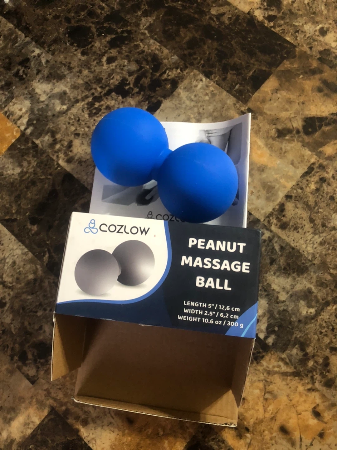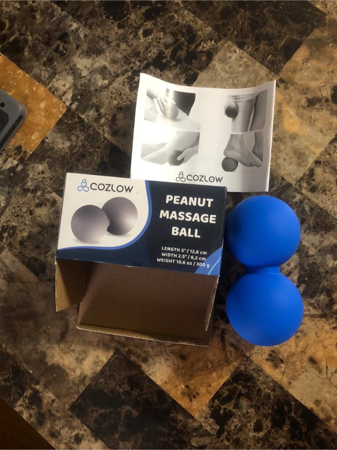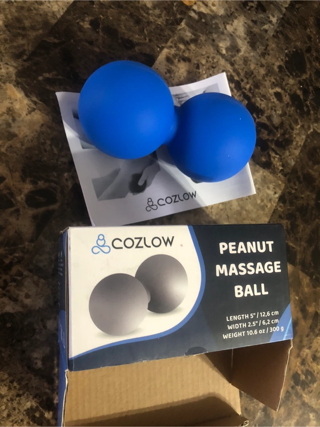 Selling a Cozlow peanut massage ball in cobalt blue! It's a trigger point mobility ball designed for physical therapy. The ball is compact and portable, great for on-the-go use. It's 5" long and 2.5" wide, and weighs 10.6 oz. The box is included!