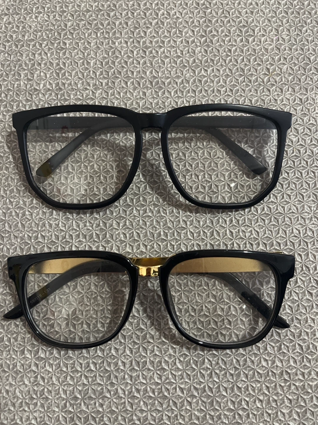 Two pairs of black eyeglasses frames. One pair is solid black, and the other has gold accent details. Lens width is 56mm and bridge width is 18mm.