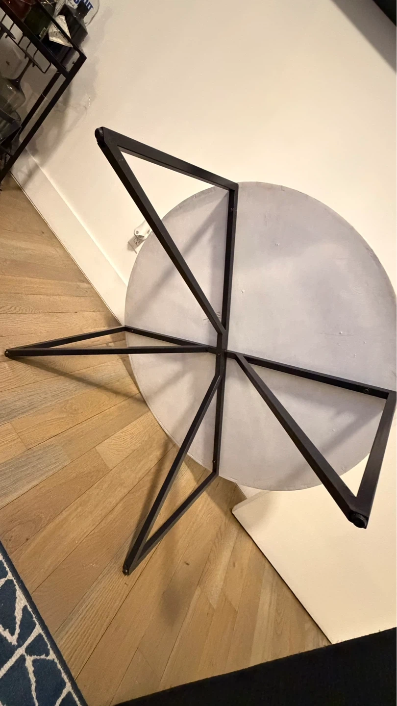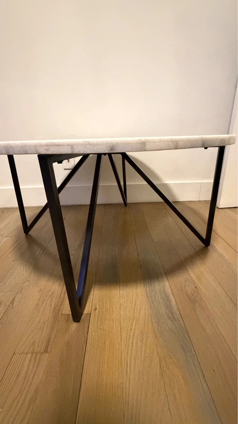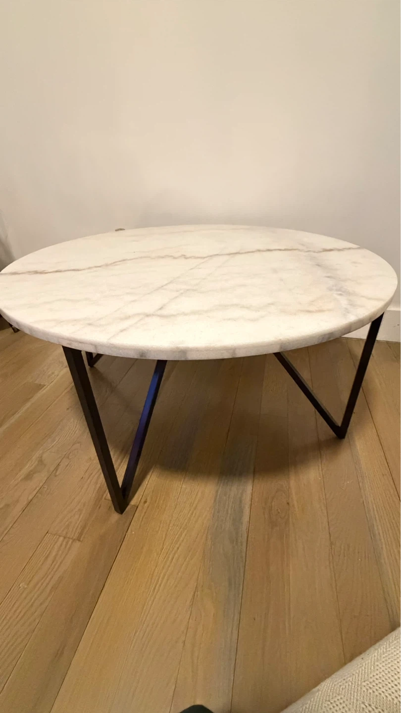 This round coffee table features a genuine marble top with elegant veining. It's supported by a sturdy black metal geometric base. The natural stone top has beautiful variations.