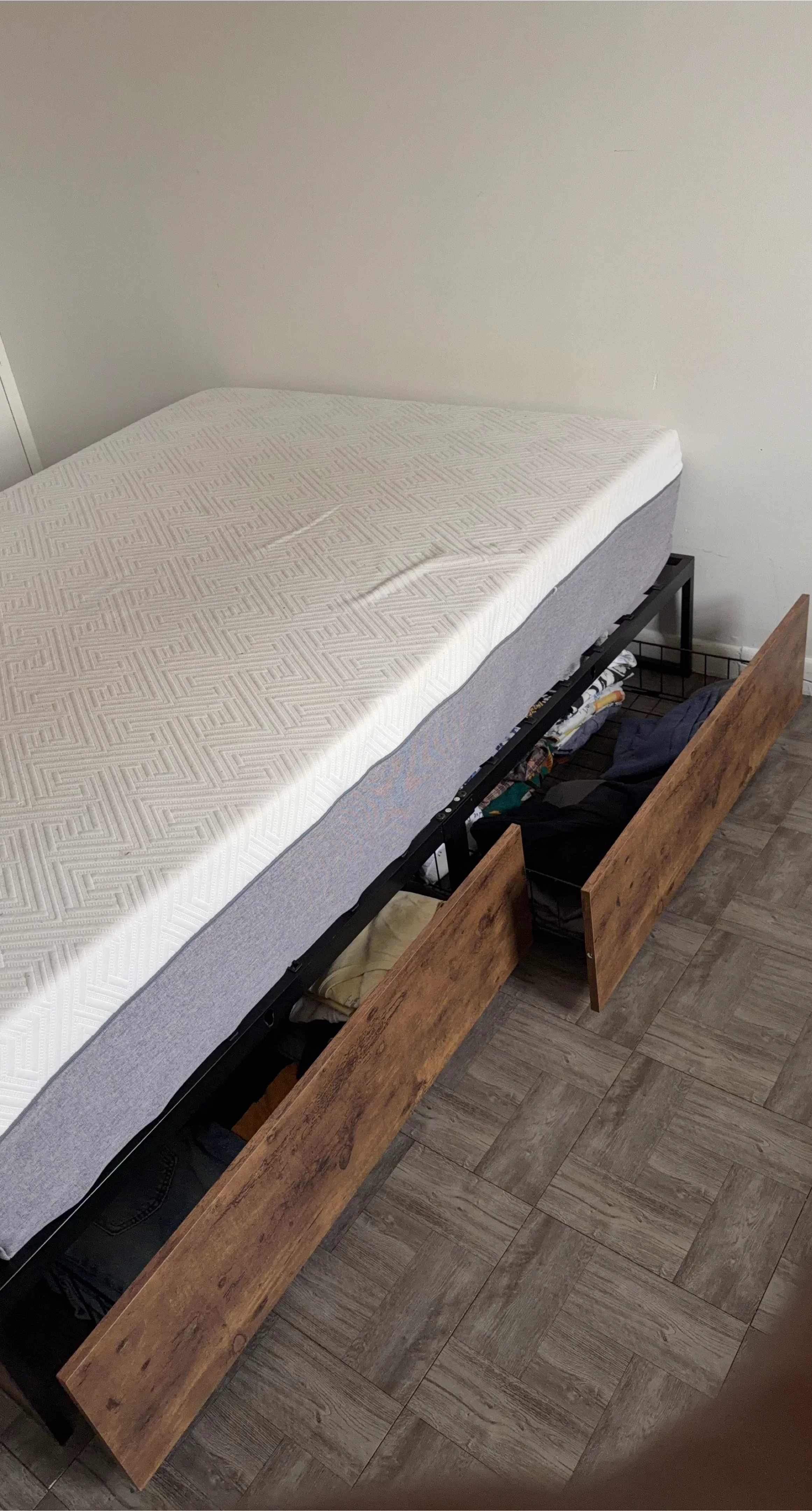 This queen size bed frame offers practical storage with built-in drawers. The wooden drawer fronts provide a rustic aesthetic. Metal construction ensures durability.