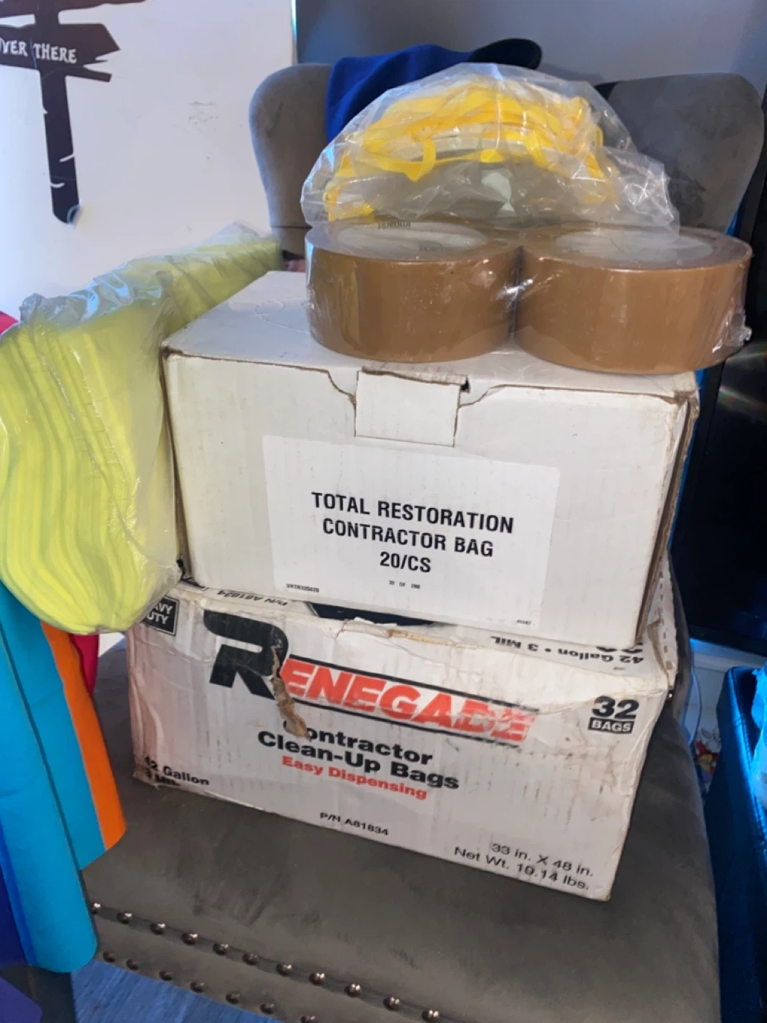 Includes Renegade 33 in. x 48 in. contractor bags, 20 count box of Total Restoration contractor bags, and two rolls of packing tape. Also includes yellow disposable masks and a yellow roll of plastic sheeting.