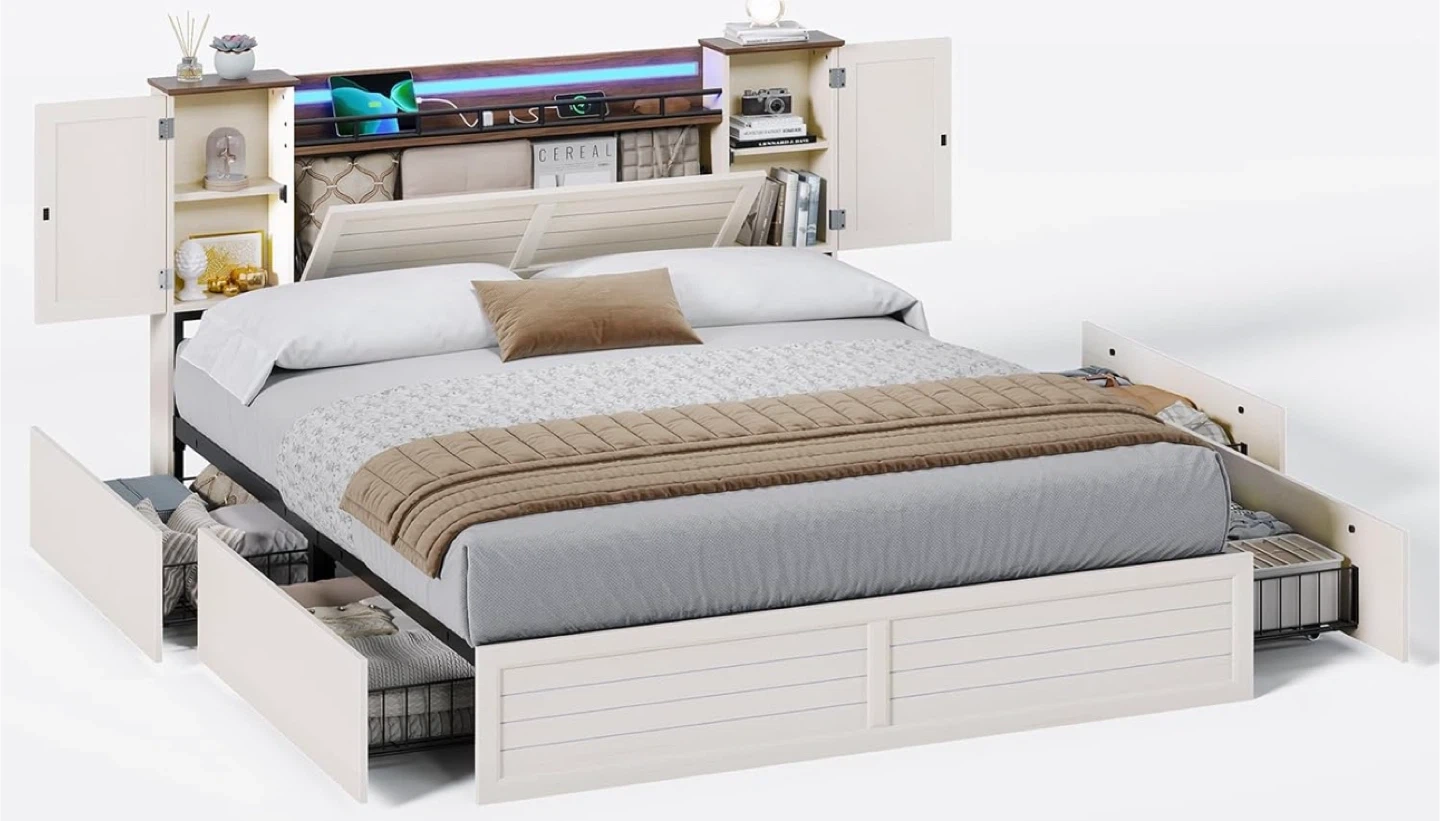 Full size bed frame features four large storage drawers with smooth wheels and a locking system. The headboard includes built-in shelves, cubbies, and music sync RGB LED lights controlled via remote or app. It's a space-saving solution with ample storage. Still in box.
