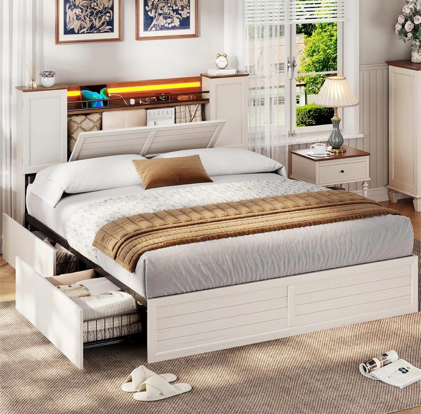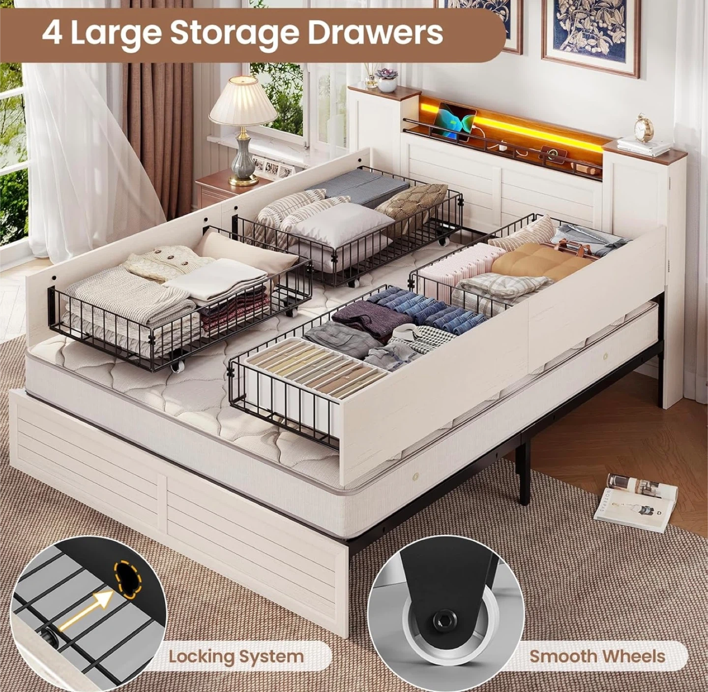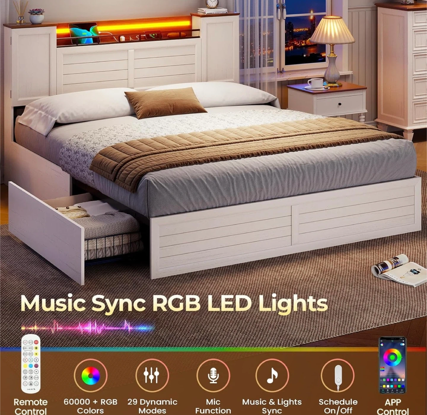 White Storage Bed Frame with Headboard and LED Lights