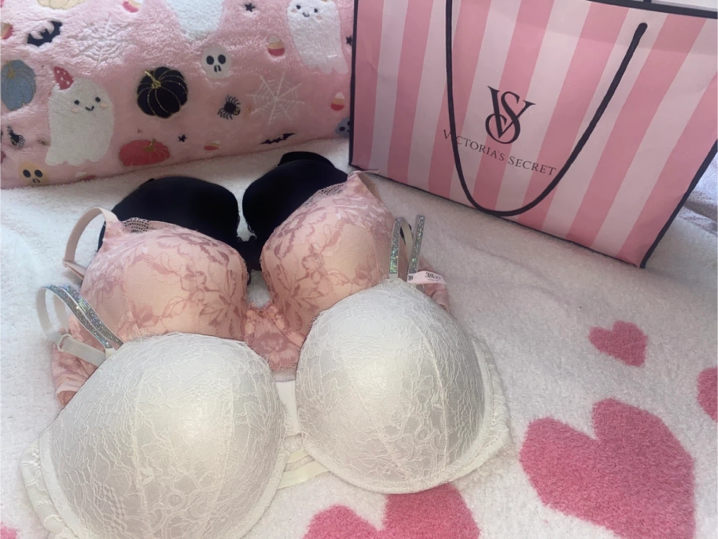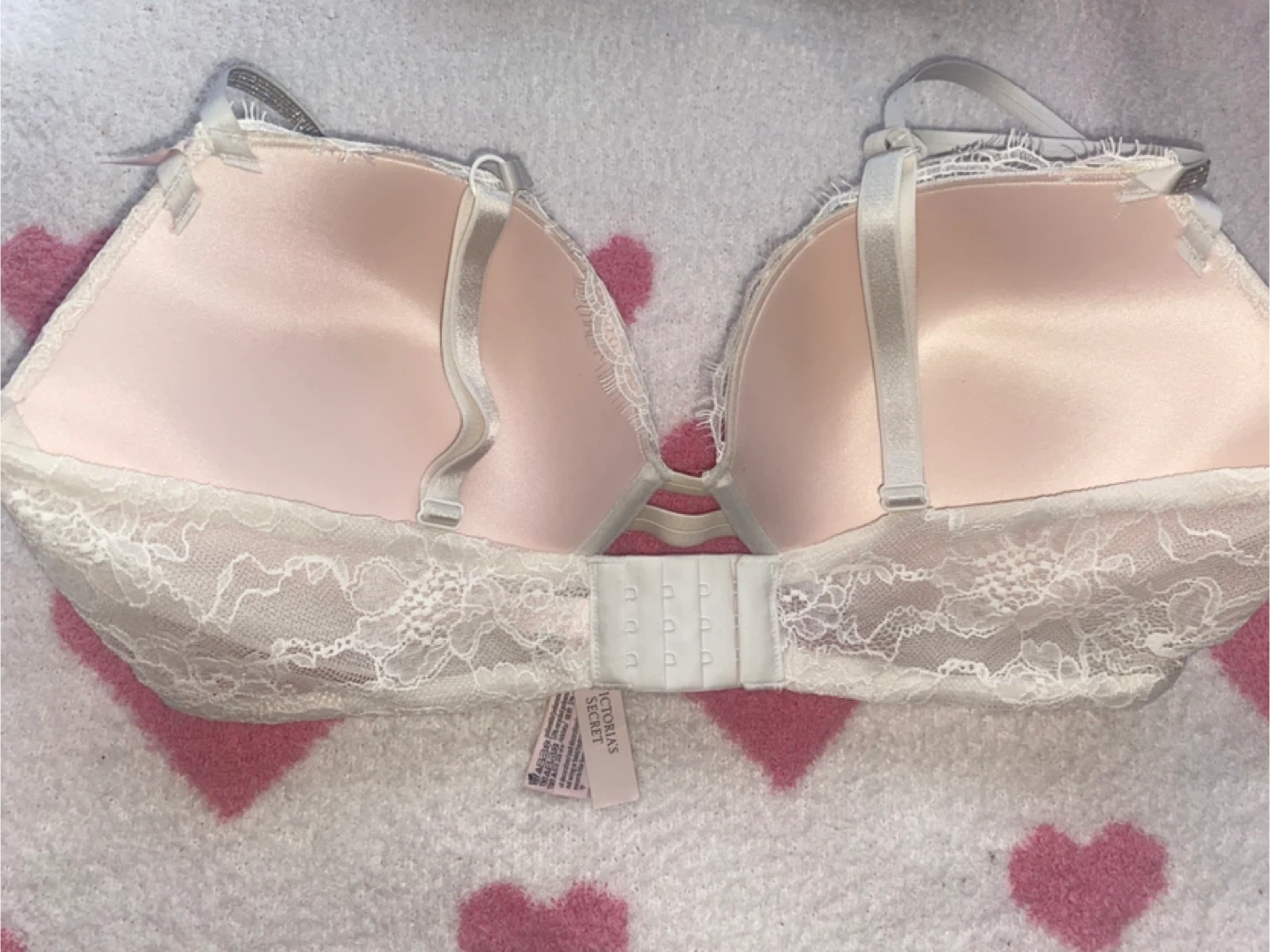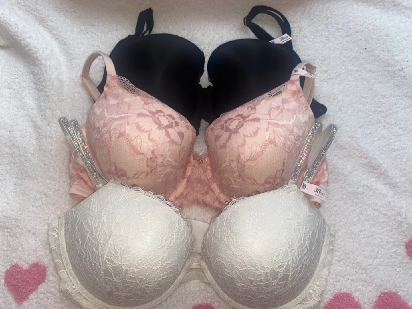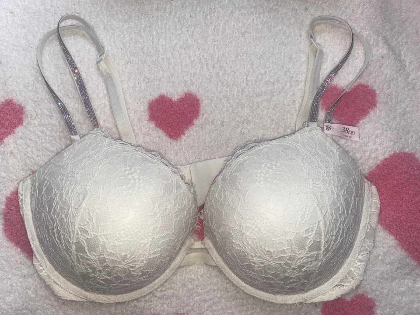 The white bra features a similar lace design and has sparkly adjustable straps with built in push up. 80$