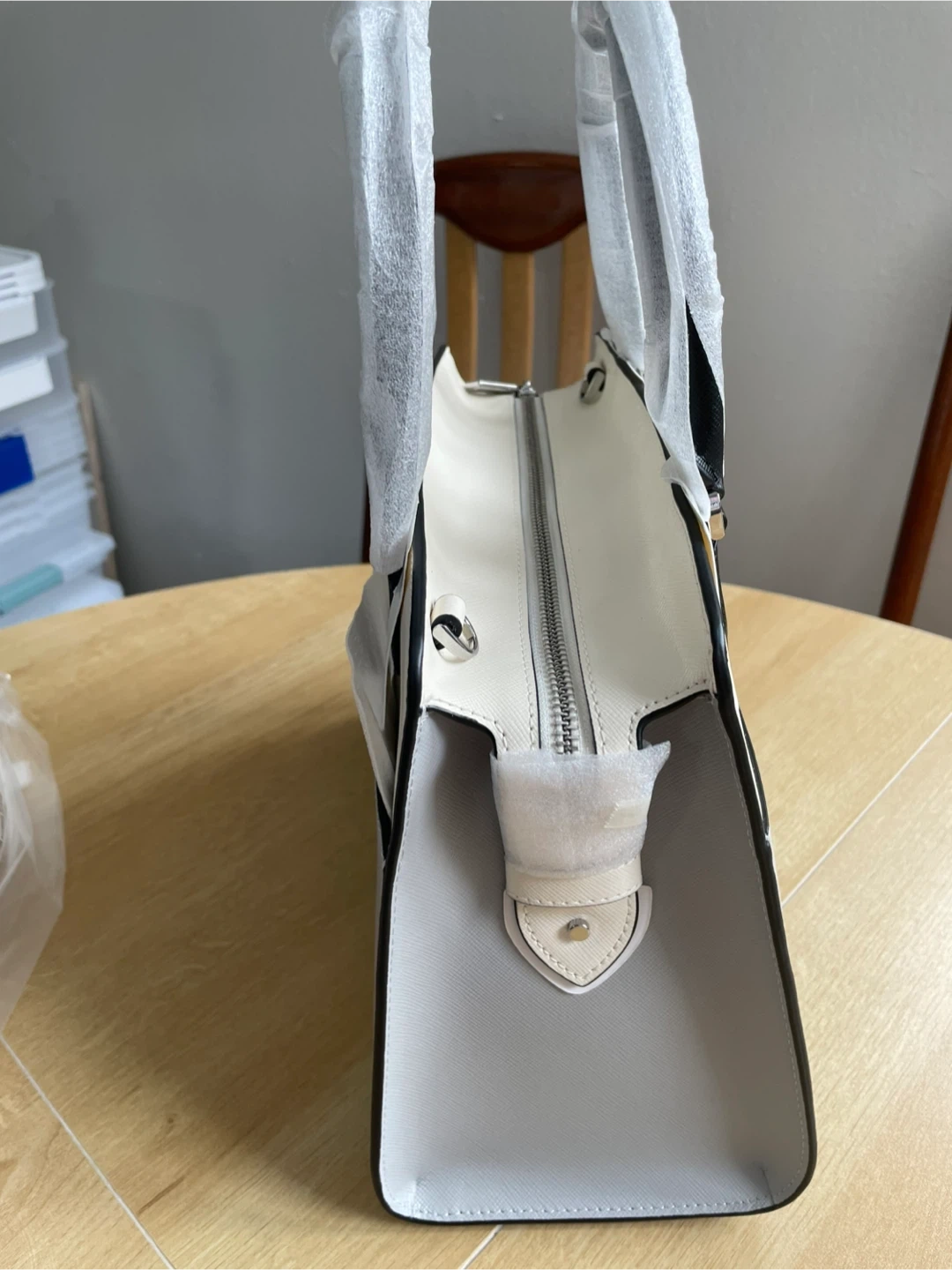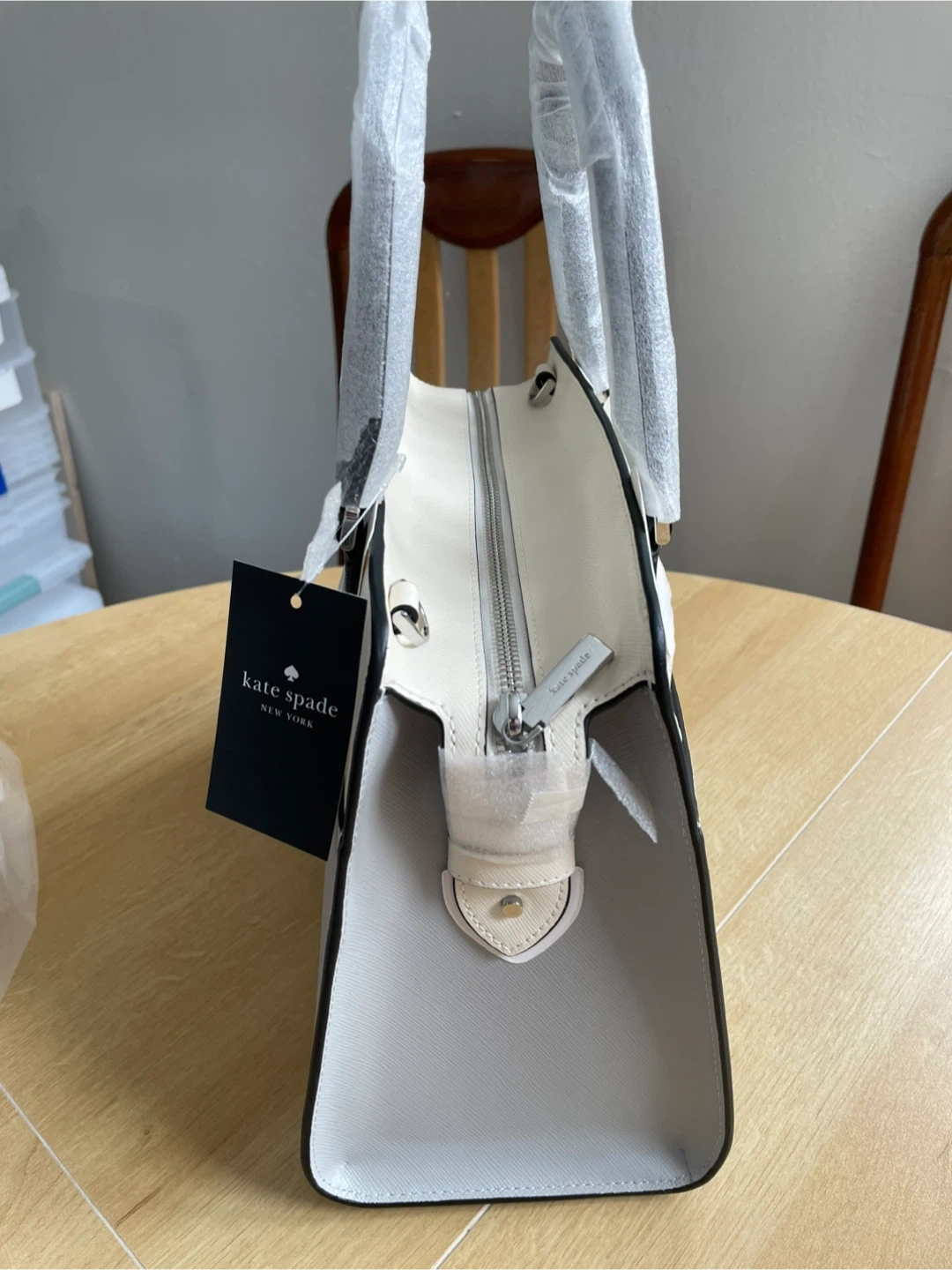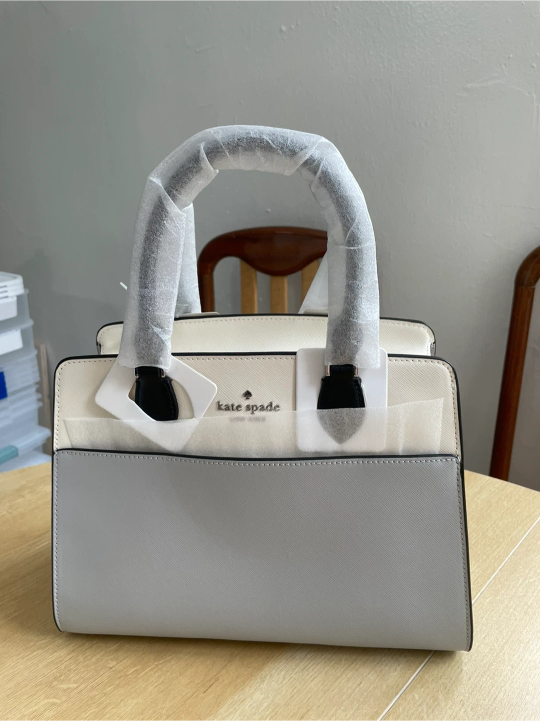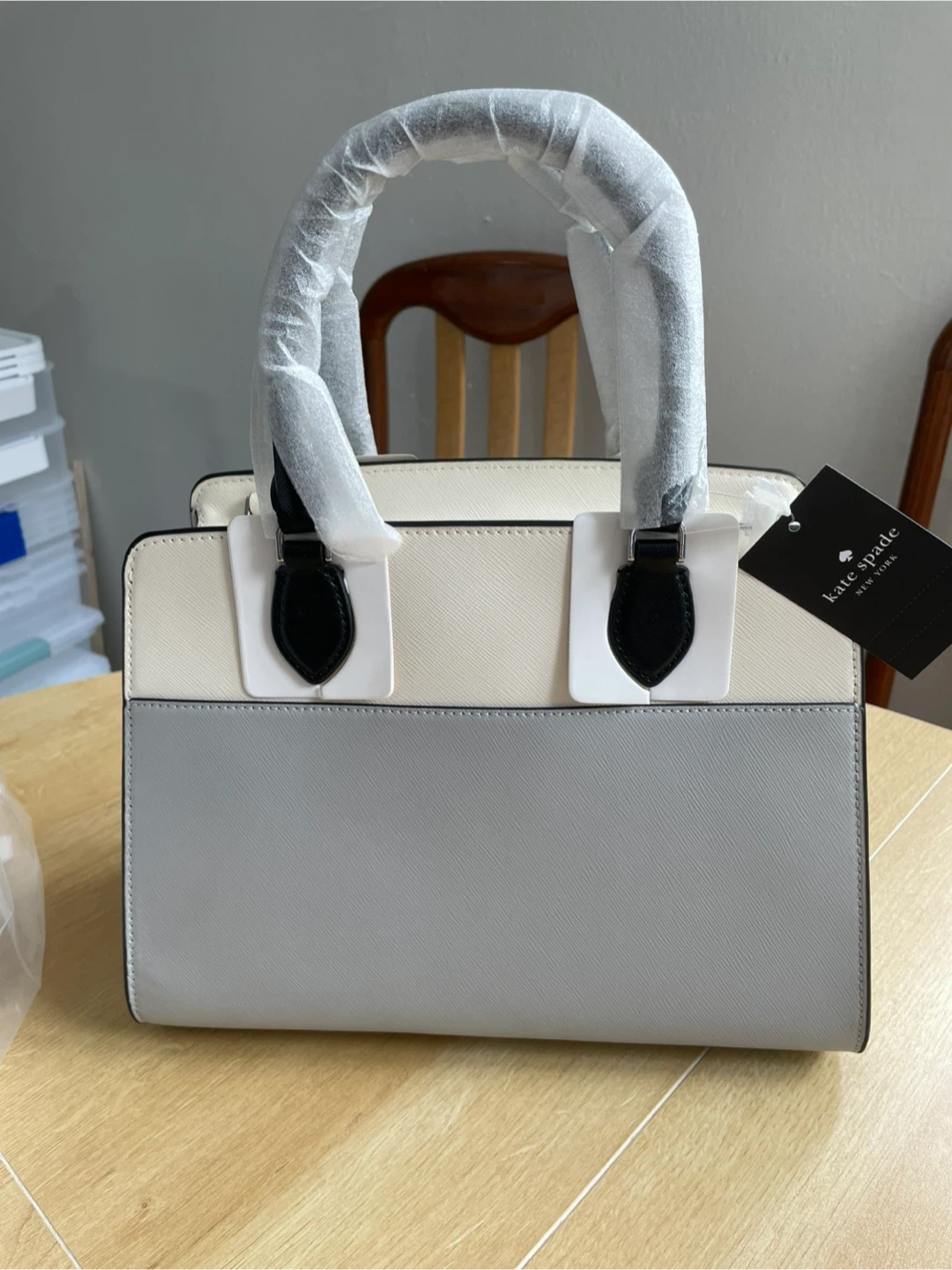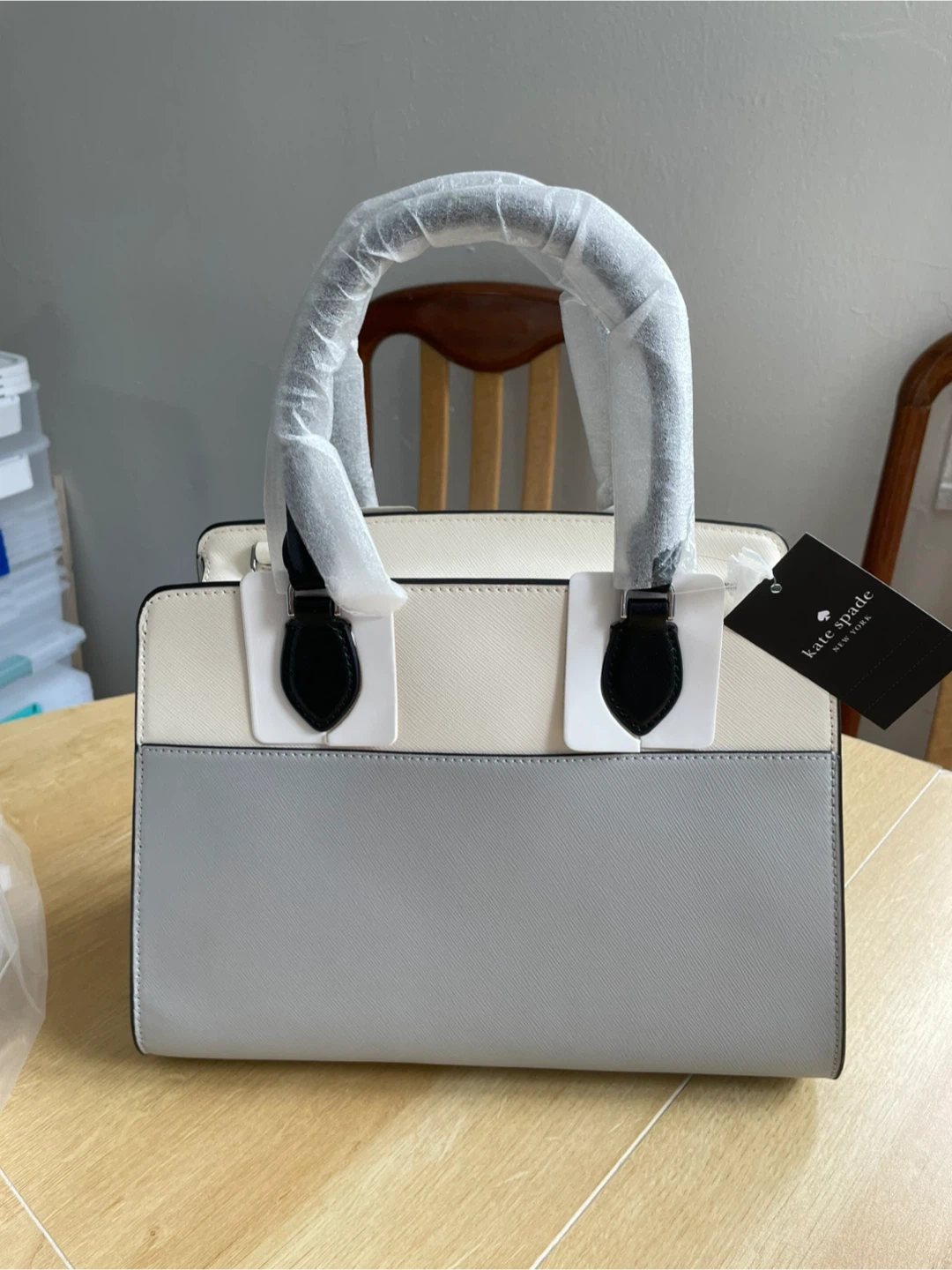 This is a new Kate Spade New York satchel handbag. It's a colorblock design in off-white and grey. It includes protective plastic wrapping on the handles.