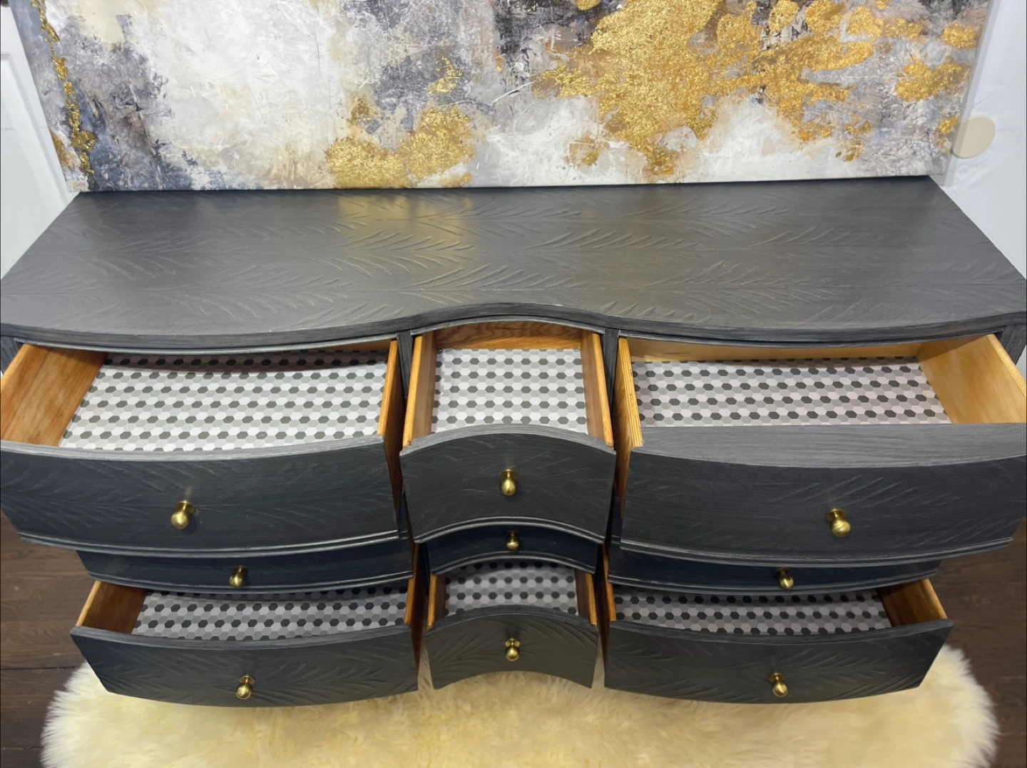 Front and back dovetail drawers. All the drawers are working very good and are lined with new contact paper, extremely clean. Lots of storage. Solid wood. Very sturdy Upgraded gold hardware. Raised stencil added. Can fit in almost any decor or any room: dining-room, kids, guest room or extra storage and organizing purposes.
