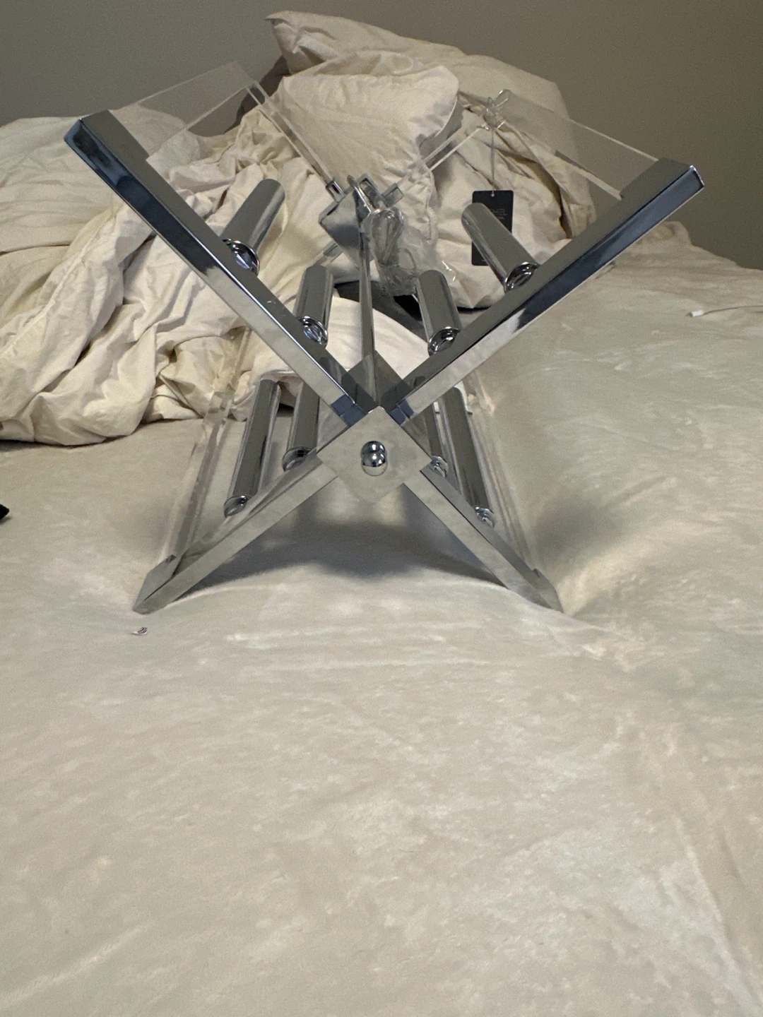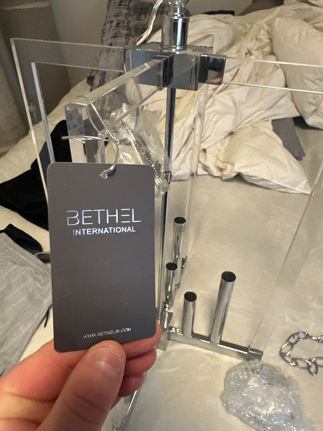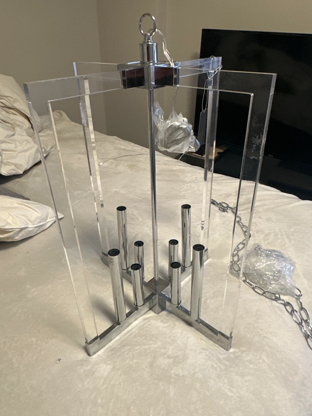 This Bethel International Chandelier features a clear acrylic design with chrome accents. It includes a metal chain for hanging and decorative base cover plate. Great for adding a modern touch to your home!