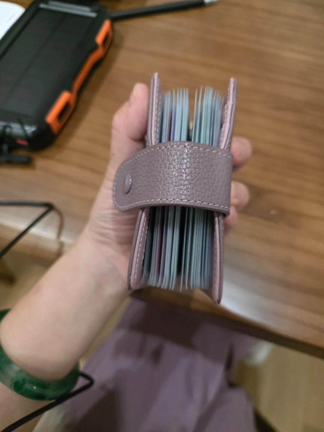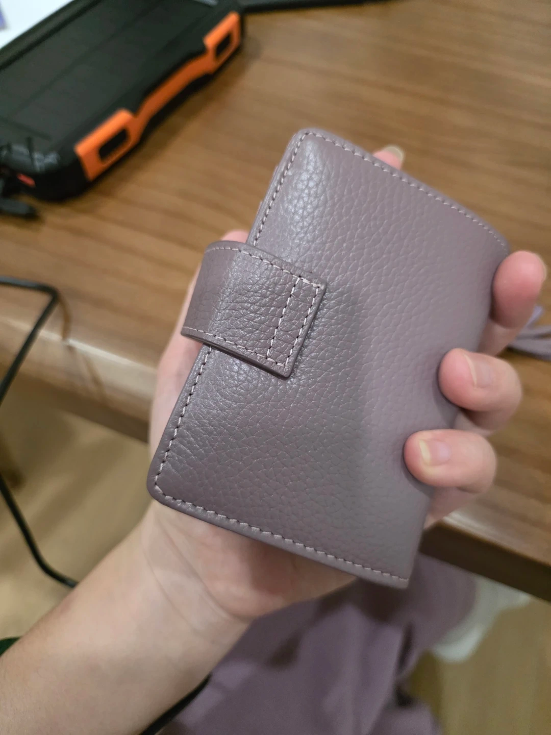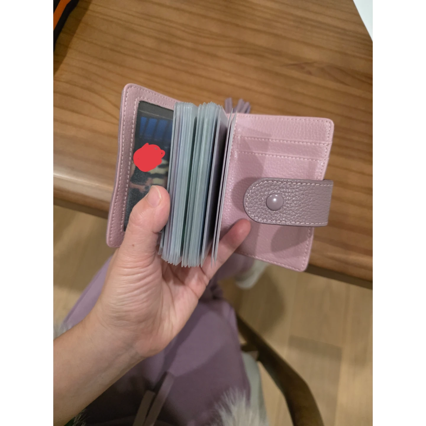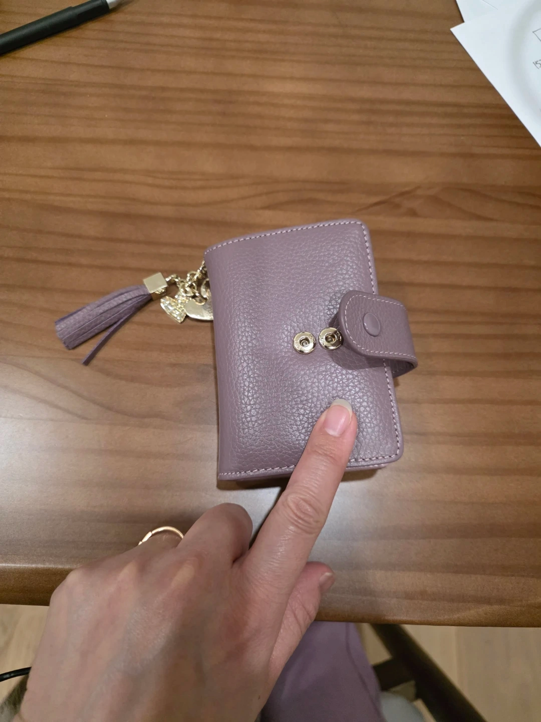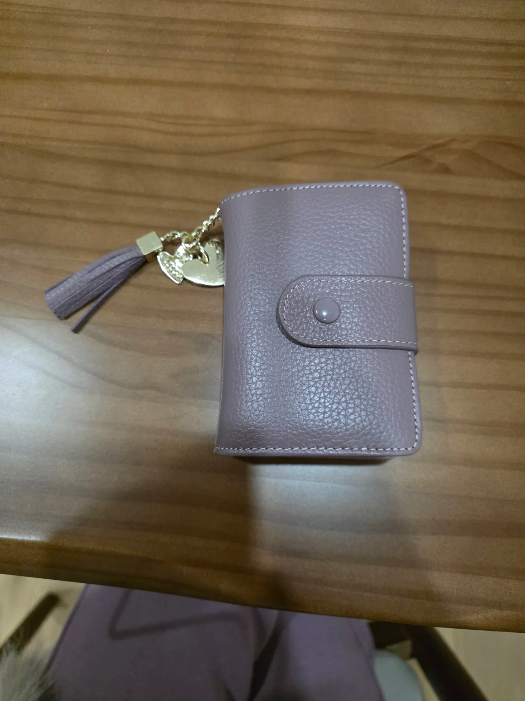 This compact card holder is made of textured purple leather and features a snap closure. It includes a cute tassel and heart charm for a bit of flair. Plenty of slots to organize your cards! And also I'd slot