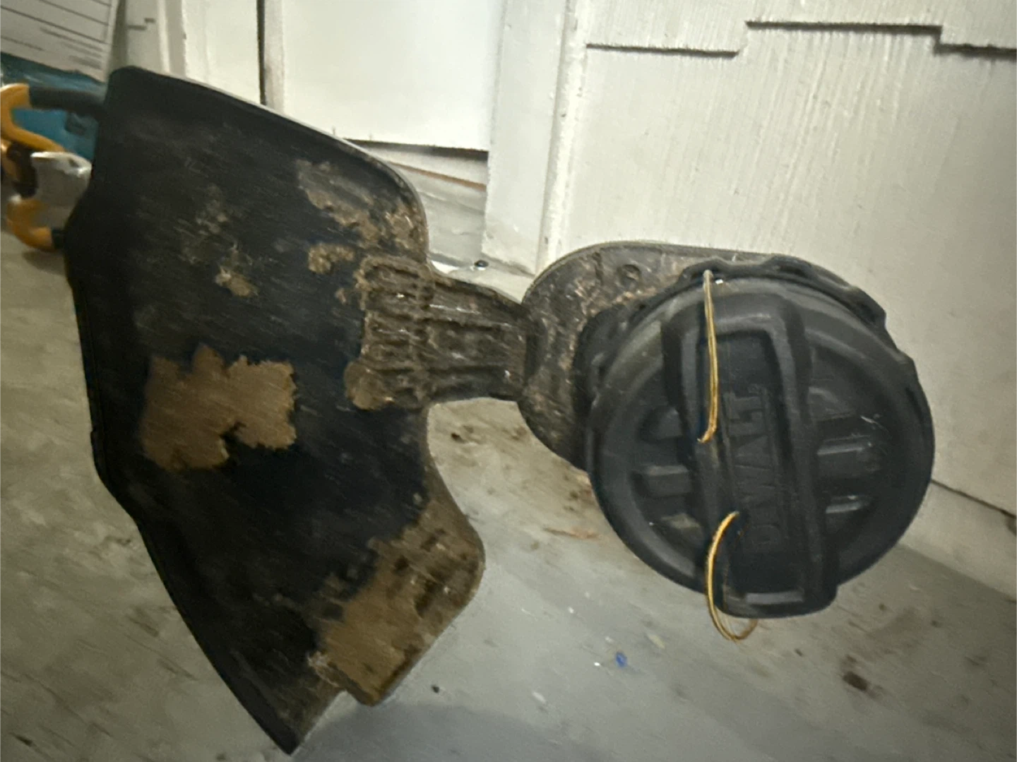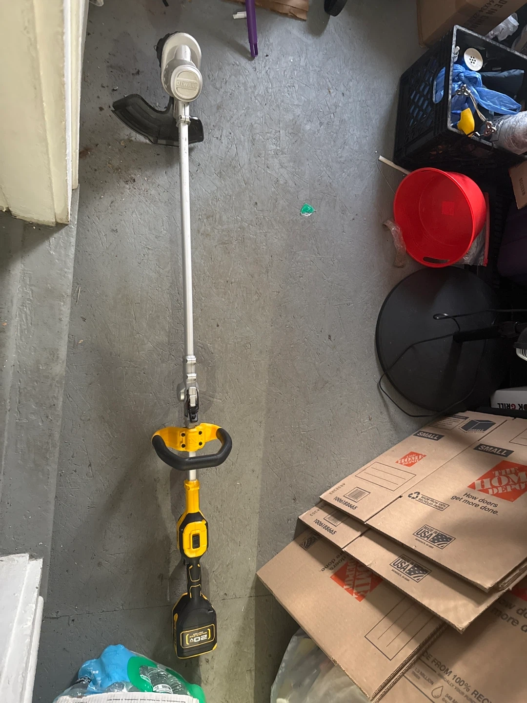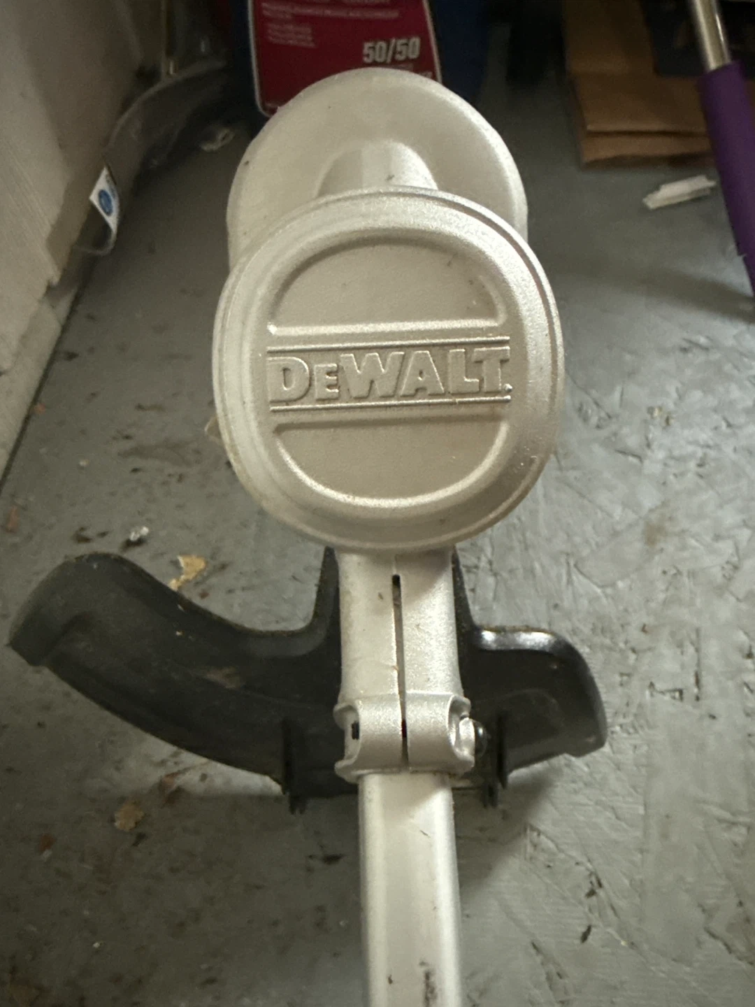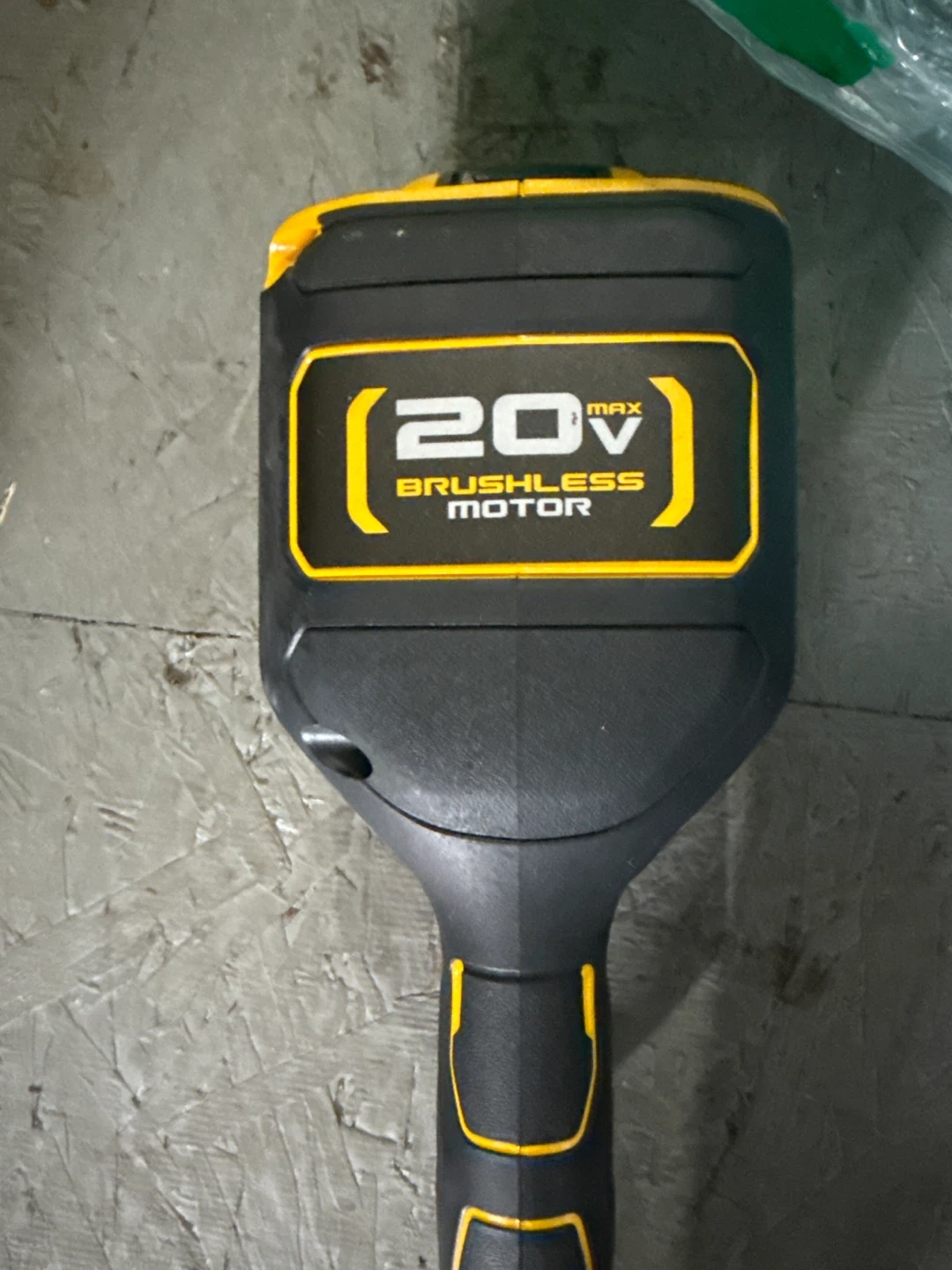 This is a DEWALT 20V MAX cordless string trimmer. It features a brushless motor for efficient power. This tool is great for trimming grass and weeds in your yard. It comes with a spool of line.