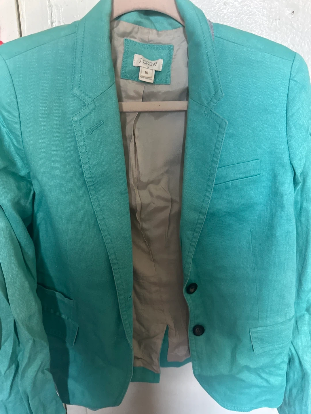 Buy & SellJ. Crew Women's Turquoise Linen Blazer Size 10J. Crew Women's Turquoise Linen Blazer Size 10$25This is a J.Crew turquoise linen blazer. It's a women's size 10. The jacket has a full lining and two-button closure.ConditionOkaySizeSize 10BrandJ. CrewWHERE TO MEETEast 103rd Street Train stationView MapSELLERverifiedYaniraEast Harlem812 reviews0 chats·0 favorites·4 viewsSEND CHAT TO SELLERHi Yanira! I’m interested in your listing.Hi Yanira! I’m interested in your listing.Get the Karrot app to chatSign In to chat