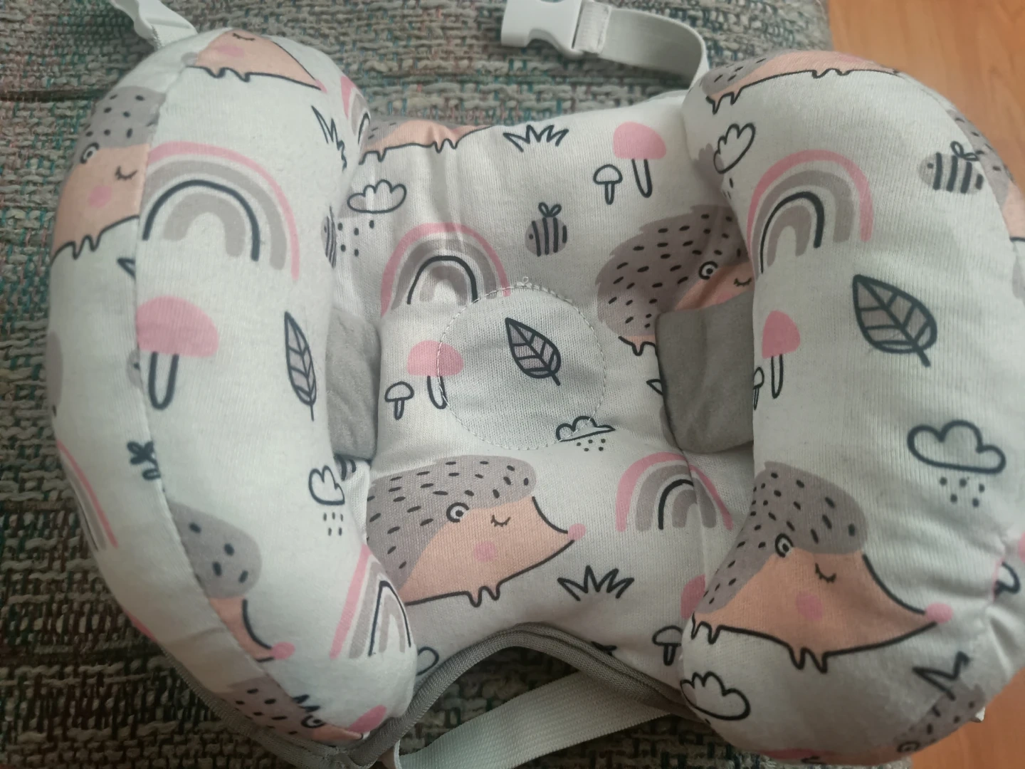 This adorable baby head support pillow features a cute hedgehog and rainbow design. It's made with soft, padded material to keep your little one comfortable. Adjustable straps and a buckle closure ensure a secure fit. It's great for car seats and strollers!