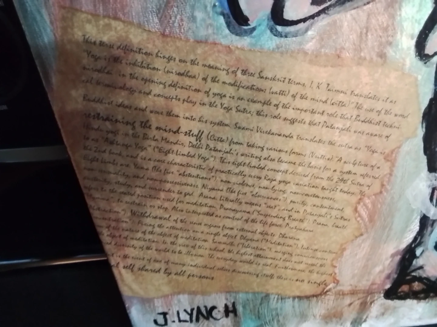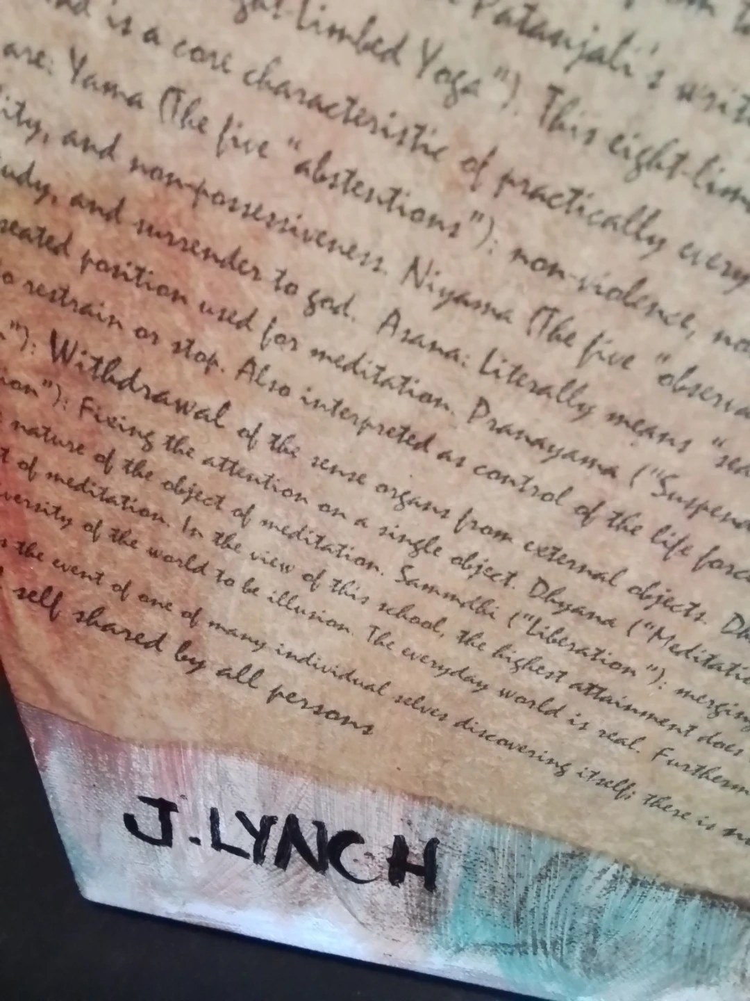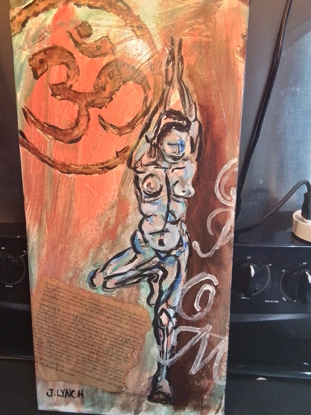 Original acrylic painting by J. Lynch depicting a figure in a yoga pose. The artwork features an Om symbol and text collage. It's a unique piece for meditation or yoga enthusiasts.