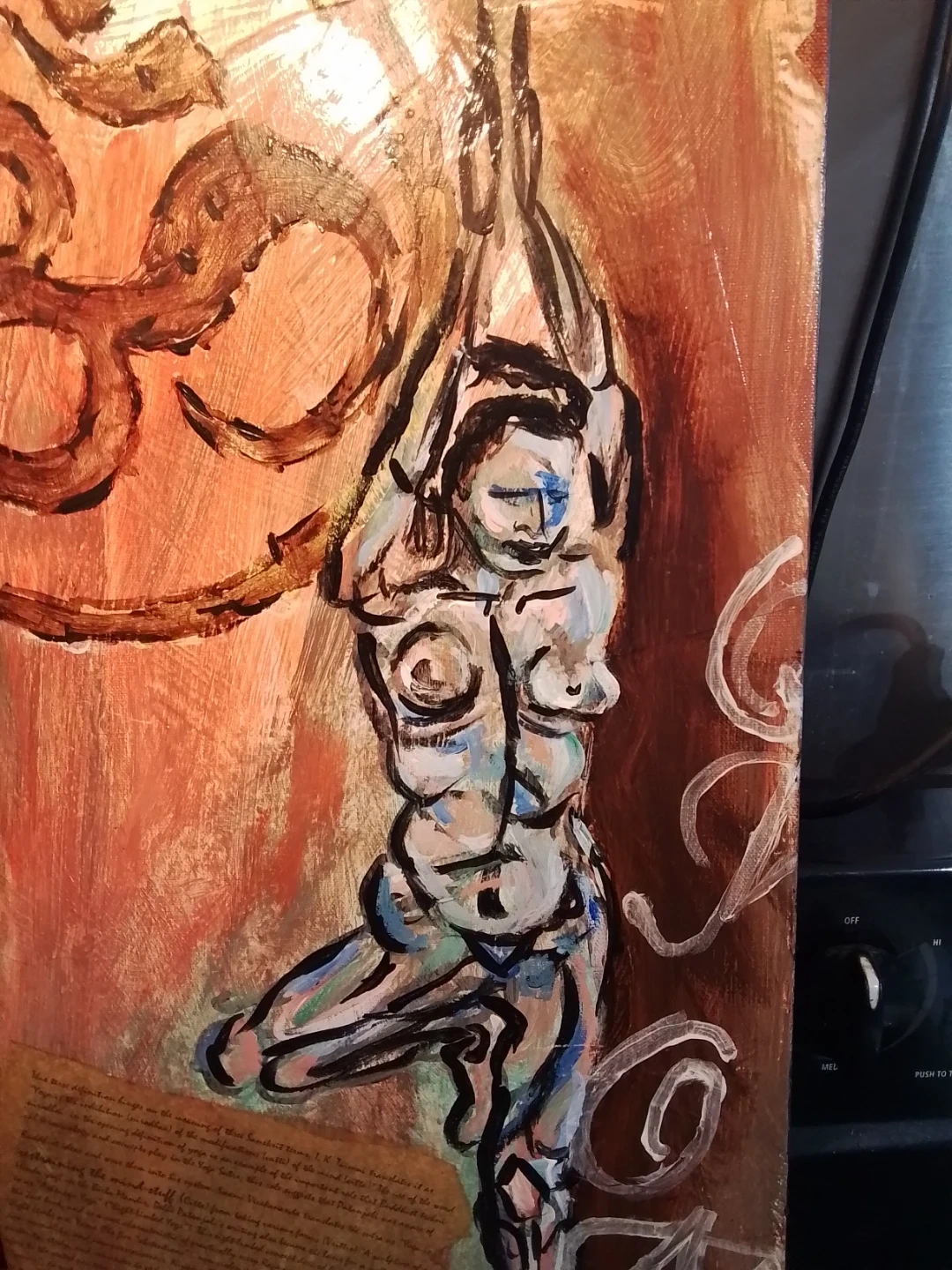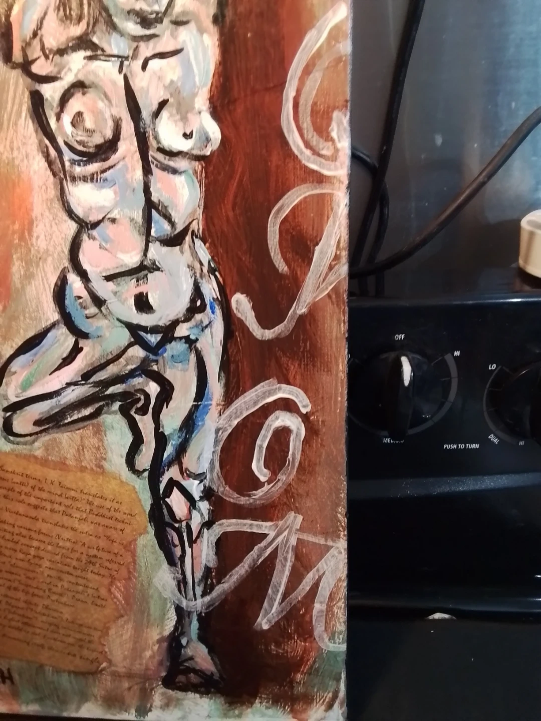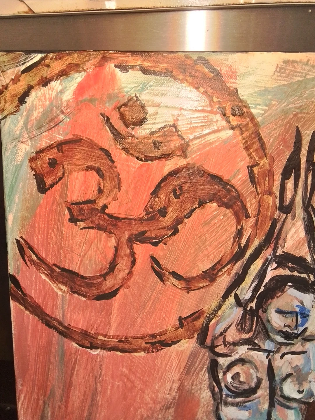 Original acrylic painting by J. Lynch depicting a figure in a yoga pose. The artwork features an Om symbol and text collage. It's a unique piece for meditation or yoga enthusiasts.
