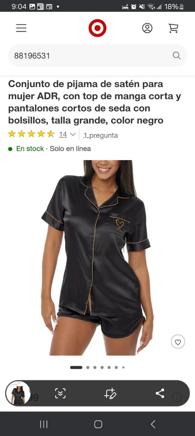 Selling a cute Target ADR satin pajama set! It's a women's pajama set with a short-sleeved top and silk shorts with pockets. The color is black and the size is large