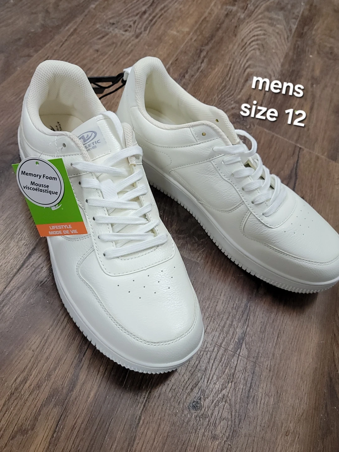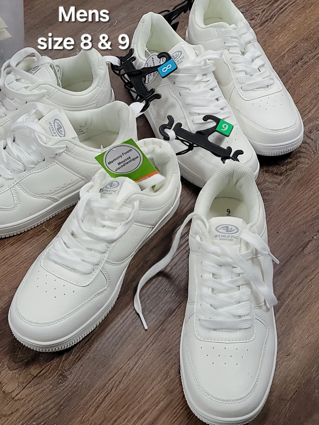 Selling a pair of Athletic Works white sneakers in men's size 8 and 9 and 12. These sneakers feature memory foam insoles for added comfort. Great for everyday wear!