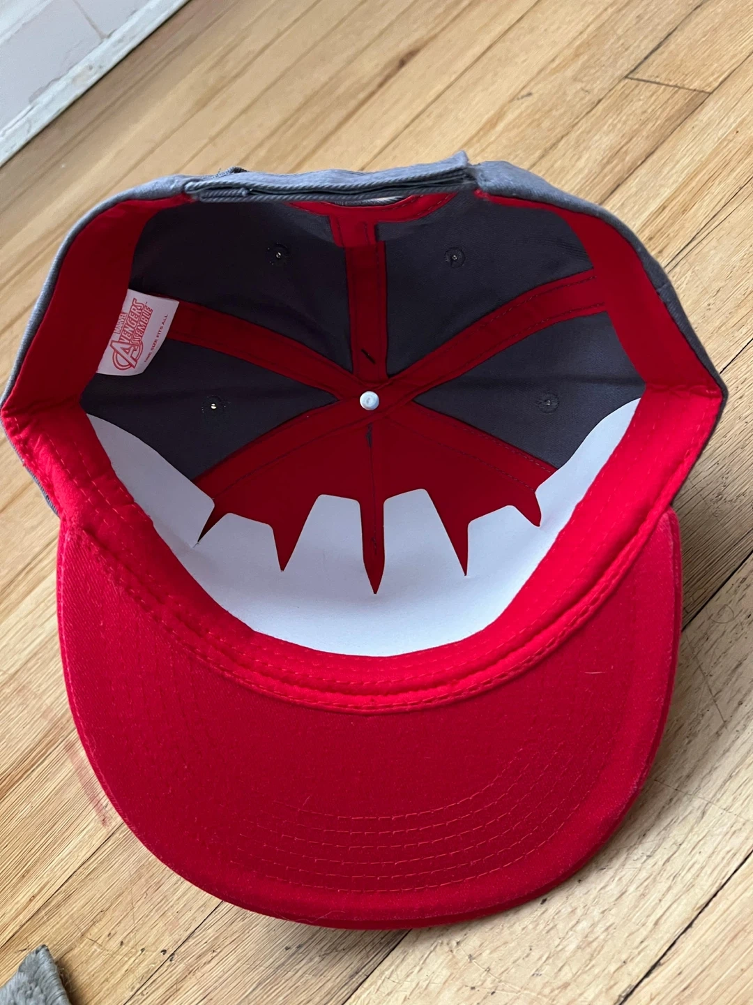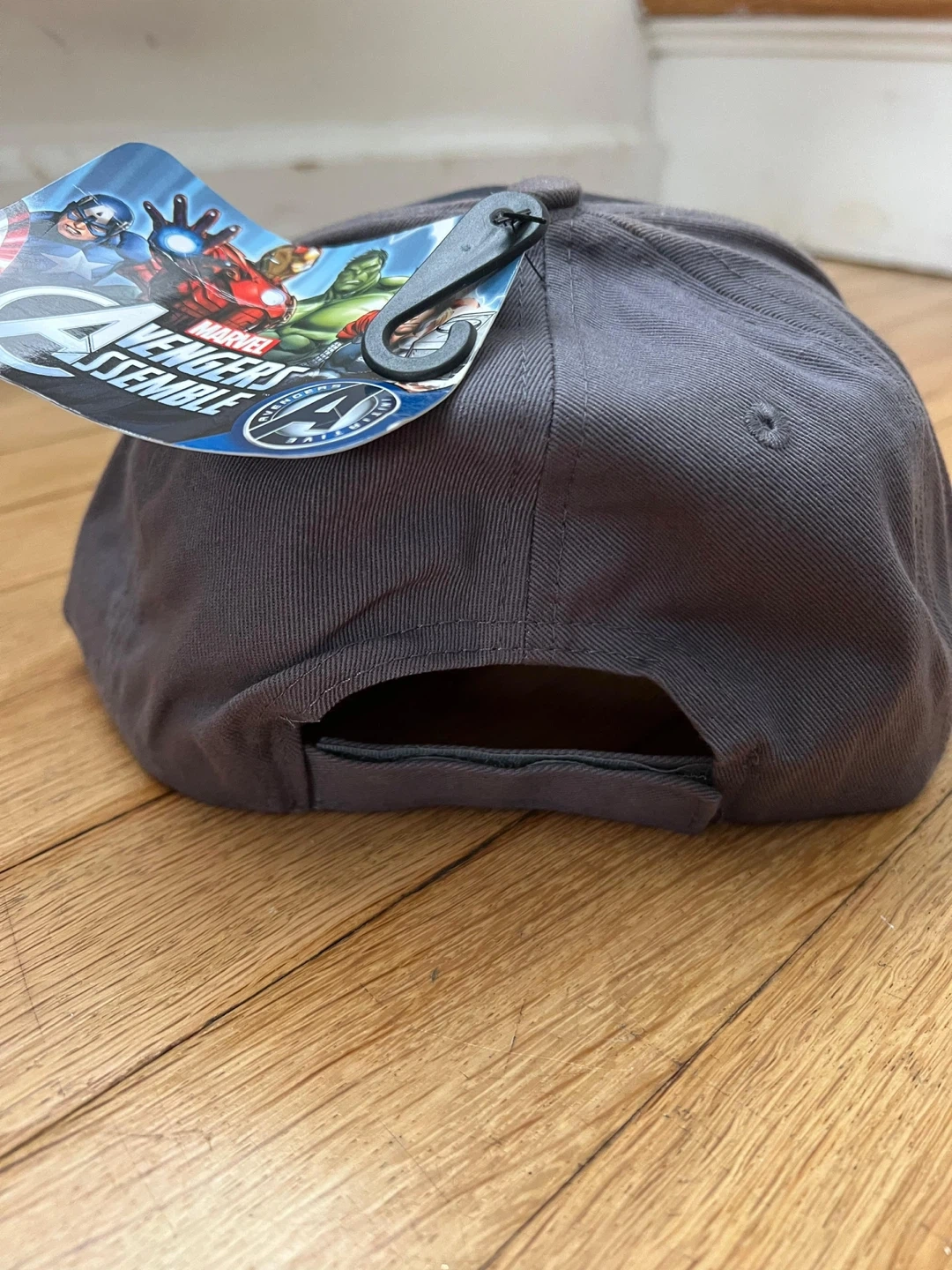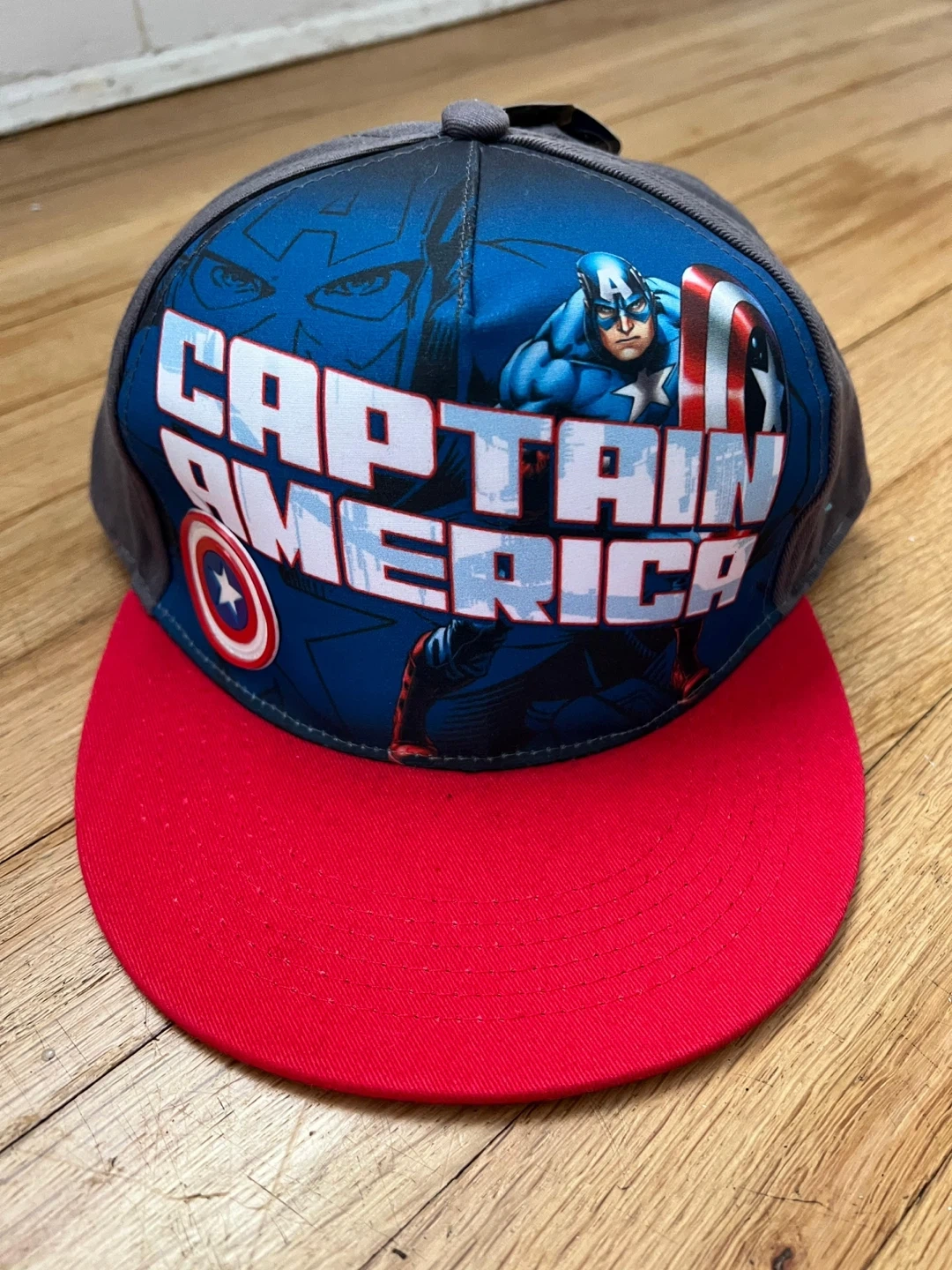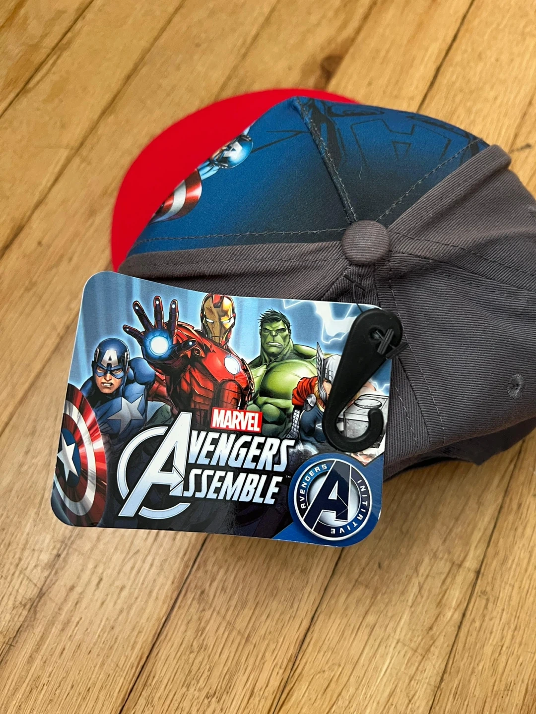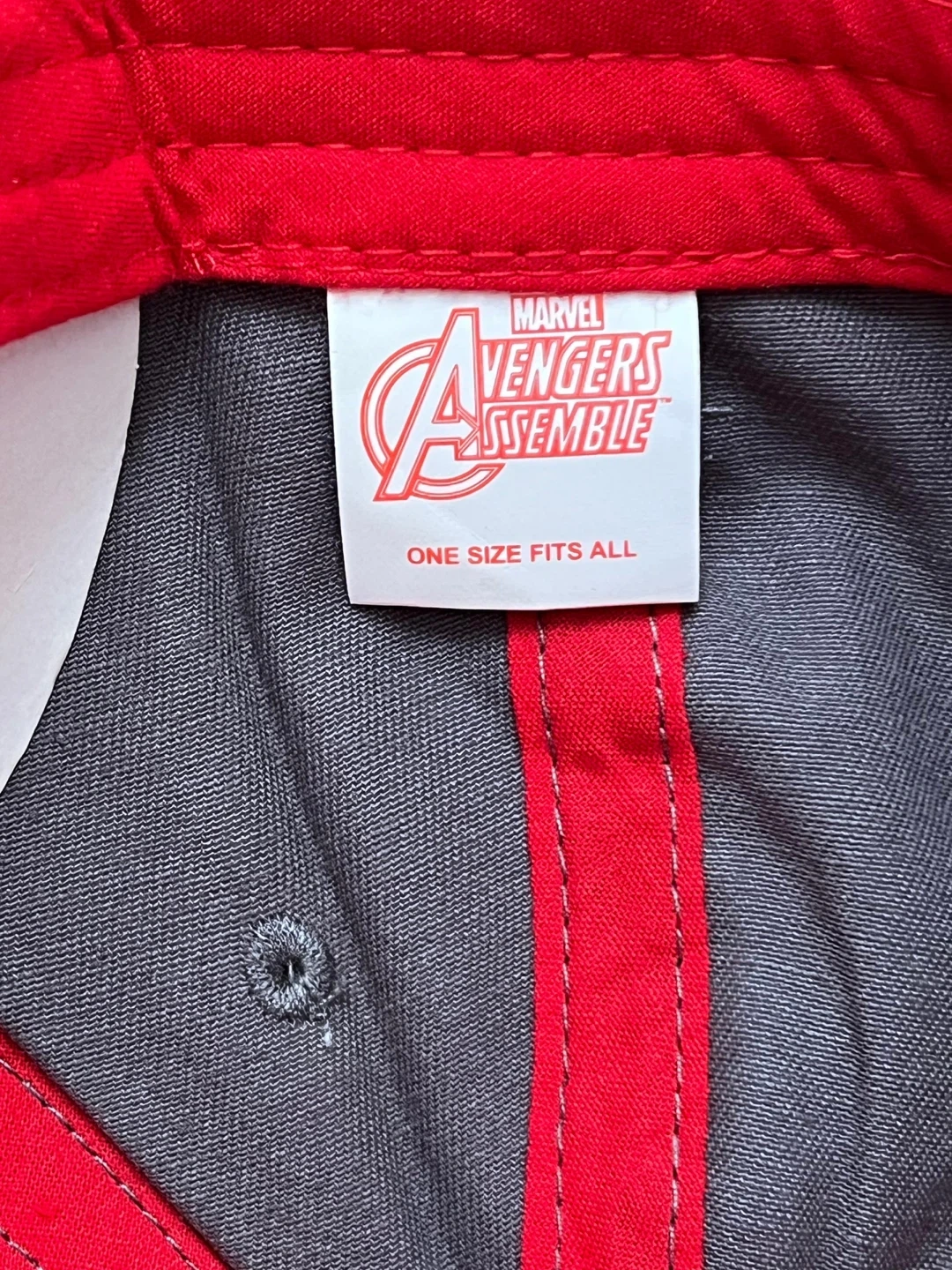 This youth baseball cap features Captain America graphics and the Avengers Assemble logo. It's a one-size-fits-all design with a red brim. Great for any young superhero fan!