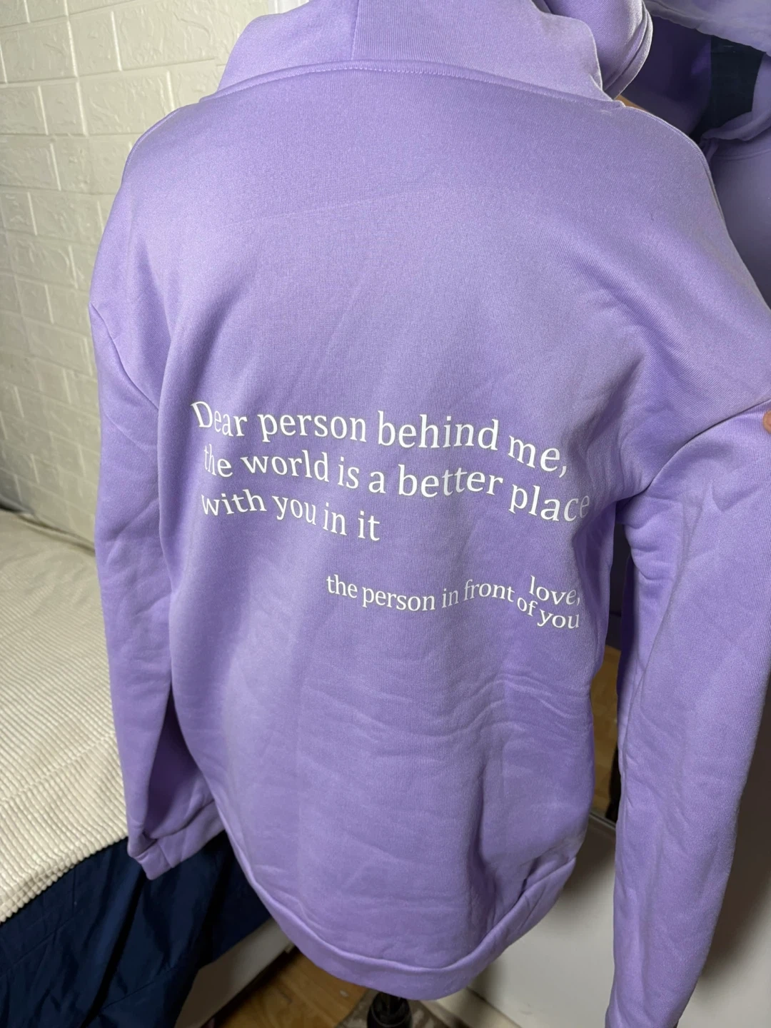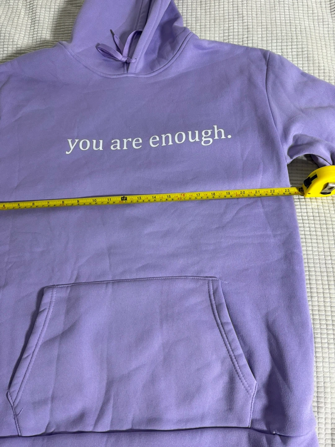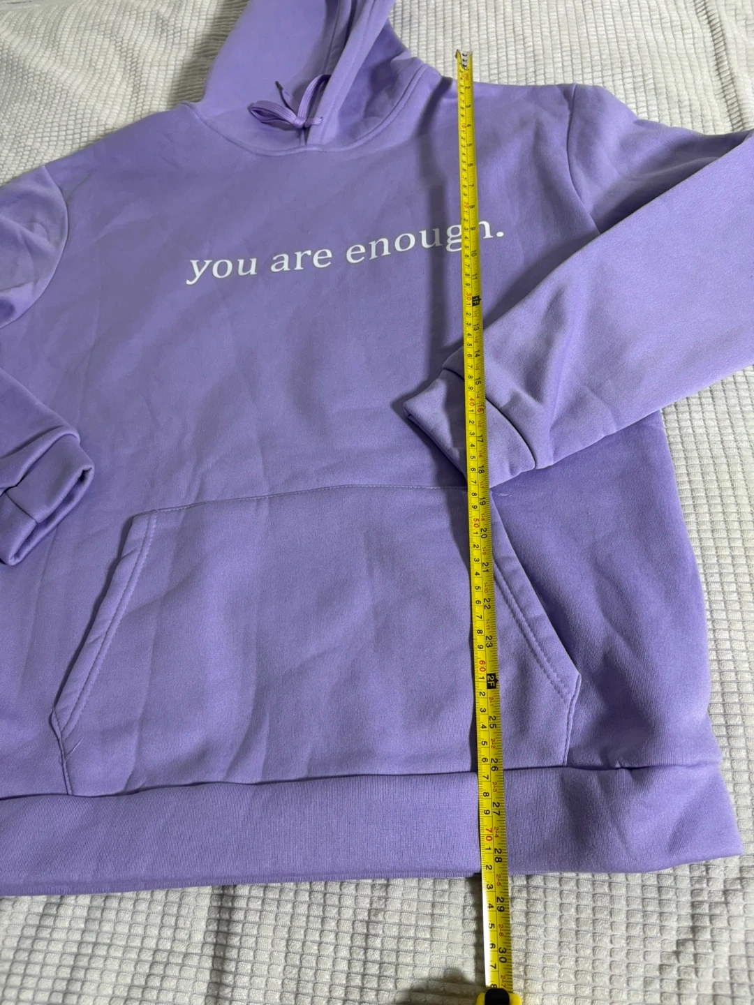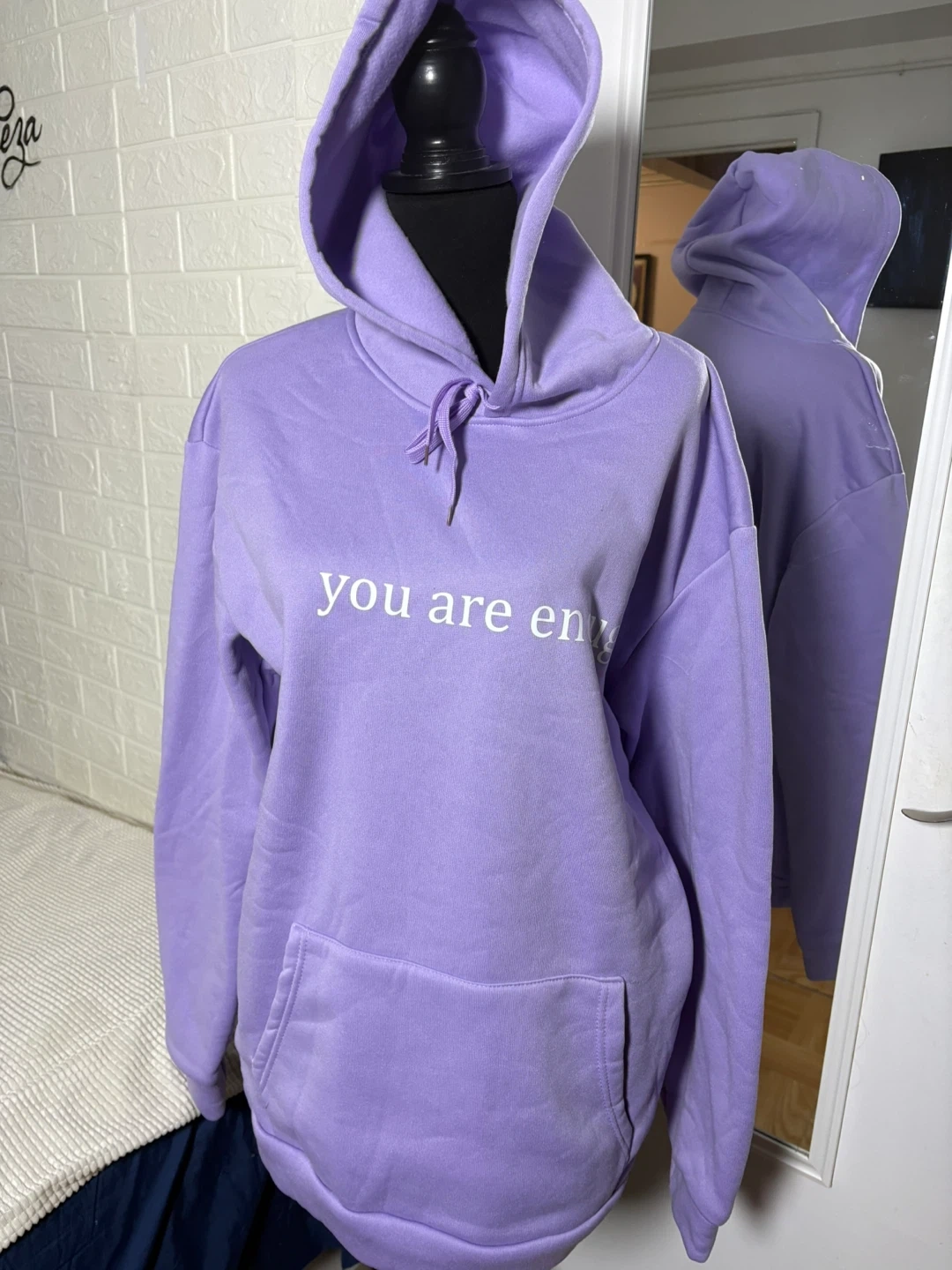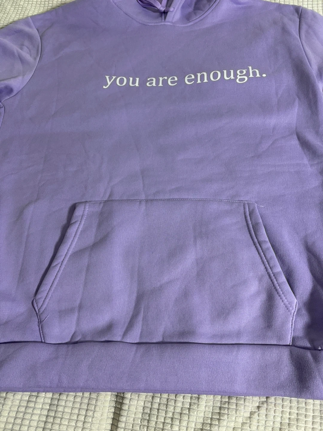 Purple hooded sweatshirt with 'you are enough' graphic on the front. The back reads 'Dear person behind me, the world is a better place with you in it, the person in front of you love'. XL size. Soft fabric.