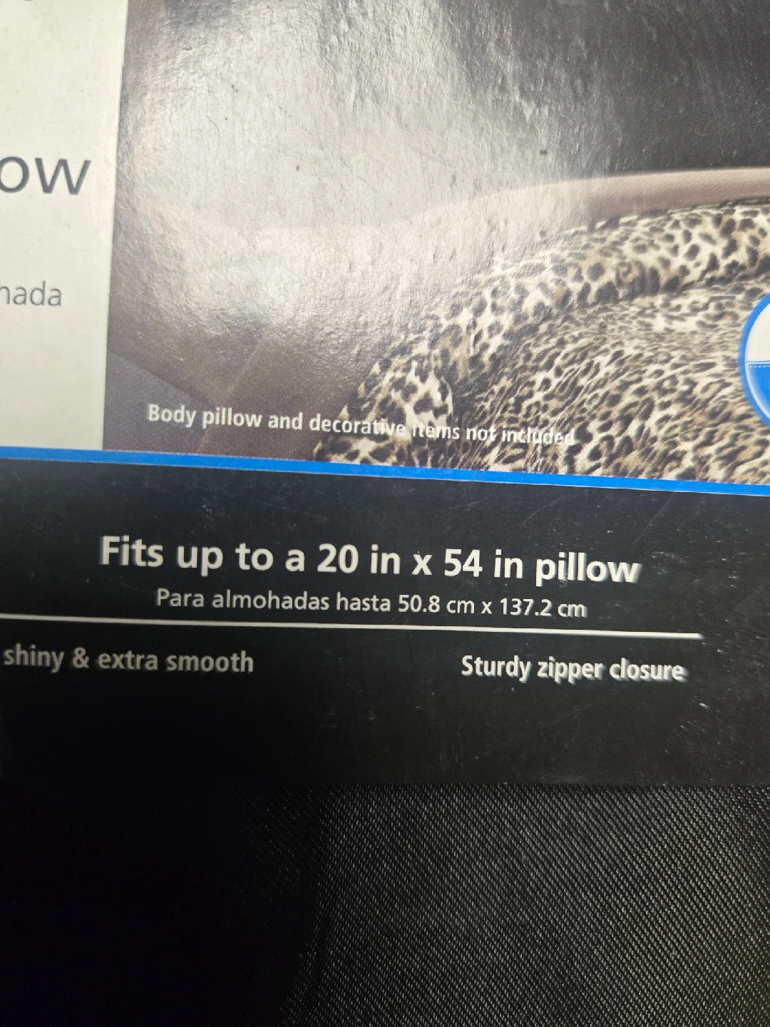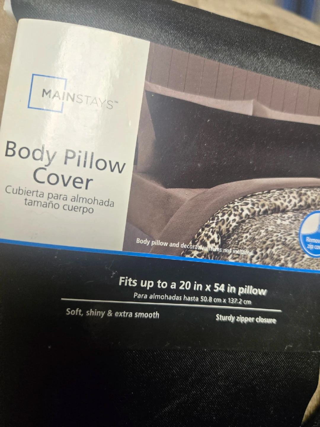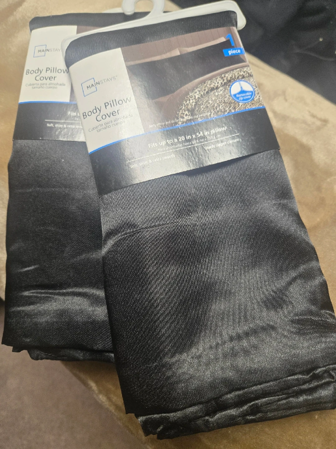 Selling a Mainstays body pillow cover in black! It fits up to a 20 in x 54 in pillow. It's soft, shiny, and extra smooth