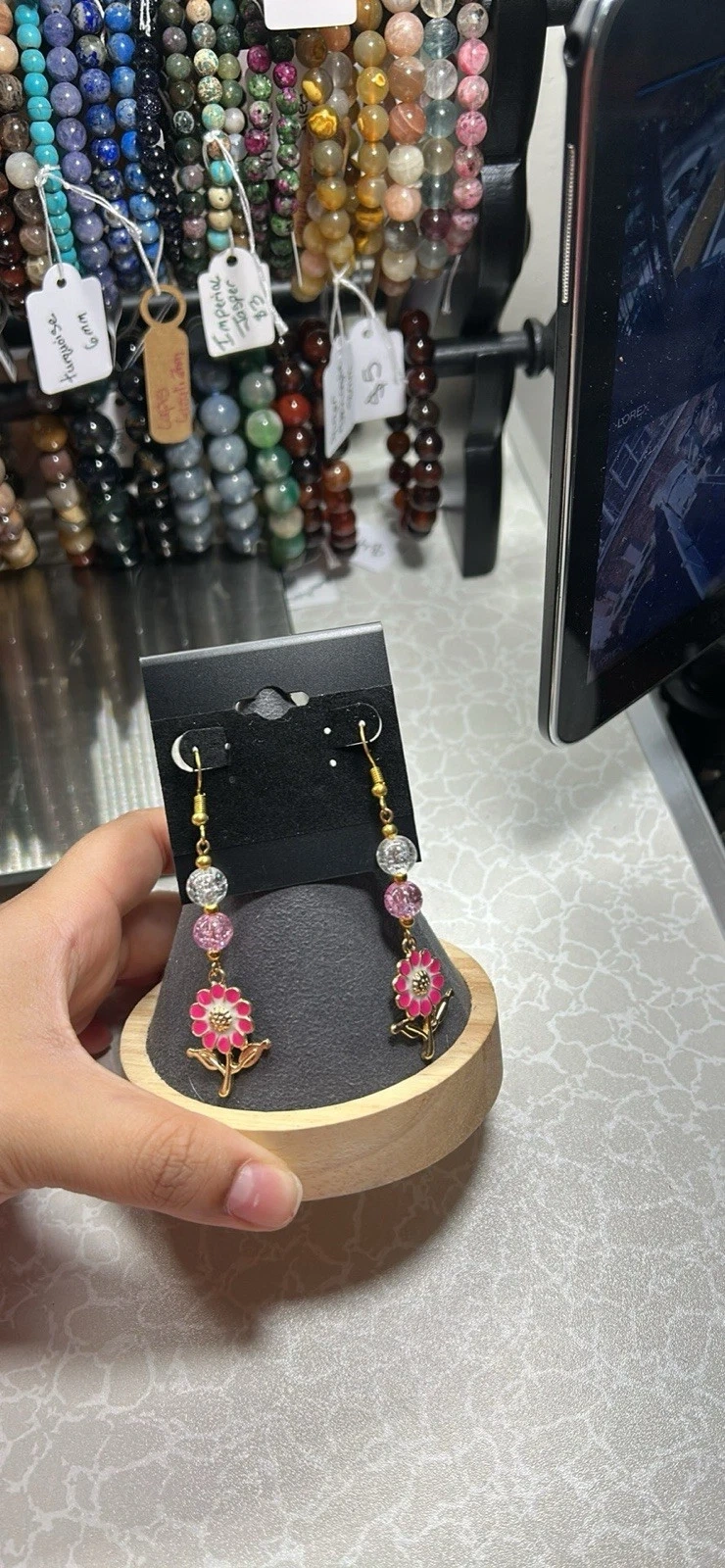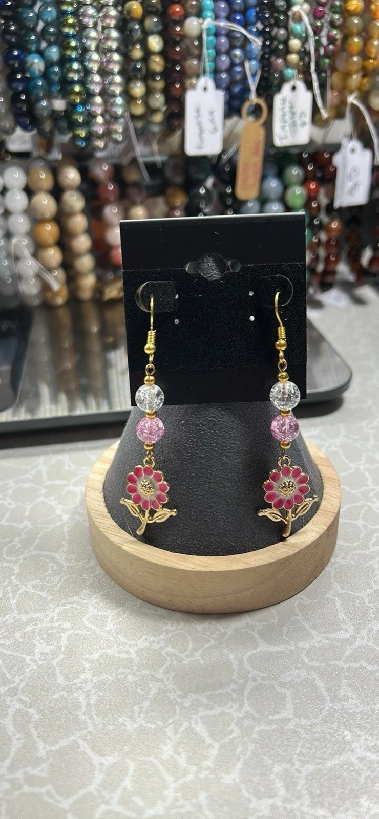 Pretty gold-tone dangle earrings featuring pink flower beads and a round glass stone. The closure is a hook, perfect for the earlobe. The theme is flowers.