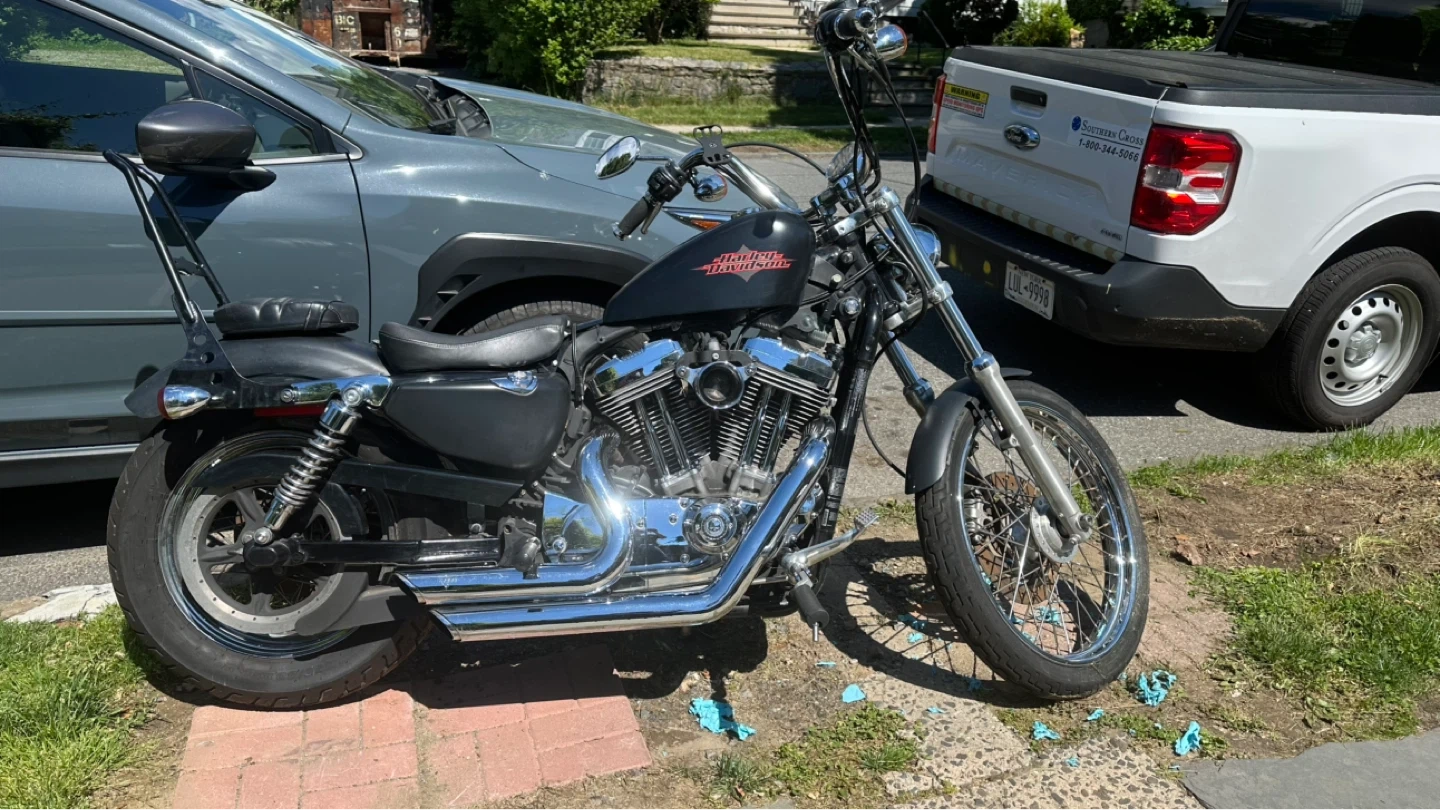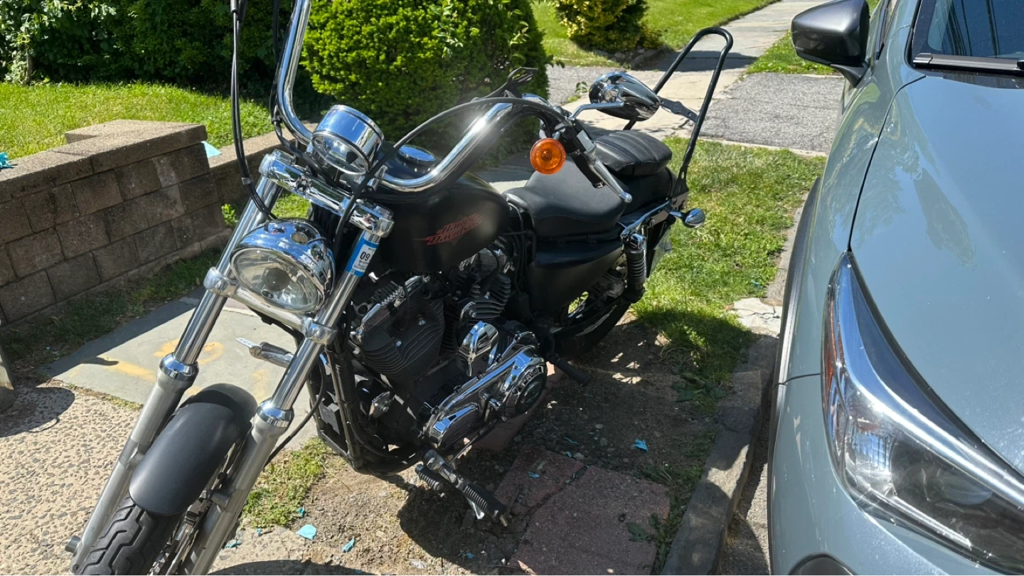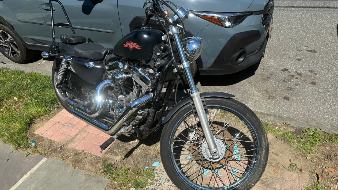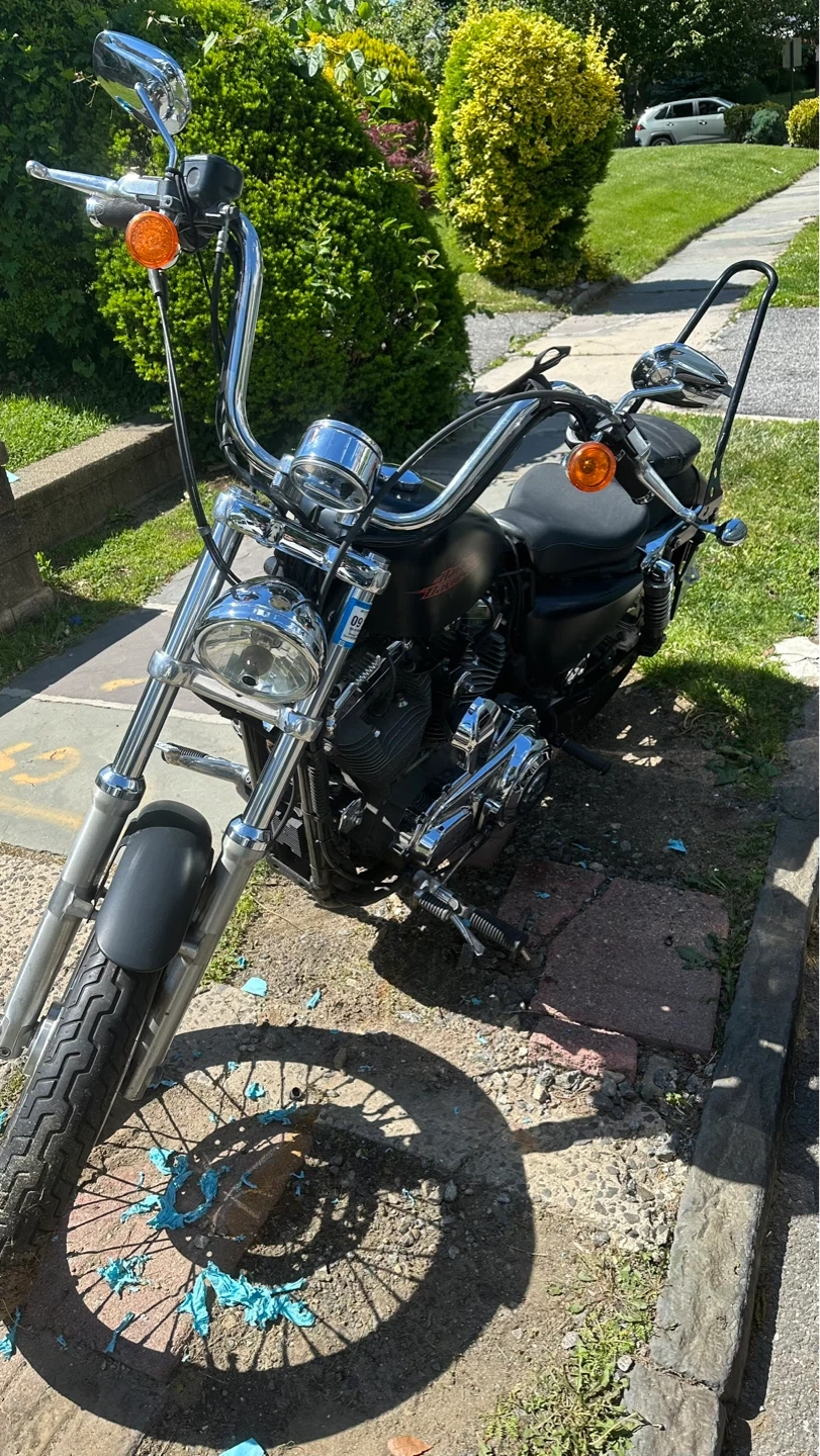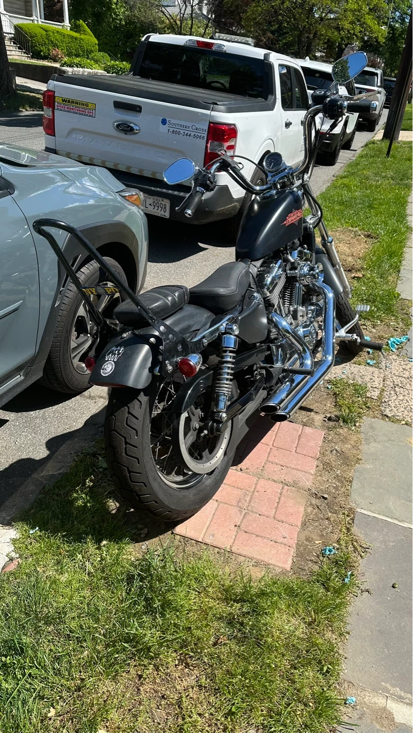 Black Harley-Davidson motorcycle with chrome accents. Features a custom seat and sissy bar $5000. It definitely needs a battery but we can certainly talk about that in the pricing.