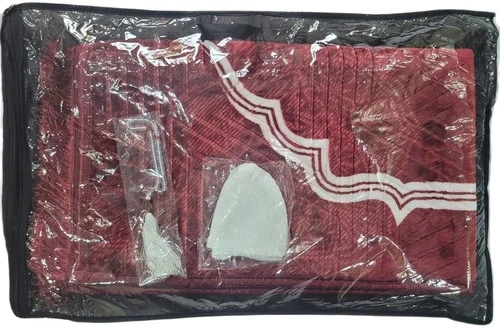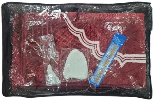 Elevate your prayer experience with this luxurious Islamic prayer mat set . The stunning burgundy red velvet prayer rug features an elegant white arch design complemented by intricate medallion patterns, creating a sacred space wherever you are. The plush velvet material offers comfort while maintaining durability. This complete set includes a travel-friendly carrying bag for convenient transport and storage, along with a traditional natural miswak toothbrush, following ancient customs. The prayer mat's rich color and detailed embroidery work showcase beautiful Islamic artistry, while the fringed edges add a classic finishing touch. The generous size provides ample space for comfortable prayer positions. Perfect for both daily prayers at home and travel use, this set combines functionality with traditional aesthetic appeal. The included carrying case protects your prayer mat and keeps all components organized. Each element of this set has been thoughtfully curated to enhance your spiritual practices with both beauty and practicality.