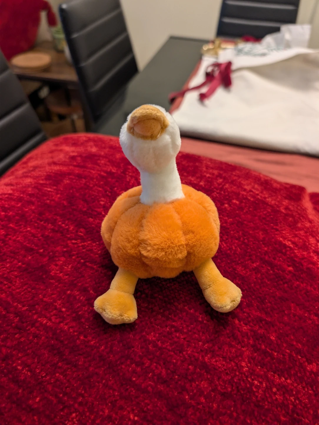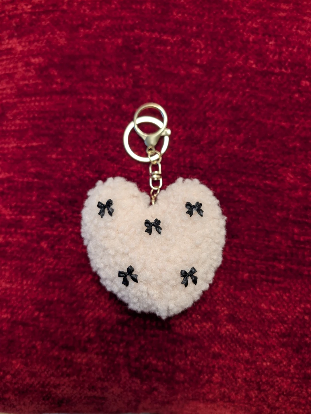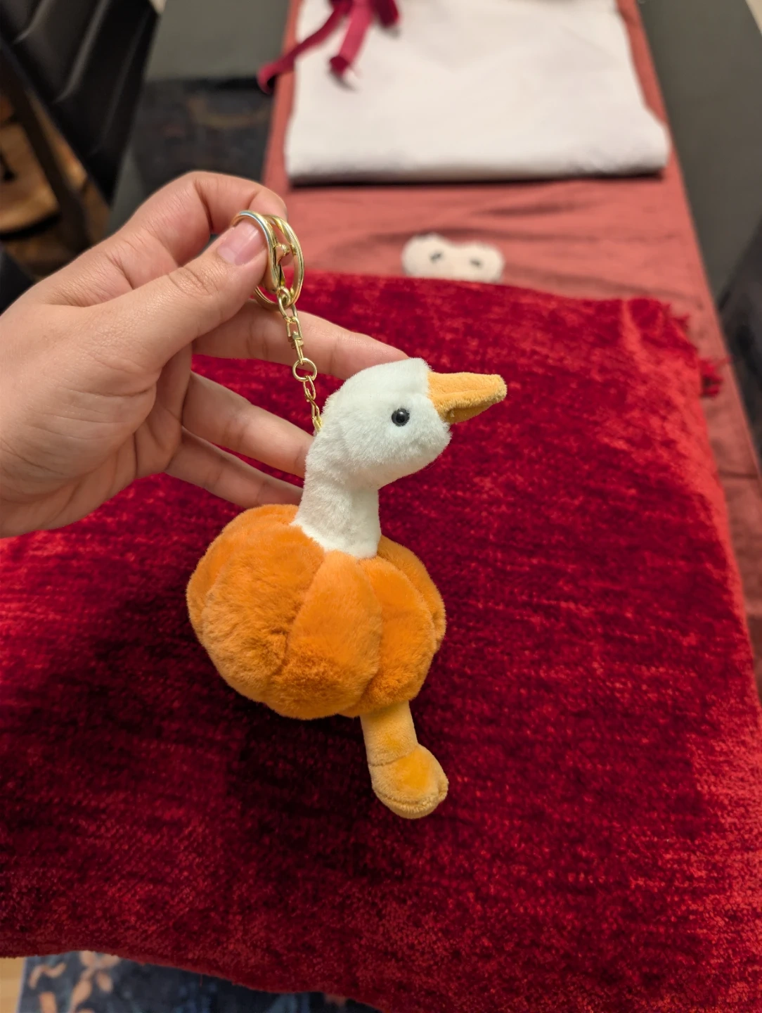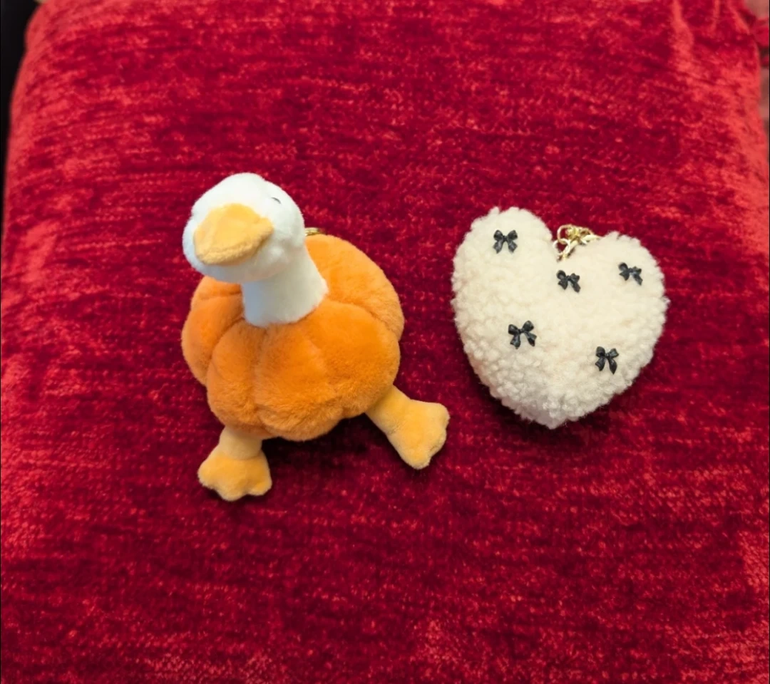This listing includes a cute plush duck keychain with an orange pumpkin-like body and a fluffy white heart charm. Both have gold-tone keyrings attached.
