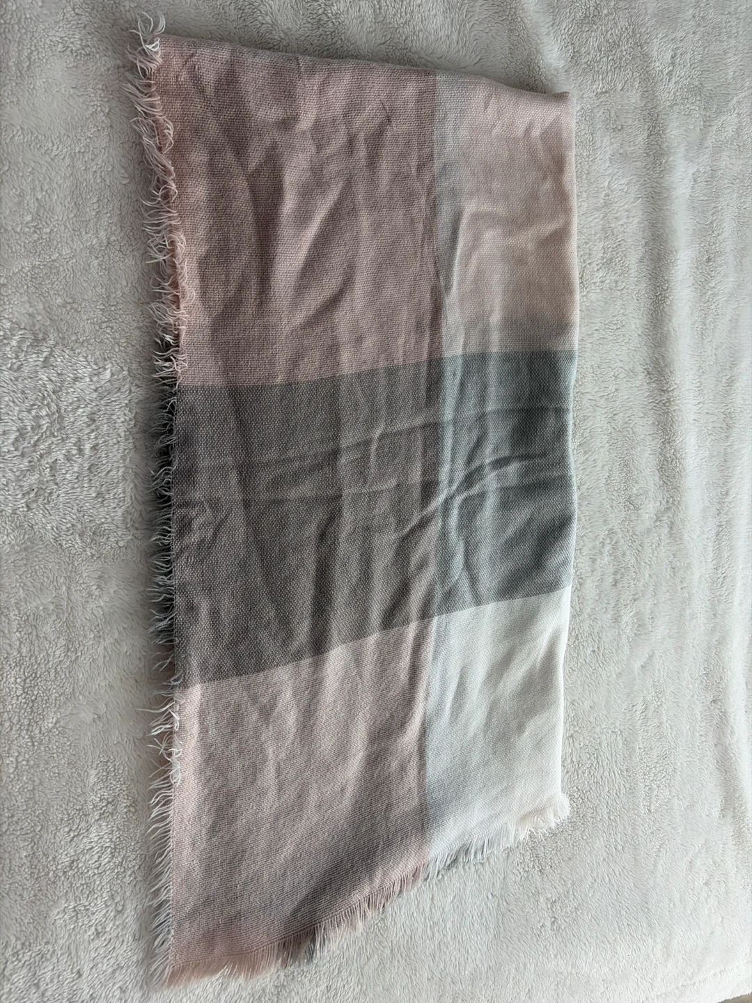 Selling a cozy striped scarf! It features stripes in pink, grey, and white, and has a fringed edge. It's in great condition and perfect for adding a touch of warmth and style to any outfit