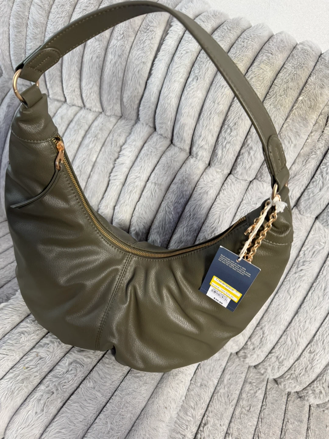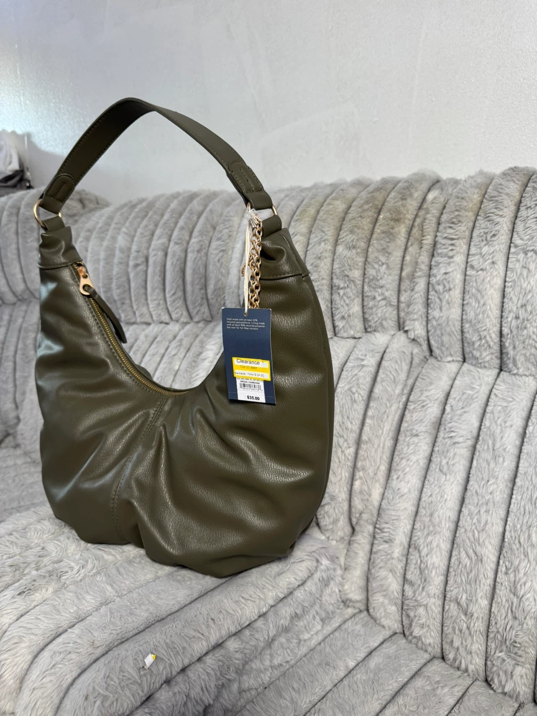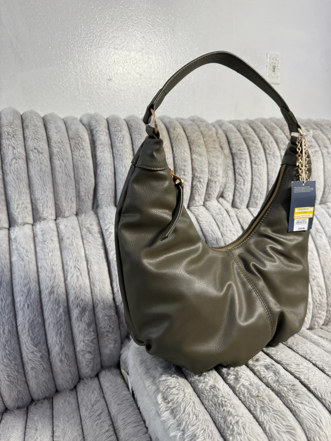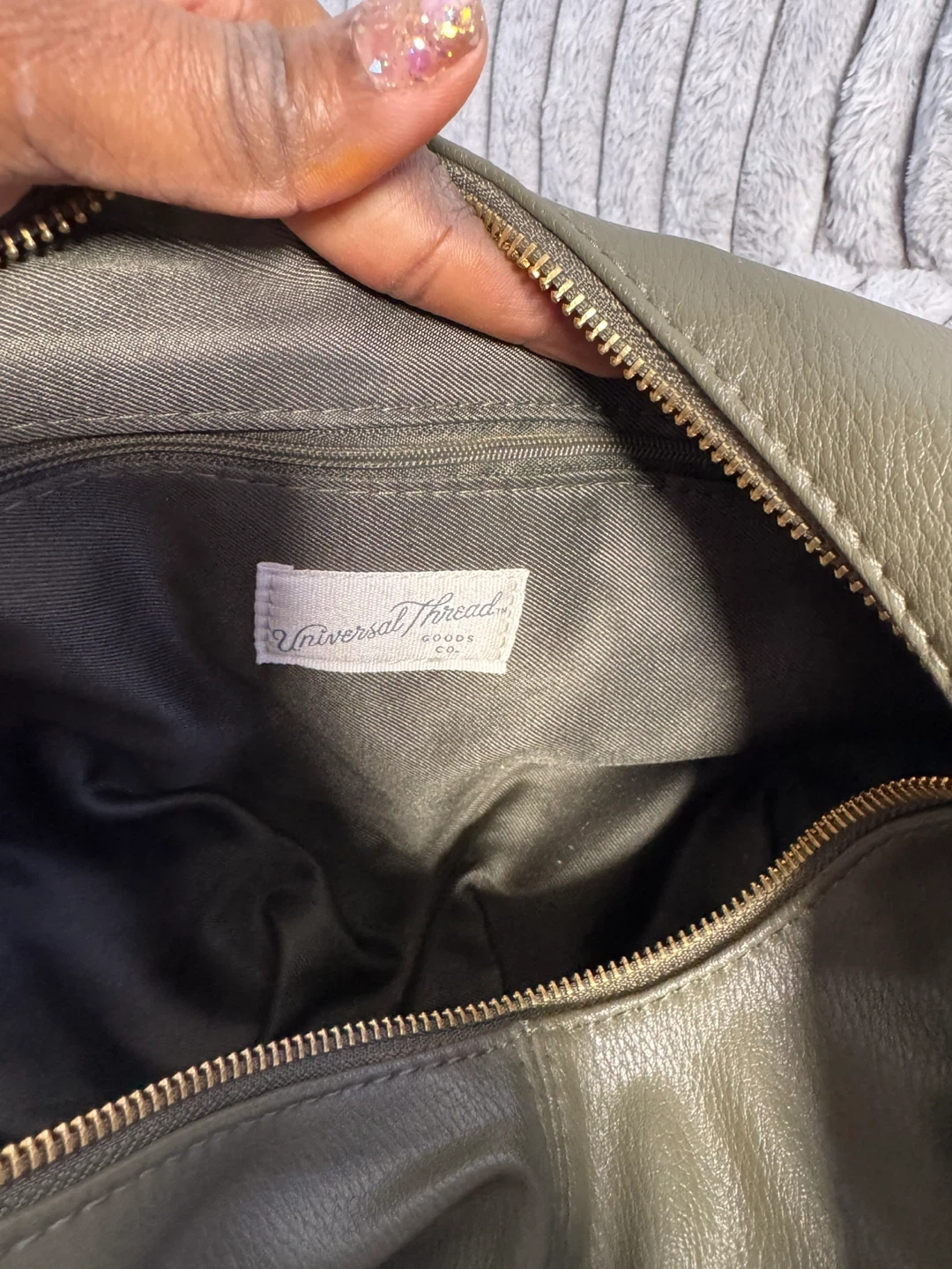 This is a Universal Thread women's hobo handbag. It's made of faux leather in an olive green color. The bag features a zippered closure and an adjustable strap. It's a stylish and practical accessory for everyday use!