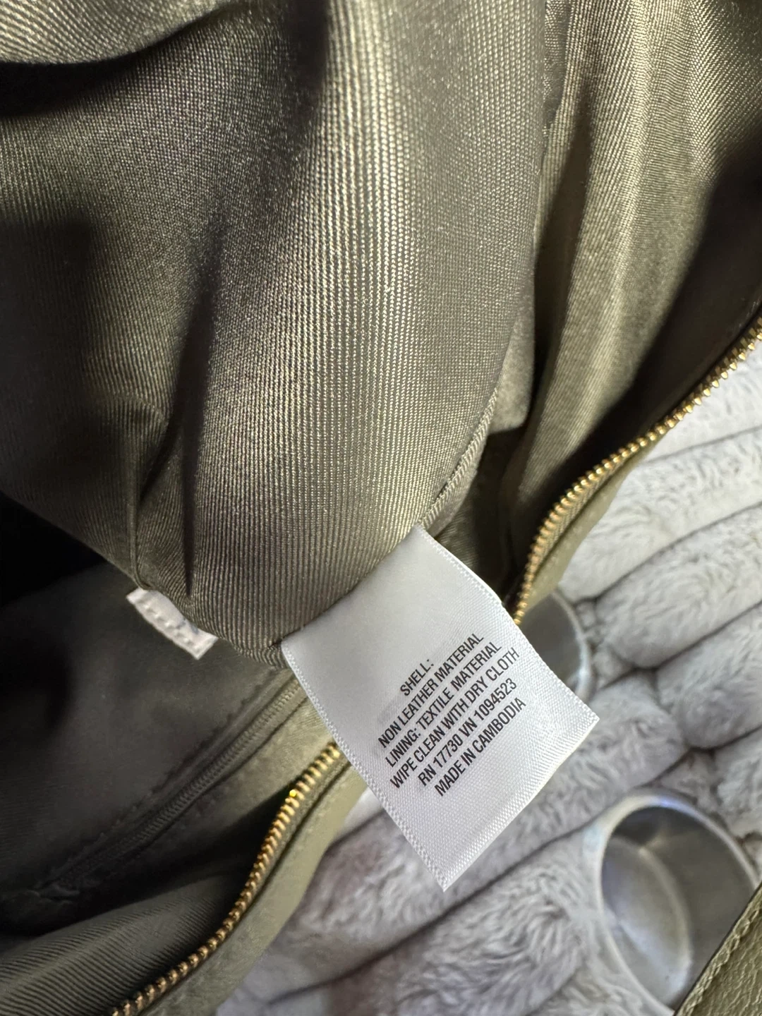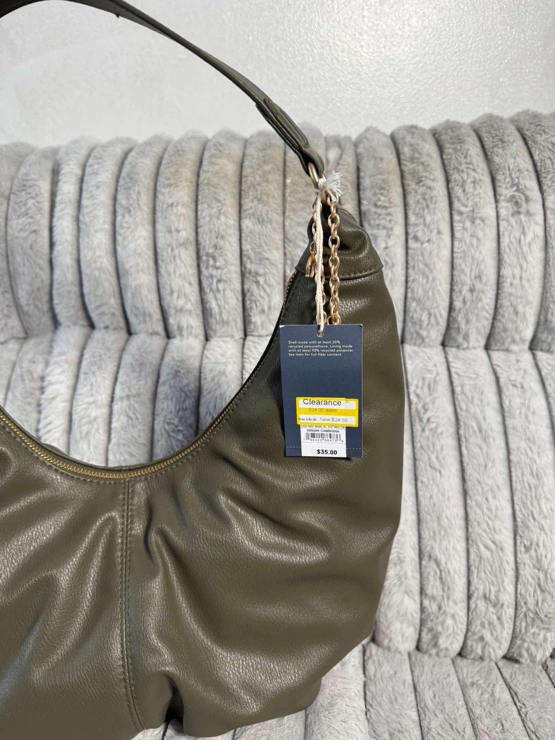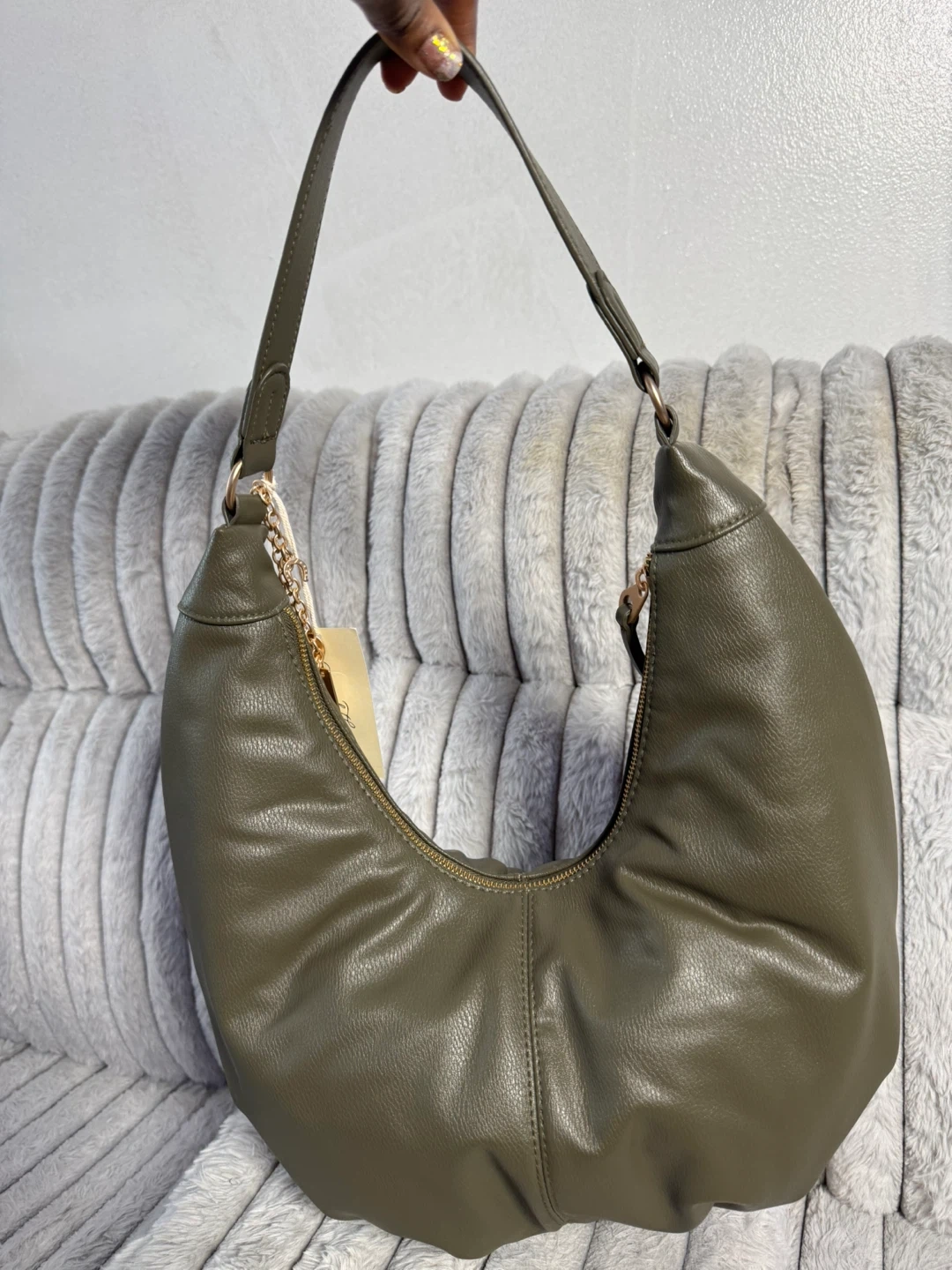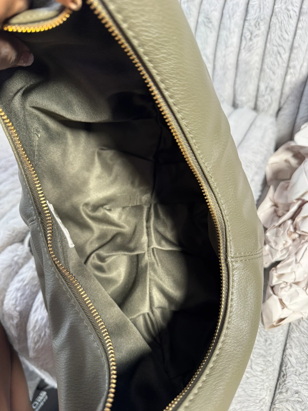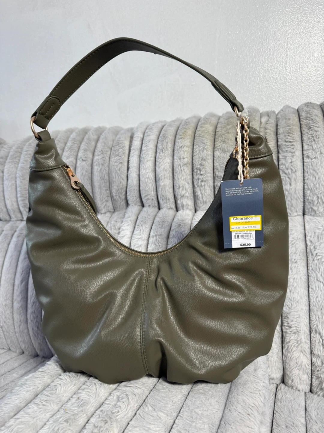 This is a Universal Thread women's hobo handbag. It's made of faux leather in an olive green color. The bag features a zippered closure and an adjustable strap. It's a stylish and practical accessory for everyday use!