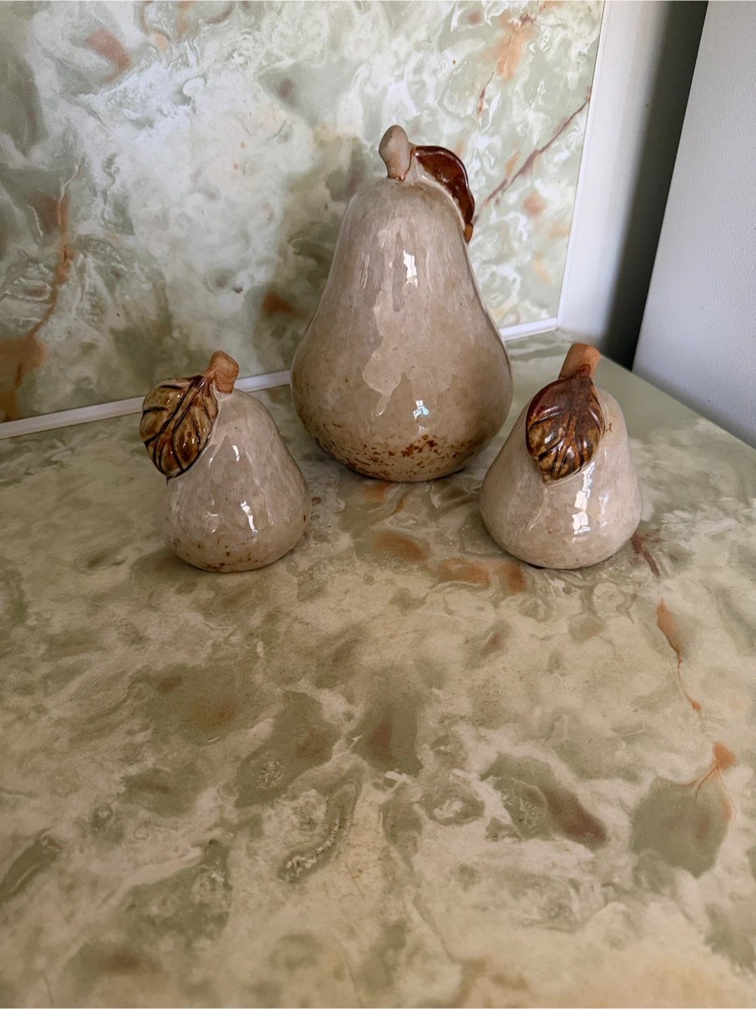 This is a set of three ceramic pears, perfect for adding a touch of charm to your home decor! They are in great condition and would look lovely on a shelf or table