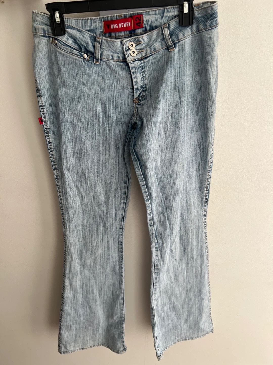 Selling a pair of Big Seven jeans in size 42. They're a light wash denim with a bit of a flare at the bottom. Great for a casual look! I also have other jeans in size 9 that haven’t been posted yet!” 👖✨