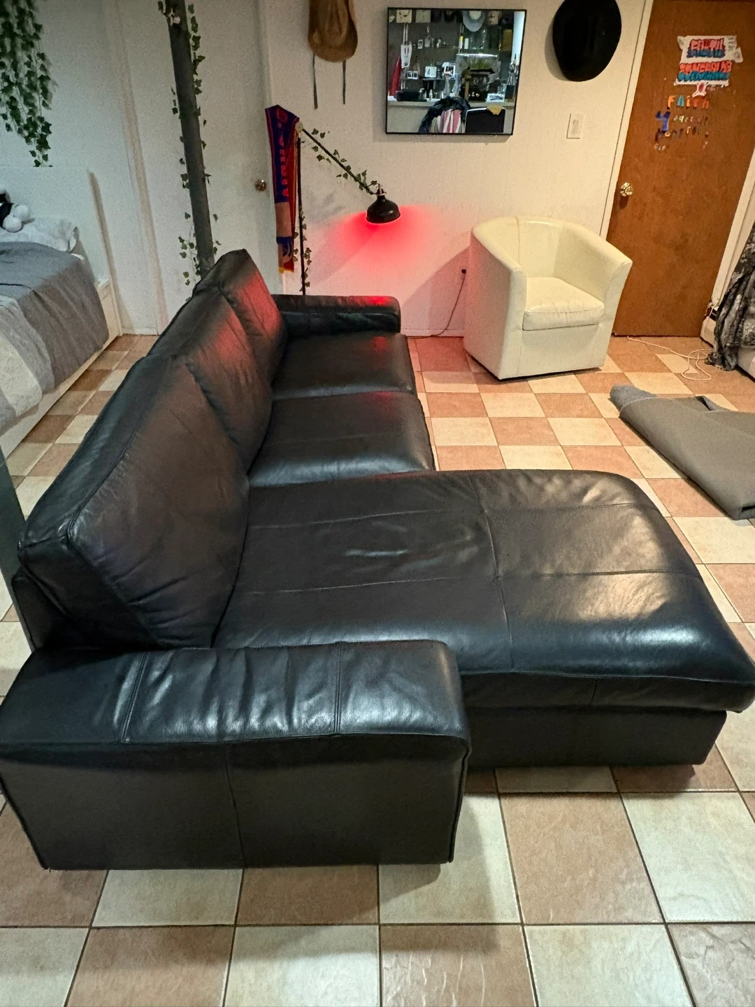 This is a black leather sectional sofa. It's a comfortable and stylish piece for your living space. The material is genuine leather.