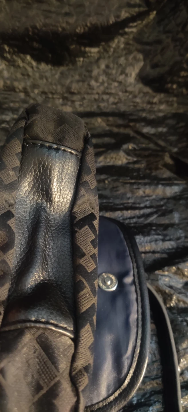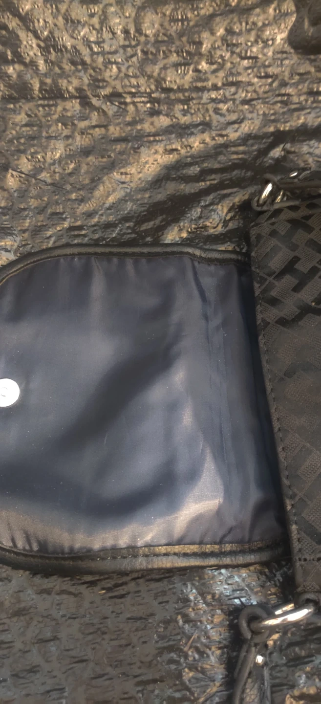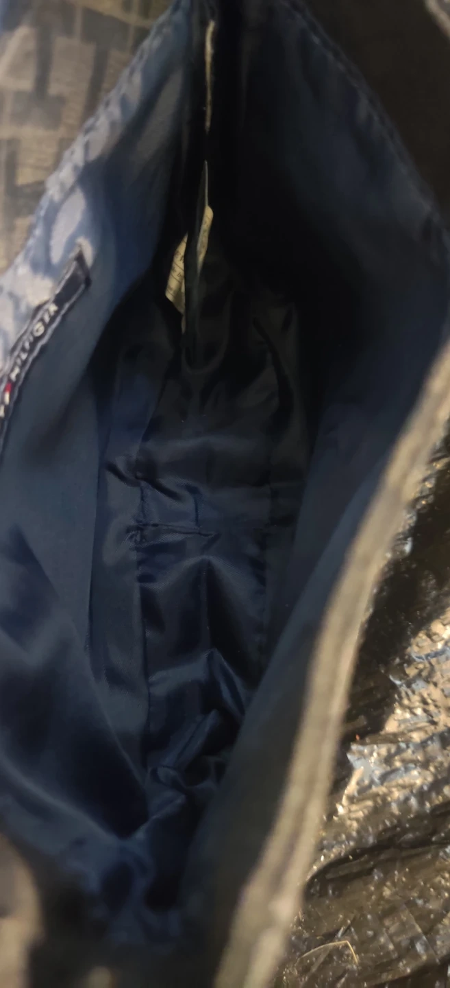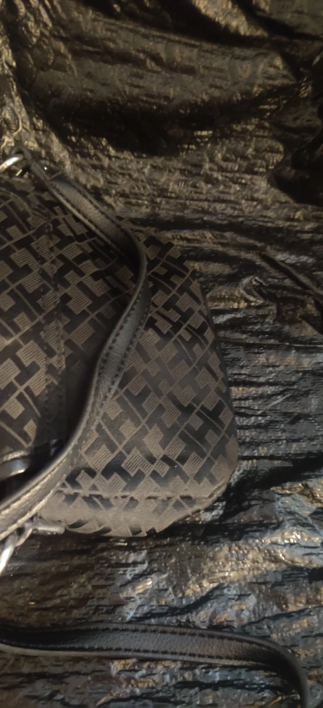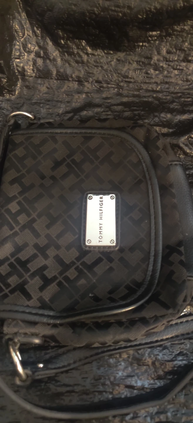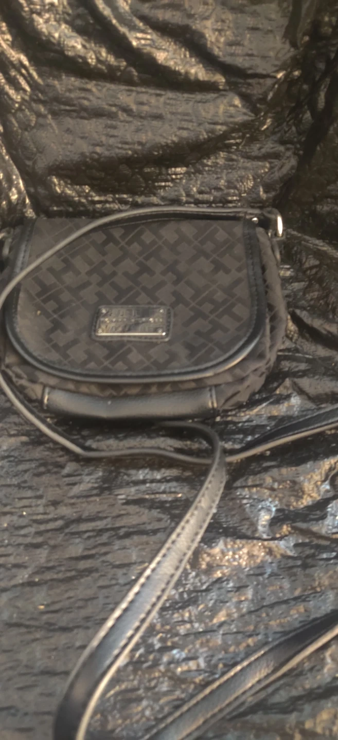 Tommy Hilfiger black monogram crossbody purse. It's a stylish and compact bag with an adjustable strap. Interior has a pocket for organization.Bag is small in size