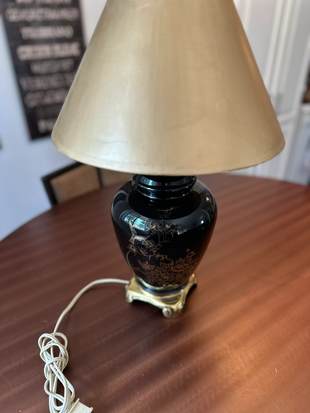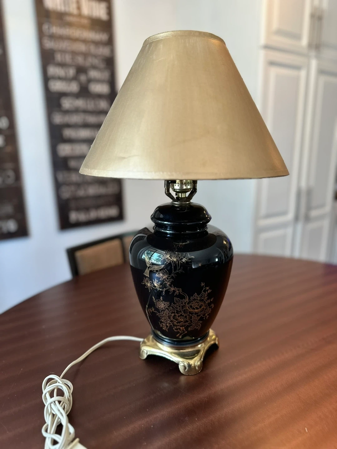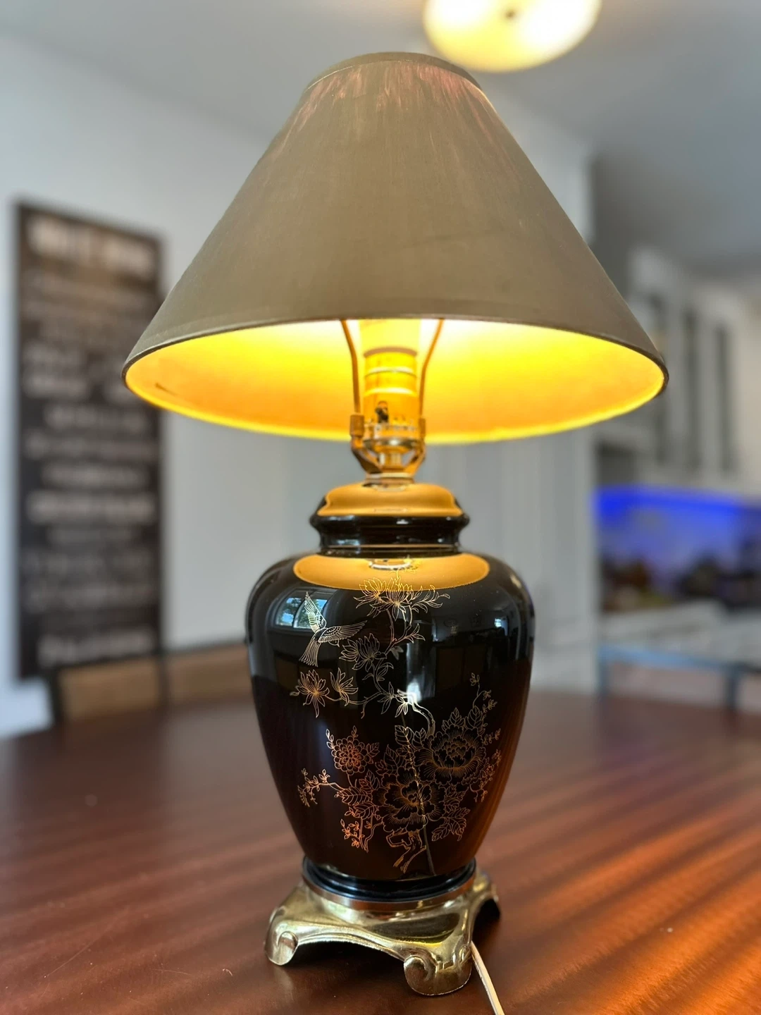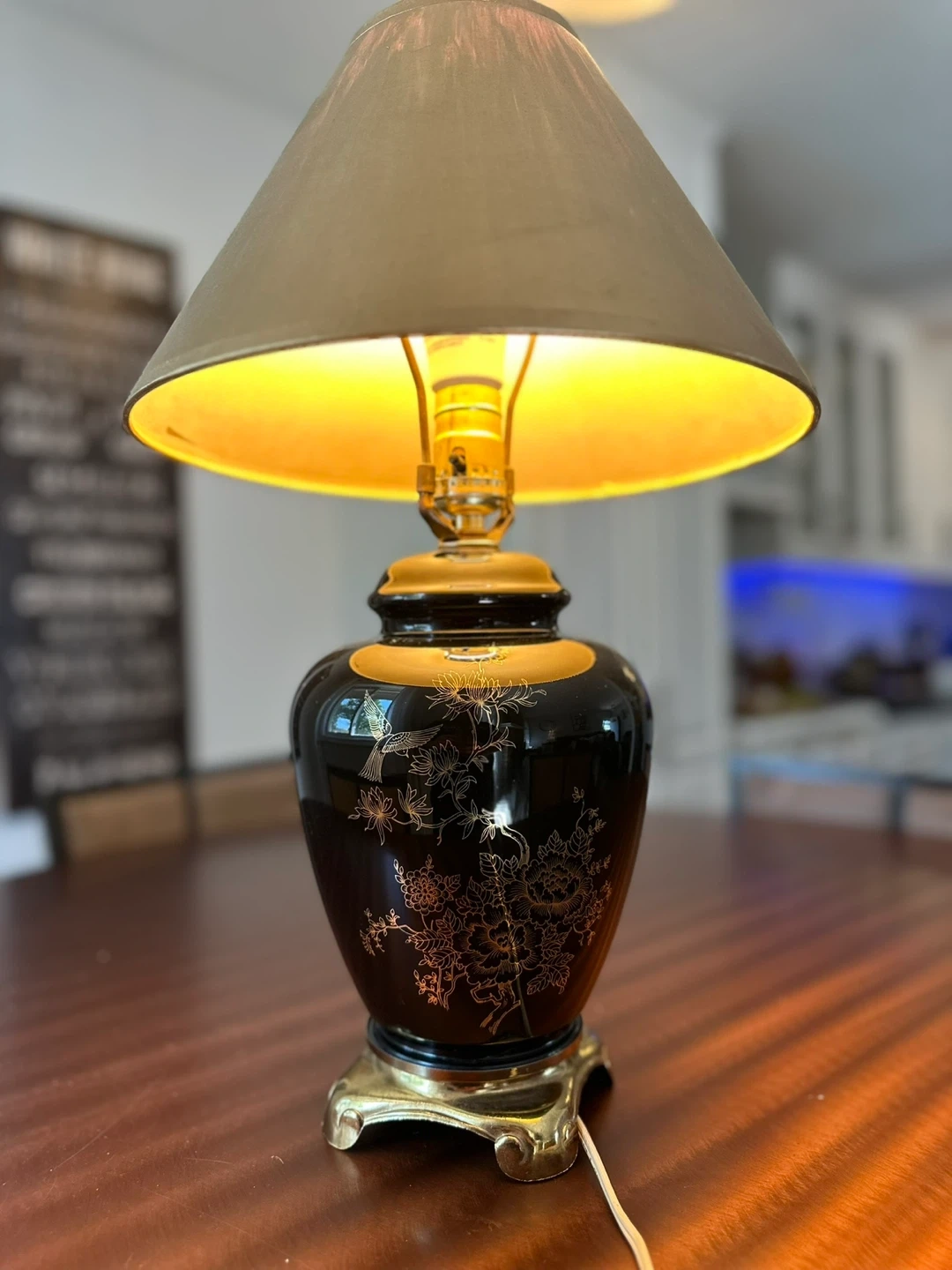 This is a vintage ceramic table lamp with a glossy black finish and a beautiful gold floral and bird motif. It has a gold-toned metal base and comes with a gold lampshade. This lamp would add a touch of classic elegance to any room.