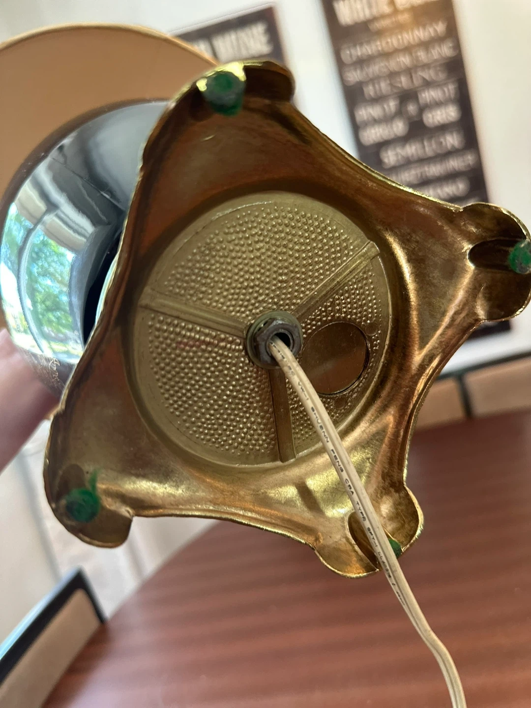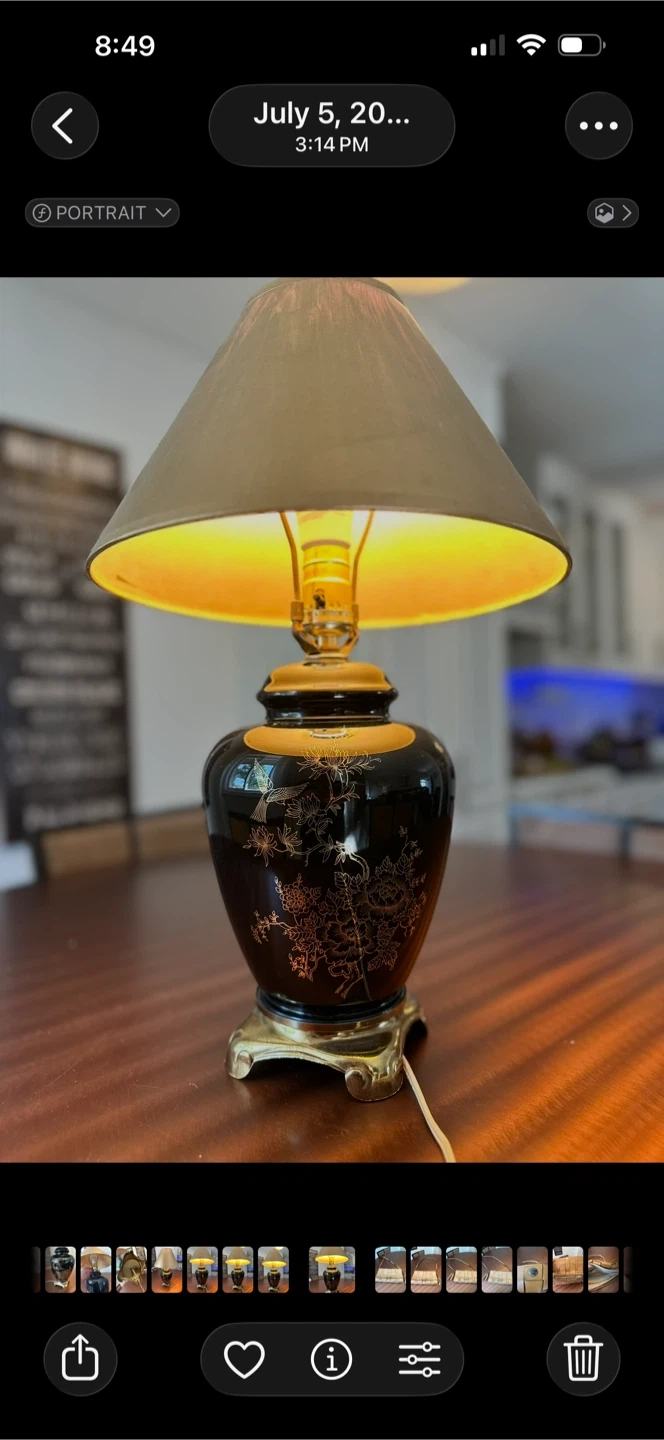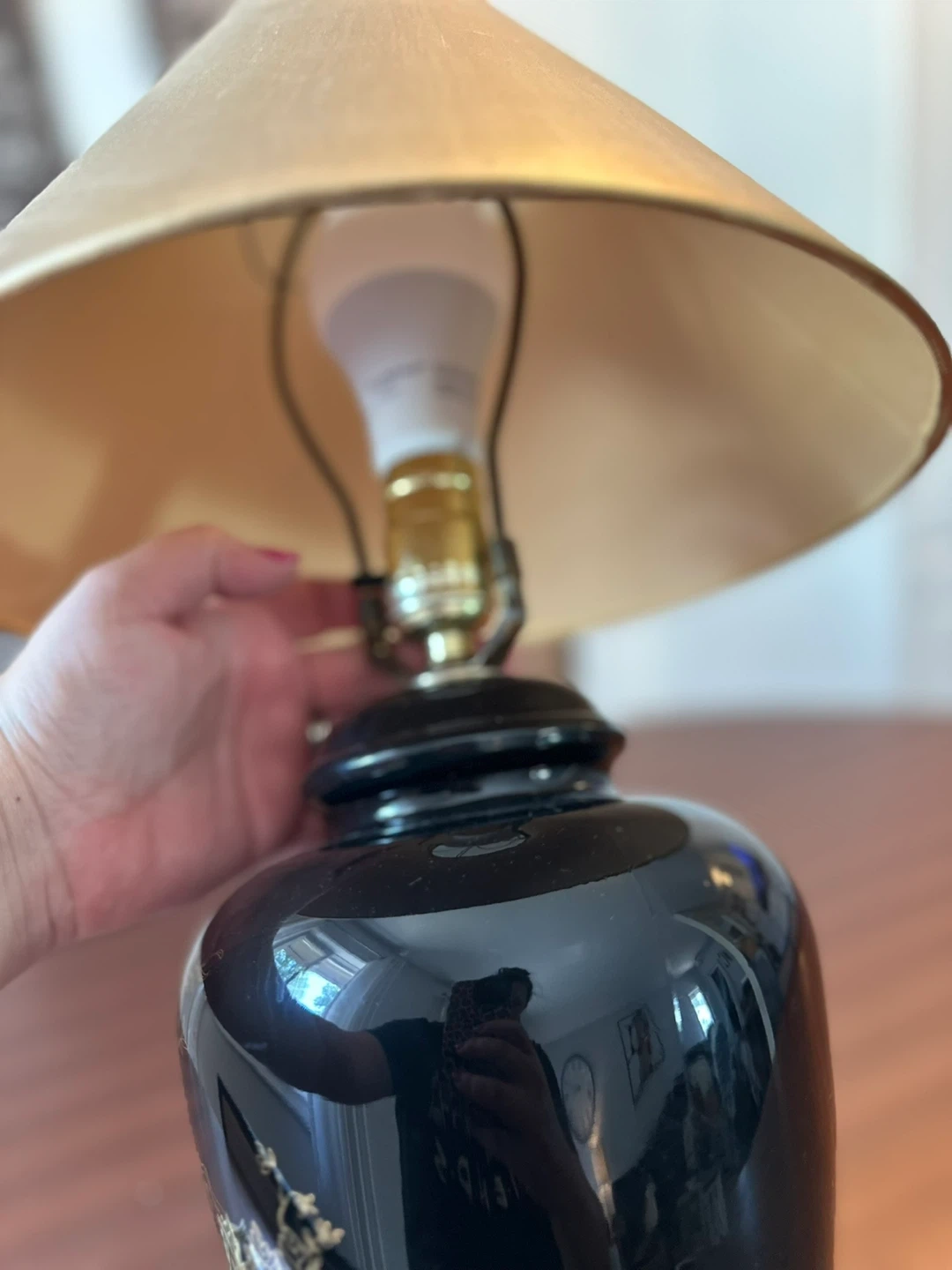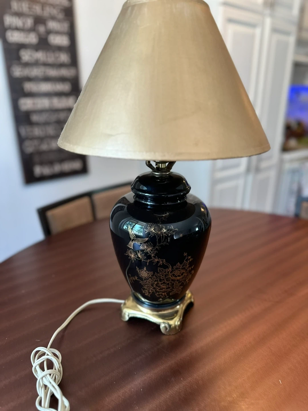 This is a vintage ceramic table lamp with a glossy black finish and a beautiful gold floral and bird motif. It has a gold-toned metal base and comes with a gold lampshade. This lamp would add a touch of classic elegance to any room.