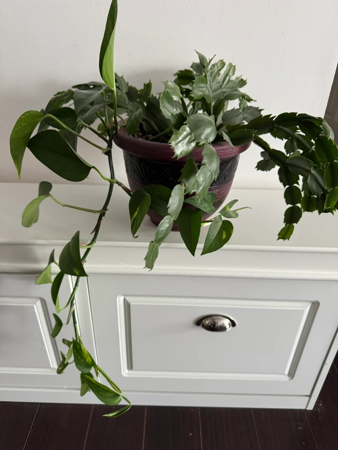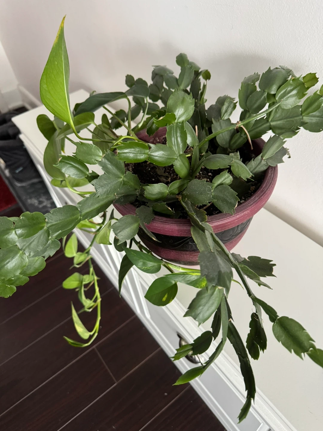 A healthy, established Christmas cactus with trailing vines, planted in a decorative pot. A Pothos plant is also growing in the same pot, adding to its lush appearance. It's a beautiful combination for any indoor space!