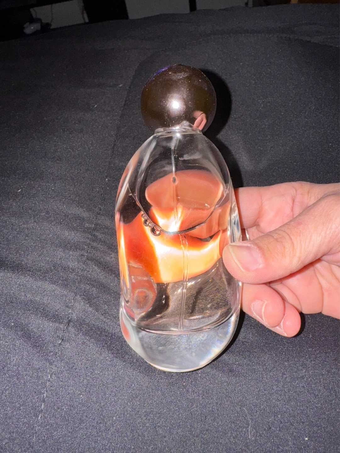 Clear glass perfume bottle with a dark spherical cap. It contains a pinkish-orange colored fragrance. Bottle is 5.5 inches tall. Perfect for displaying or refilling.