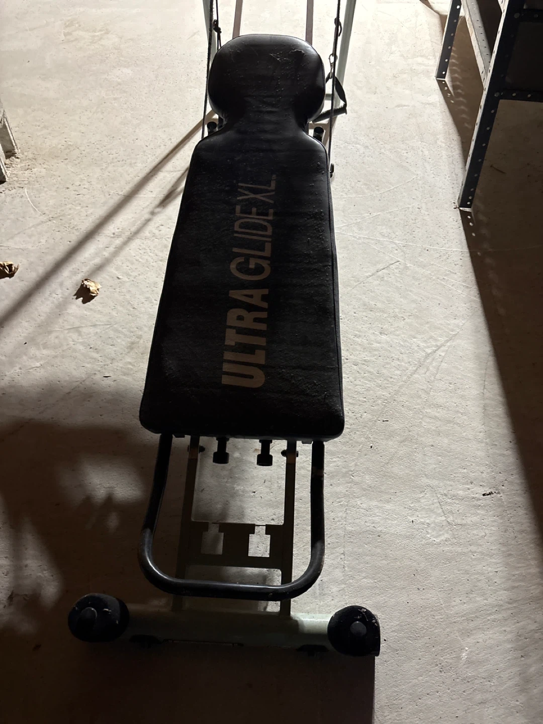 This is an Ultra Glide XL fitness bench. It's a black padded bench with a metal frame. Some dust is visible on the padding.