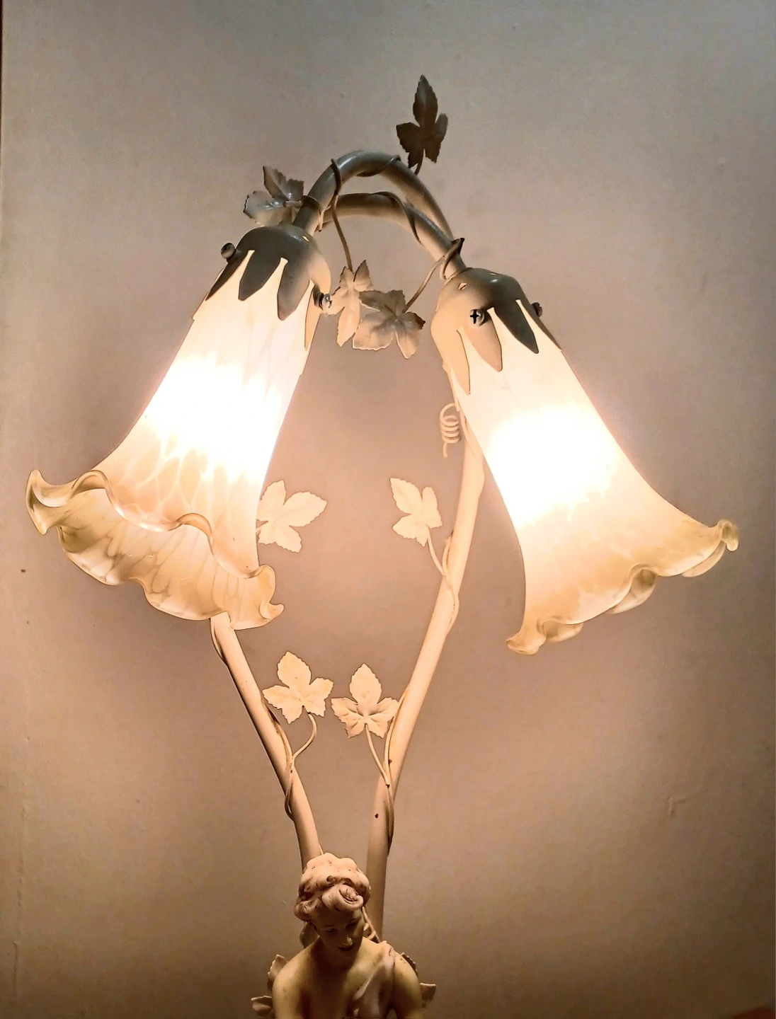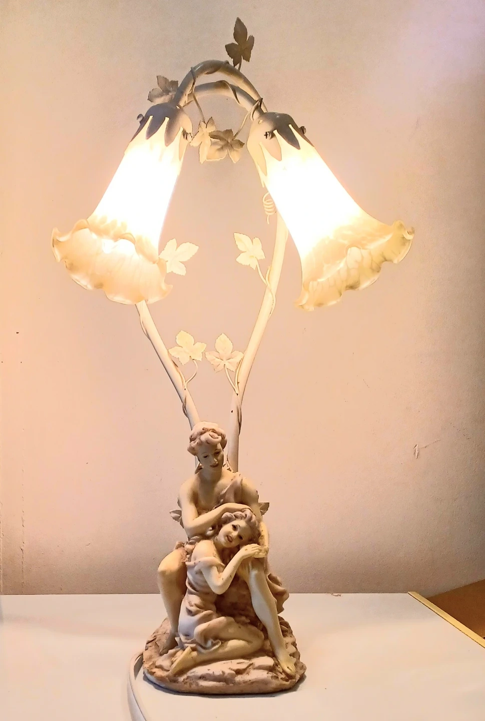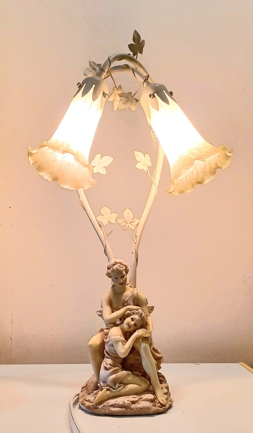 Elevate your living space with this enchanting table lamp, featuring a pair of flower-shaped shades perched above a serene couple, bringing a touch of romance and soft, ambient light to any room.
