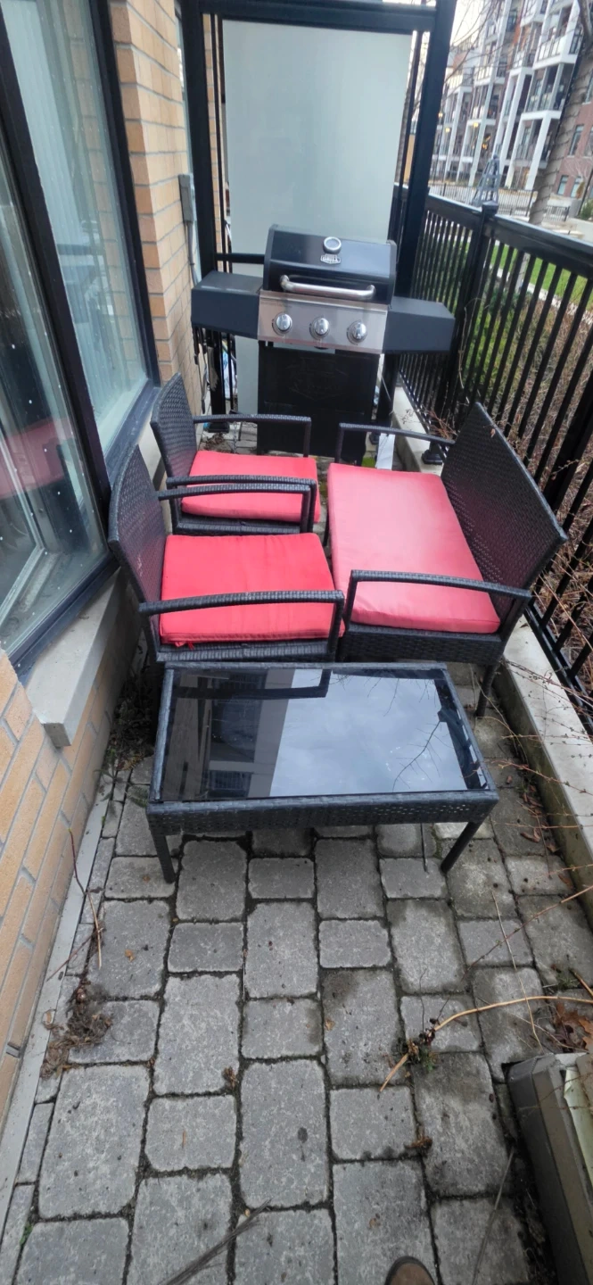 This patio furniture set includes two chairs, a sofa, and a coffee table. The pieces are made with a dark wicker-style material and come with red cushions. Perfect for small outdoor spaces! No rips or tares