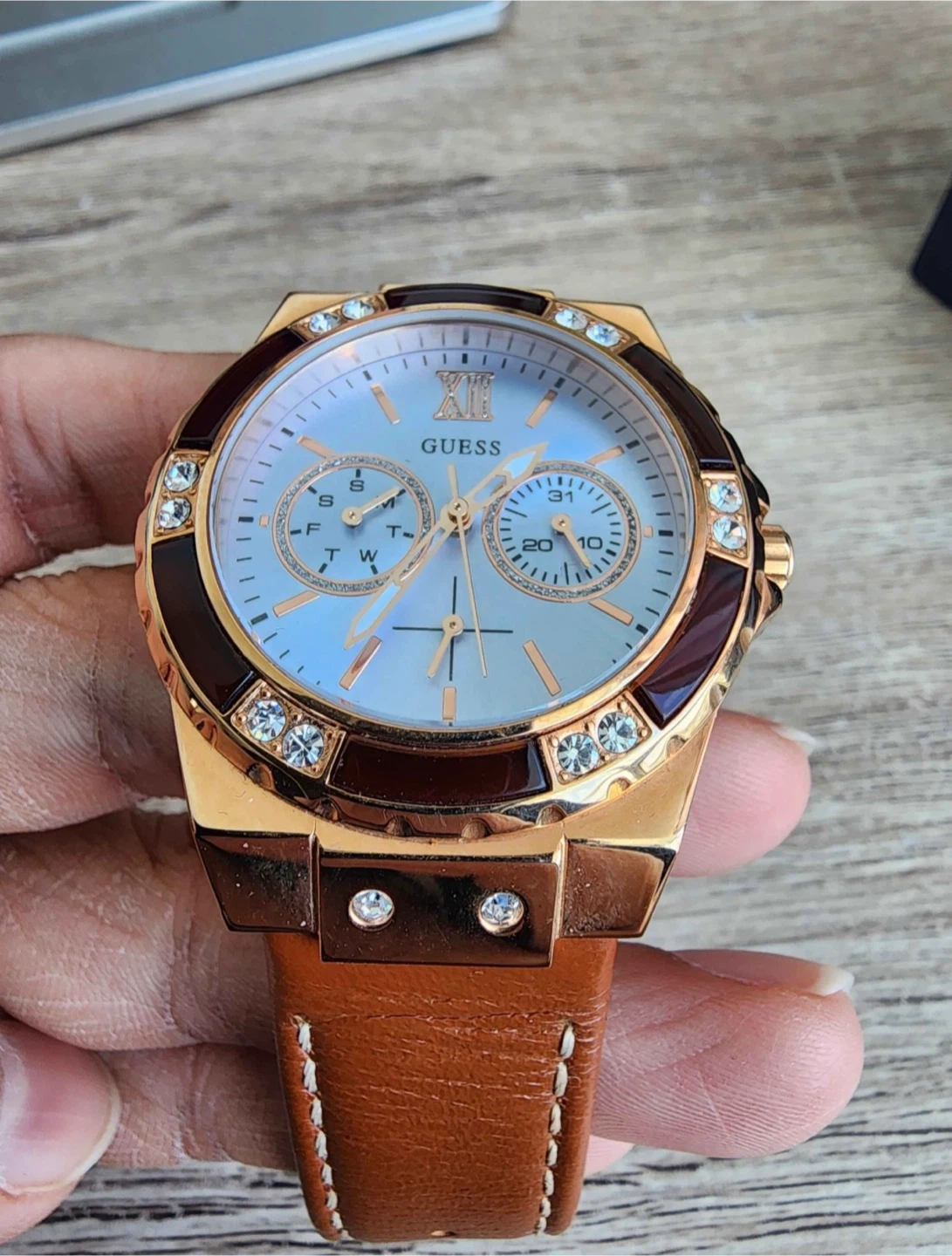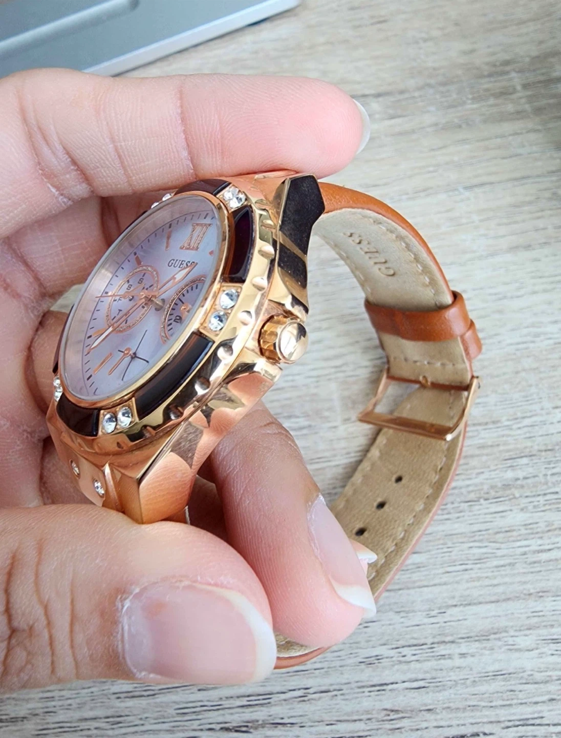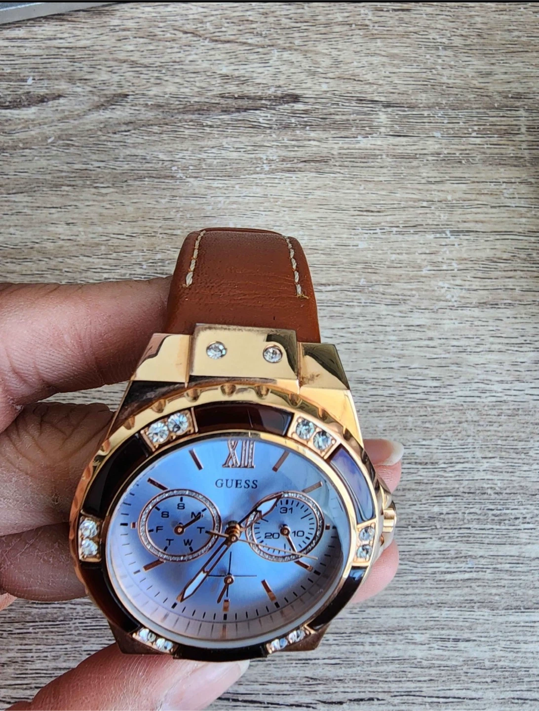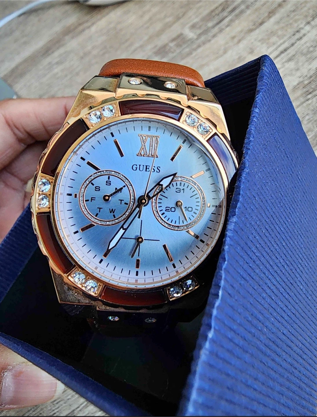 This GUESS watch features a rose gold-tone case and a light blue dial with crystal accents. It has a brown leather strap and subdials for day, date, and 24-hour functions. It comes with its original box. Perfect for adding a touch of sparkle to any outfit!