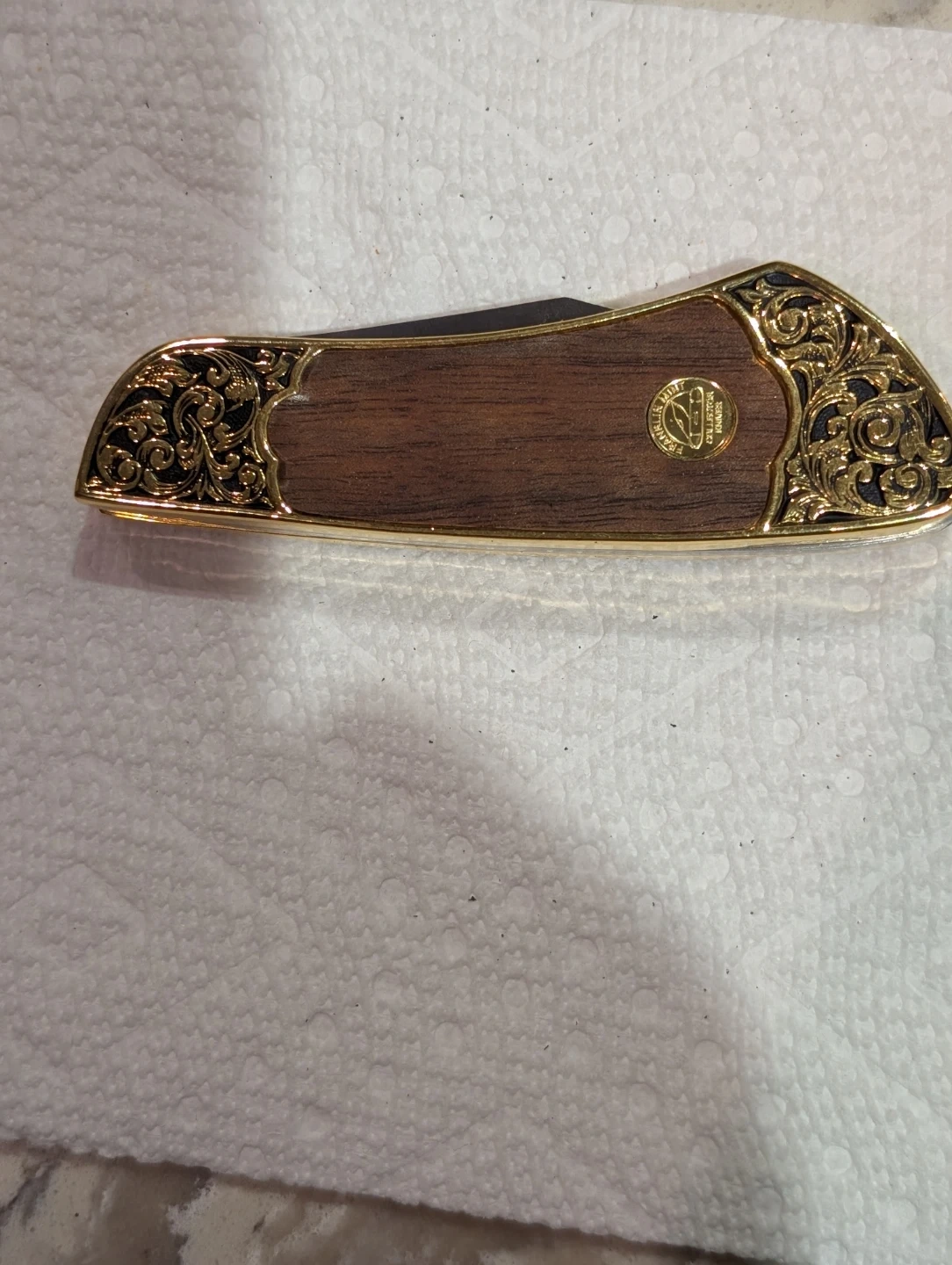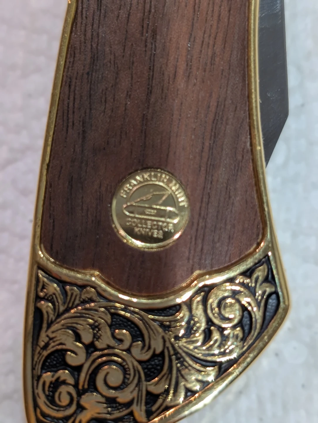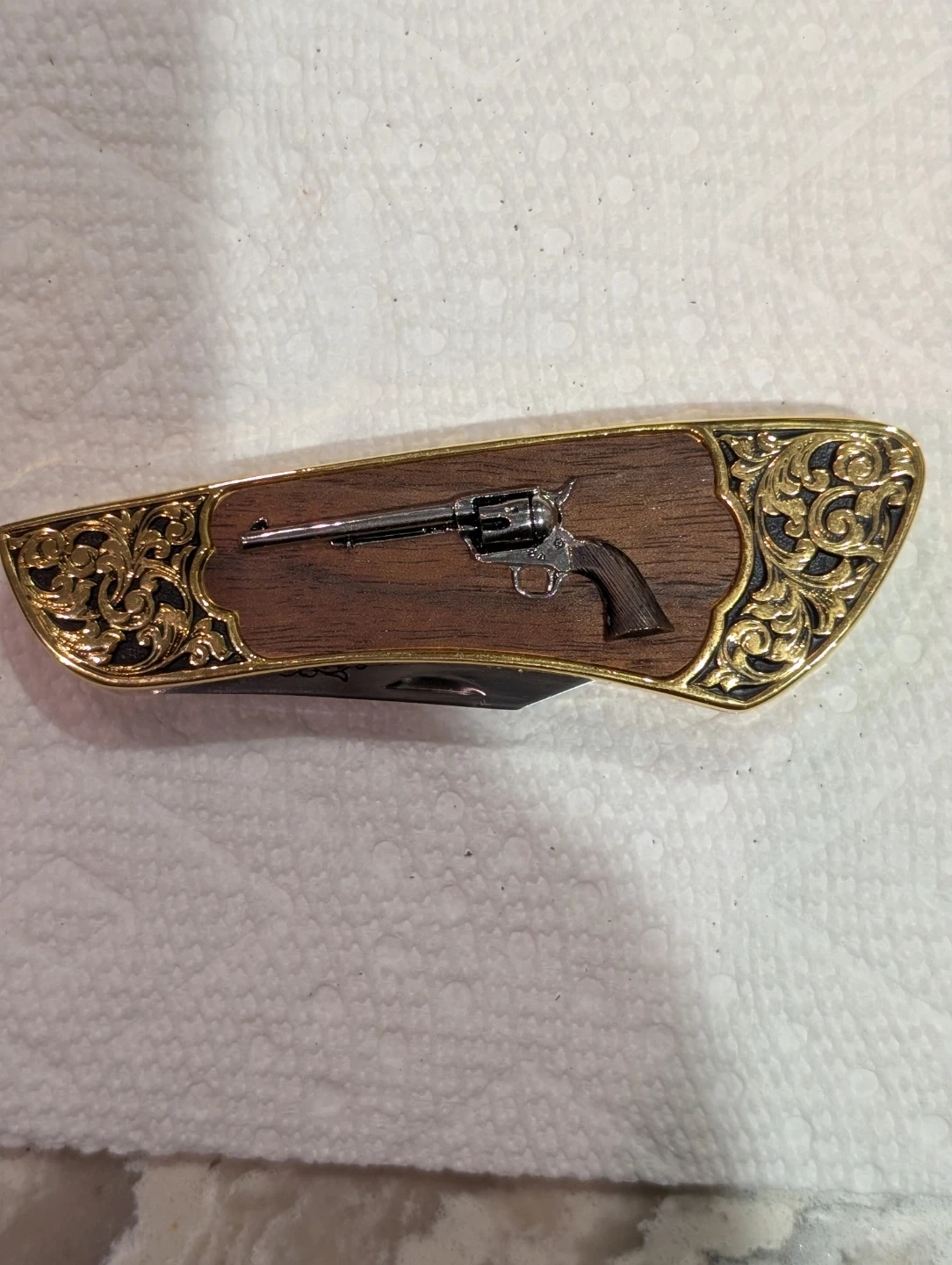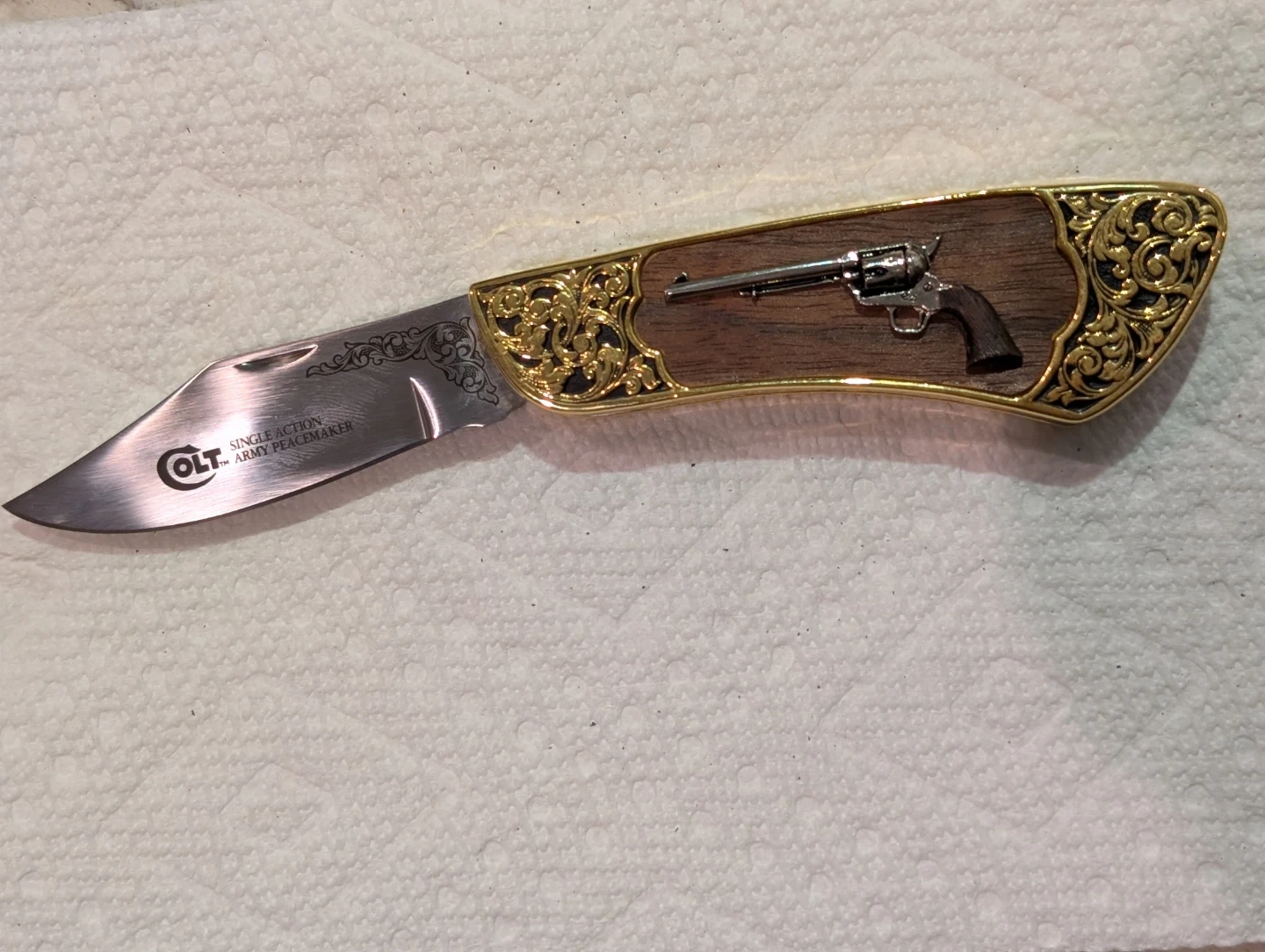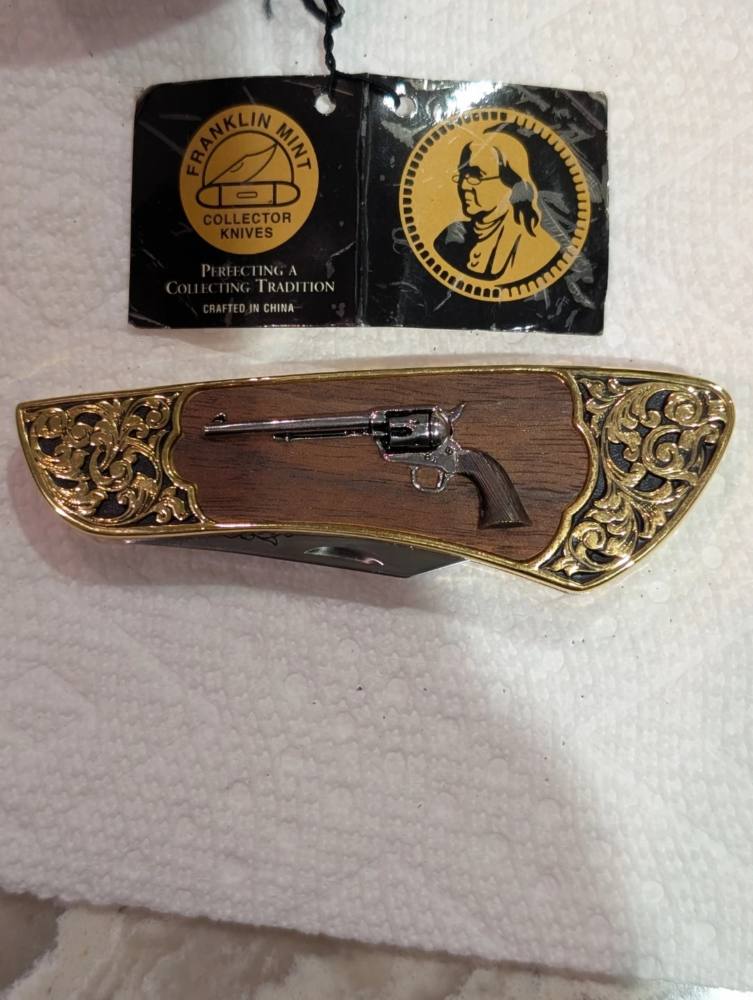 Selling a Vintage Franklin Mint Collector Knives pocket knife! It features a Colt Single Action Army Peacemaker design. The handle is wood with brass accents and a revolver design on the handle.