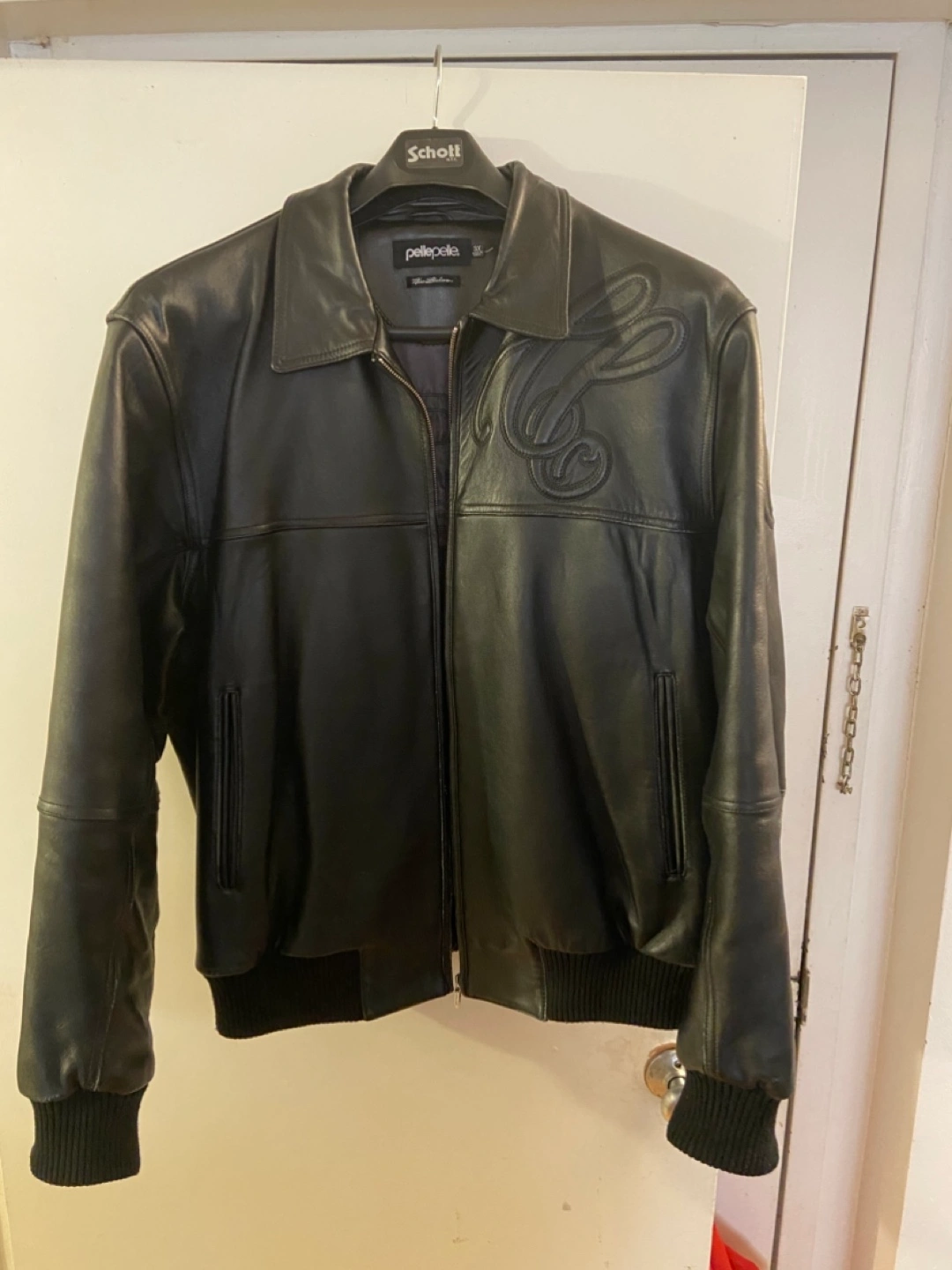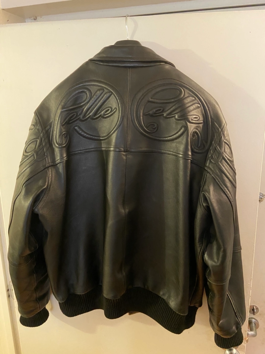 This is a black Pelle Pelle leather bomber jacket. It's made of genuine leather with embroidered details on the front and back. The jacket features a zip-up closure and ribbed cuffs and hem. It's a stylish outerwear piece.