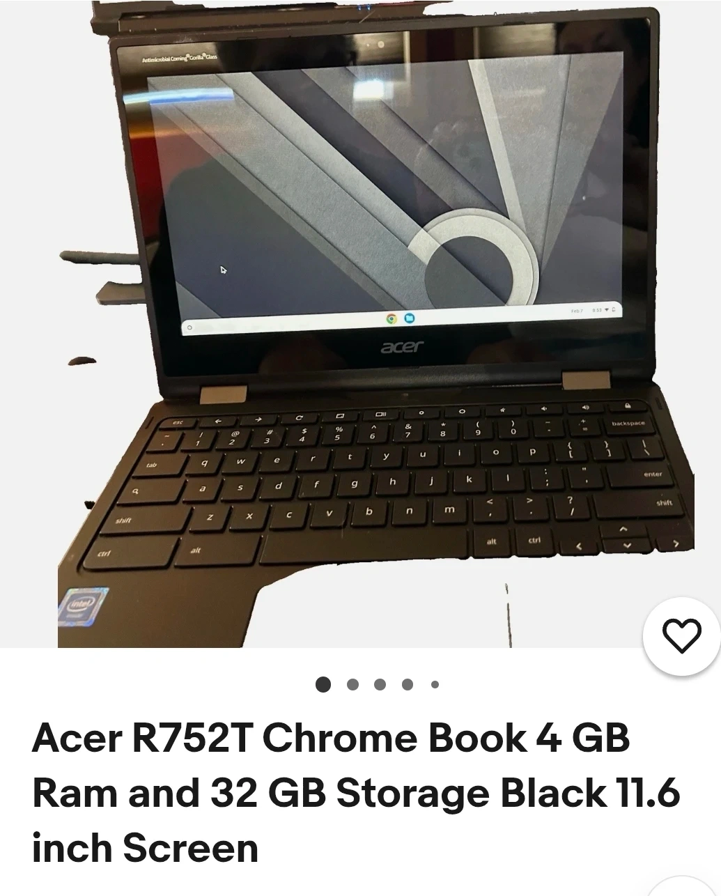 Acer R752T Chromebook with 4 GB RAM and 32 GB storage. It features a 11.6-inch screen. The device is black. Antimicrobial Corning Gorilla Glass is present. It's ideal for everyday tasks.